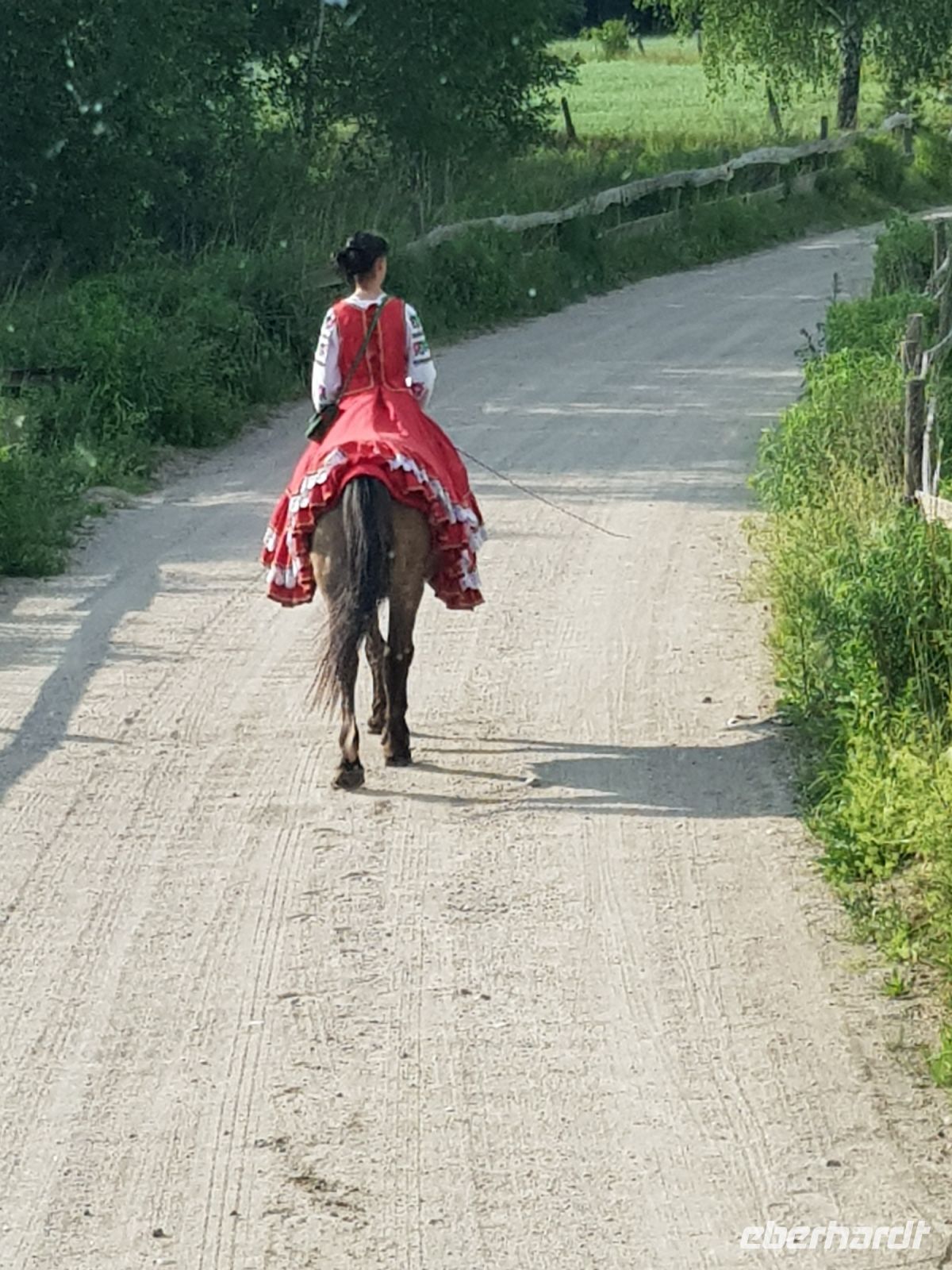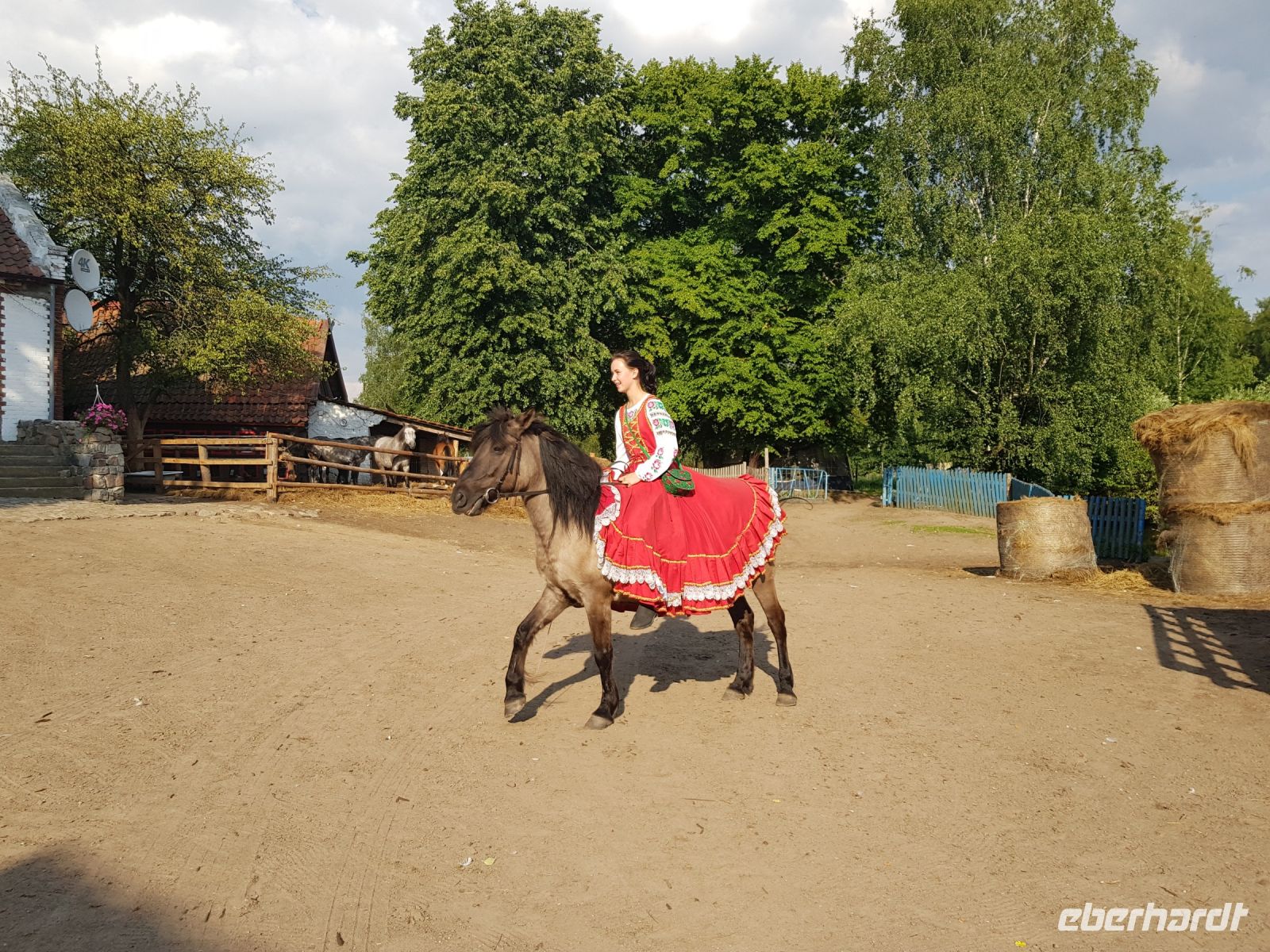 Nach dem Frühstück checken wir aus, weil es heute in Richtung Masuren geht. Insgesamt werden wir heute 350 km fahren. Als ersten Höhepunkt erleben wir eine 2-stündige Fahrt mit einem kleinen Schiff nur für uns und 4 Gäste aus USA. Wir werden von der Bootsführerin abgeholt und los geht es! Wir sind mittendrin in der Natur und es ist stressfrei, weil alles passt - auch die Mütze vom Kapitän. Aber das ist eine andere Geschichte. Nach einer kurzen Busfahrt nach Allenstein ( Olsztyn) haben wir dort noch eine kurze Stadtführung, bevor es Richtung Bauernhof geht. Ausserhalb der Stadt erwartet uns eine erste Überraschung: eine junge Reiterin in Volkstracht auf einem Pferd holt uns ab und geleitet den Bus über Feld-und Wiesenwege bis zum Bauernhof. Und hier geht es gleich los: Empfang mit Wodka, Musik und Tanz reichlich Essen und Trinken auch. Und immer wieder spielt die Musik auf. Etwas später kommt eine Gruppe junger polnischer Studenten oder Auszubildender und die eigentliche Hochzeit kann beginnen. Es werden 2 Paare ausgesucht, hochzeitlich mit Blumenkränzen geschmückt und diese dürfen unter dem Beifall der Zuschauer bei Spielen zeigen, was sie können. Irgendwann tanzen und spielen auch die anderen Gäste mit und irgendwann am Abend fährt uns der Bus zu unserem Hotel in den Masuren.
