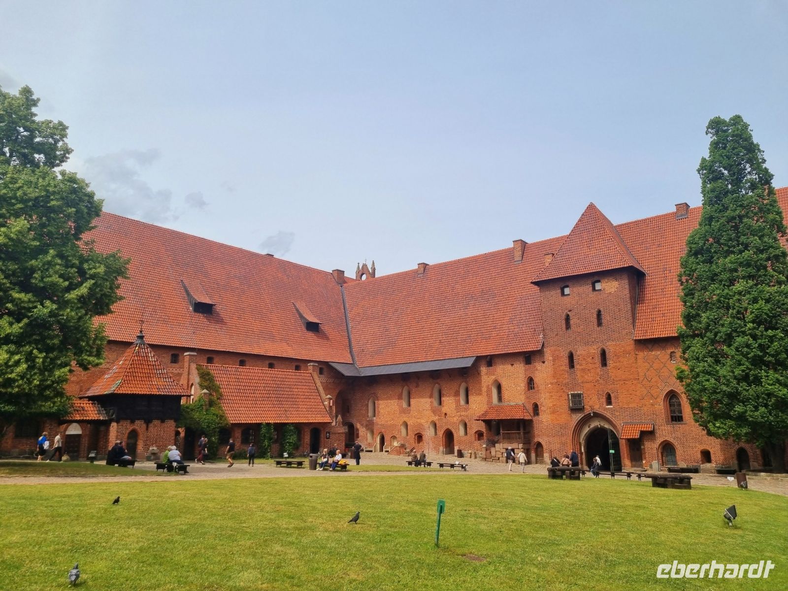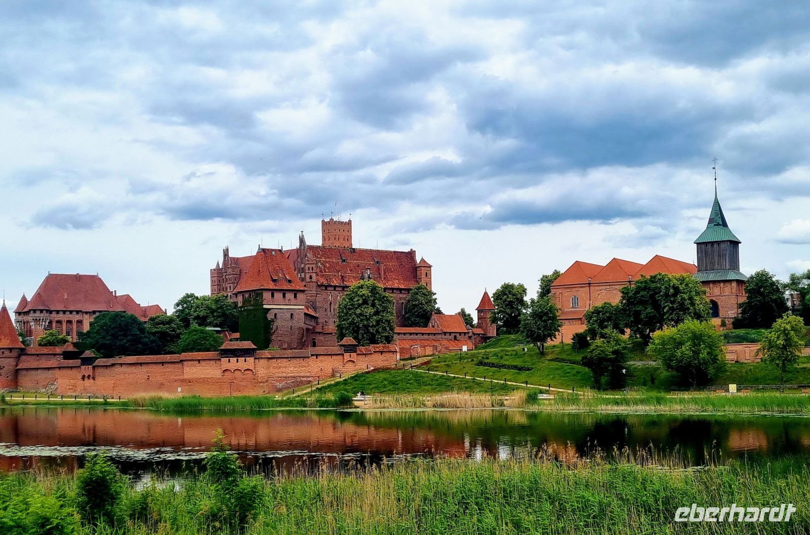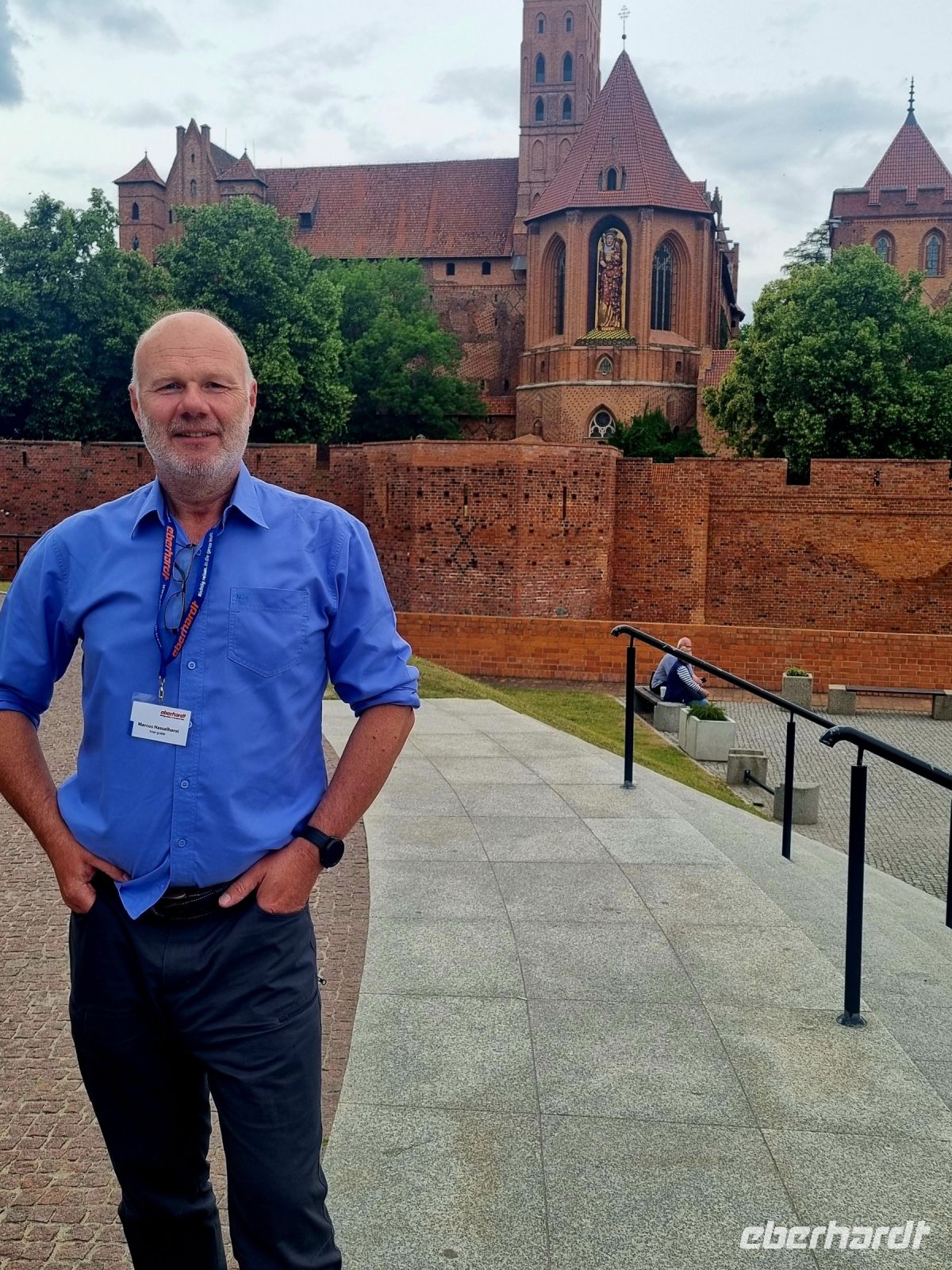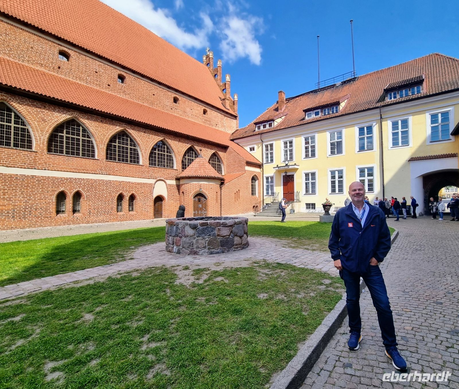 Bei schönstem Sonnenschein checken wir nach dem Frühstück aus dem Hotel in Sensburg aus und machen uns auf den Weg um die 250 km nach Malbork in Angriff zu nehmen. Hier wollen wir die mächtige Ordensburg der Kreuzritter an der Nogat besichtigen. Die monumentale Festung mit Vorburg, Mittelschloss und Hochburg beherrscht das Stadtbild. Die imposante Anlage aus rotem Backstein gilt heute als die größte mittelalterliche Festung in Europa, gesichert durch mächtige Wallanlagen. Wegen zu erwartender Staus geht es 30 min früher los. Die Fahrt nutze ich, um das Wissen der Mitreisenden abzufragen, das Quiz hatte durchaus einige anspruchsvolle Fragen , aber 5 Mitspieler hatten es ins Stechen geschafft. Belohnt wurde am Ende Frau B. mit einem leckeren polnischen Pralinenkasten. So haben wir am Ende ein sehr gutes Timing , um 12.30 Uhr sind wir auf dem Parkplatz der Marienburg. Thomas sorgt fürs leibliche wohl und ich mache mich auf den Weg, um die modernen Audioguides zu besorgen , mit der jeder Gast seine ganz individuelle Tour durch die Burg genießen kann. Ich komme gerade rechtzeitig zum Bus um auch noch eine Köstlichkeit der polnischen Pralinen zu genießen. Im Laufe der Jahrhunderte wurde die Marienburg mehrmals zerstört und geplündert, aber immer wieder aufgebaut und vergrößert. Über 130 Jahre war die Burg Sitz der Hochmeister des Deutschen Ordens. Dieses Meisterwerk der spätgotischen Baukunst zählt seit 1997 zum UNESCO-Weltkulturerbe. Der Wiederaufbau der Burg nach dem Zweiten Weltkrieg hat zu einem tollen Ergebnis geführt und die Führung mit dem Audioguide , ist ein tolles Erlebnis und die wenigen skeptischen Stimmen am Anfang waren bei der Abfahrt ins Gegenteil gekehrt. Wir nutzen noch die Chance eines Fotostopps auf der anderen Uferseite des Nogats um die Marienburg in voller Größe zu fotografieren. Die Weiterfahrt nach Danzig gestaltet sich problemlos. Wir sind pünktlich in Danzig und die ersten Gäste reisen ab . Wir erfreuen uns am letzten gemeinsamen Abendessen , die Stimmung ist super und ich kann noch einige Tips geben, wo man das eine oder andere, zb. Goldwasser besorgen kann. Wir verabschieden dann noch weitere Gäste, die eine individuelle Abreise aus Danzig haben und nicht die Busheimreise antreten.