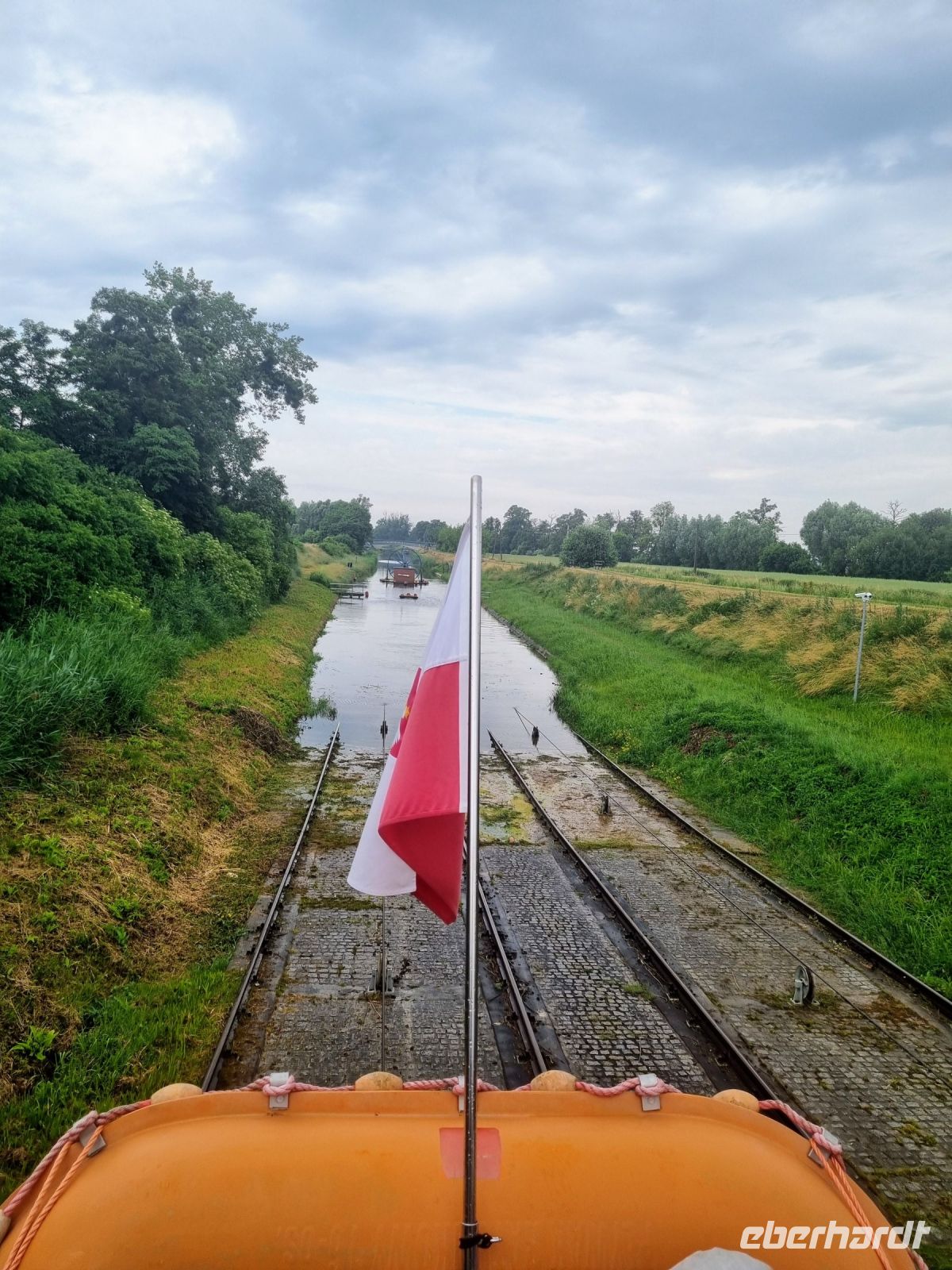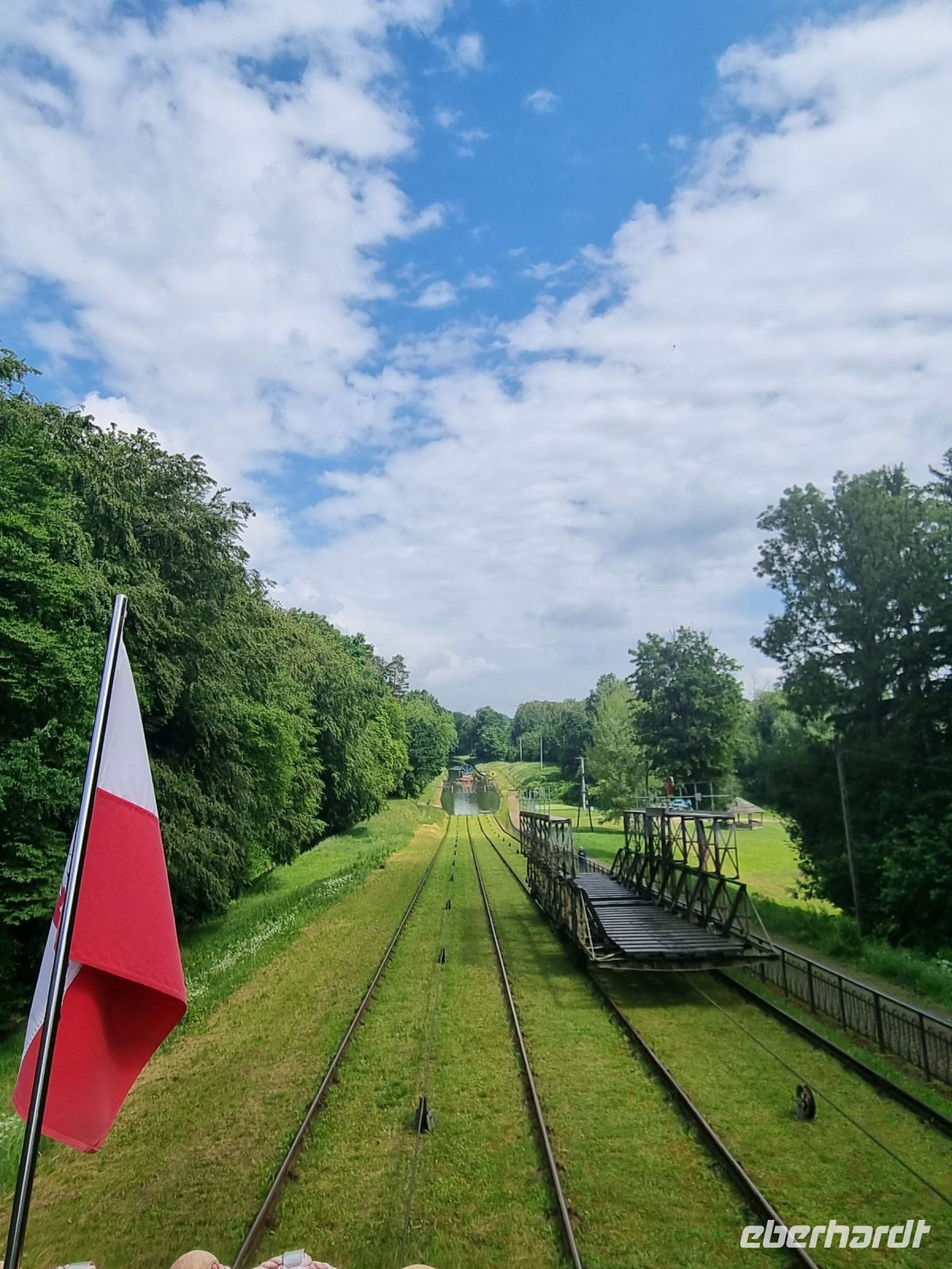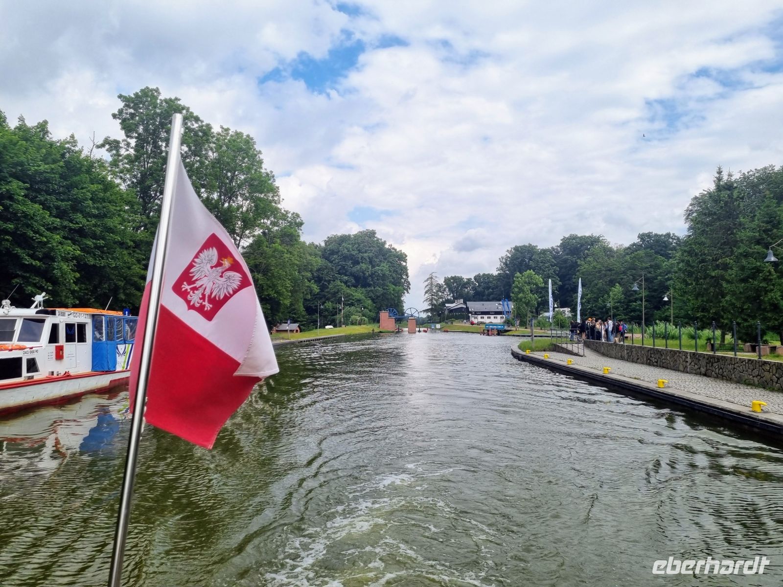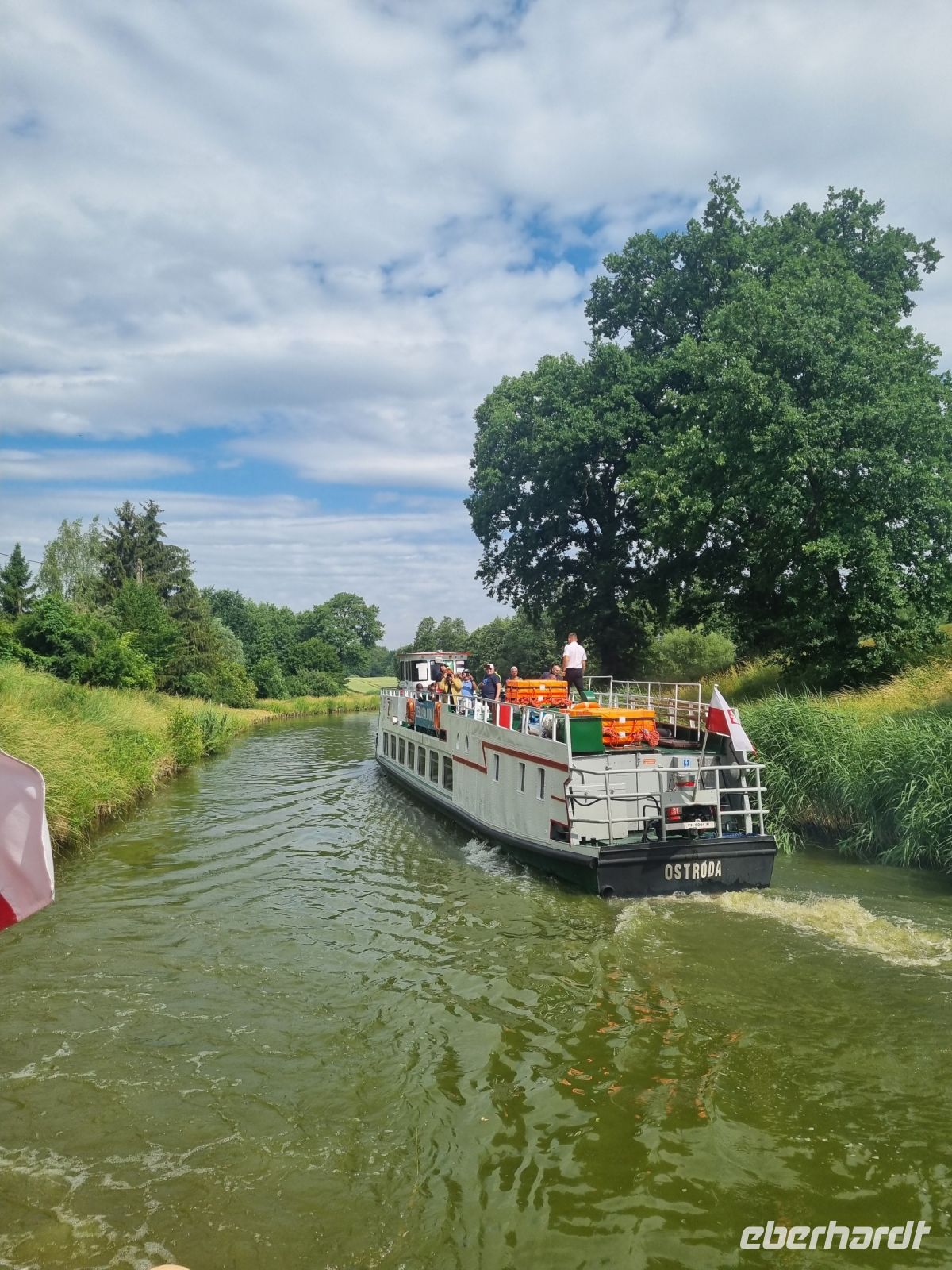 Nach dem Frühstück checken wir aus und fahren ins ca 100 km entfernte Jelonki. Über Nacht hatte es geregnet und auch auf der Fahrt wollen sich die Regenwolken nicht verziehen. Wir erreichen bei leichtem Nieseln den Schiffsanleger , können aber schon erahnen , dass es in Kürze aufklaren wird. Wir haben ein Schiff ganz für uns und nachdem alle Platz genommen haben , beginnt auch schon der erste Anstieg auf einen Rollberg, alle Steigungen überwinden zwischen 20 und 25 m dabei. Beata die "Kapitänsfrau" unterhält uns mit lustigen Kommentaren und erzählt alles Wissenswerte zu diesem Technischen Unikum. Außerdem werden Snacks und Getränke angeboten. Insgesamt hebt sich unser Schiff auf seinem Rollwagen gleich über 5 Berge und wunderschönen wildromantische Kanalabschnitte werden durchfahren . Wildschweine und Störche mitten im Wald werden gesichtet. Am Anleger erwartet uns der Bus und ich lasse es mir nicht nehmen alle Schiffspassagiere zu einer Kanaltaufe einzuladen , Goldwasser wird ausgeschenkt und wir prosten uns zu auf dieses tolle Erlebnis zu. Nachschlag gibt es dann auch noch. So gut gelaunt geht es dann weiter Richtung Olstyn, da wir sehr zeitig sind haben wir eine Mittagspause in einem typisch polnischen Lokal eingeplant . Essen kann man sich an der Bedienungstheke selbst aussuchen, ich erkläre die Gerichte, helfe bei der Bestellung und nicht wenige sind überrascht über das qualitativ sehr gute Essen. Allen hat es fantastisch geschmeckt und so gestärkt starten wir unsere Stadtbesichtigung in Olstyn mit Besuch der Kirche St.Jakob, dem Marktplatz , der Burg , der Stadttore und dem Denkmal für den wichtigsten Sohn der Stadt , Kopernikus. Nach dem Stadtrundgang geht es dann nach Sensburg in unser Hotel Huszcza direkt am Czos See. Nach Check In und kurzer Pause geht es dann zum Abendessen, der Hoteldirektor begrüßt uns mit einem Schnäpschen und wir lernen , die Suppe kommt immer direkt aus der Vase auf den Tisch , So zumindest seine eigenen Worte.