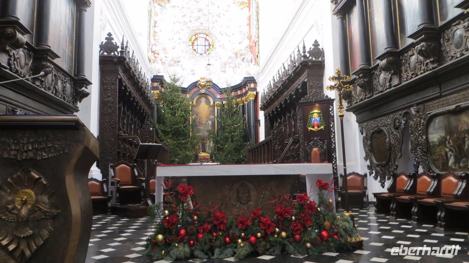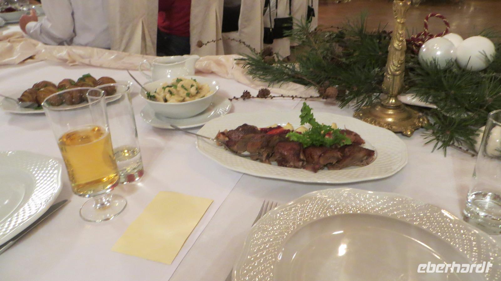 Nach einem leckeren Frühstück fuhren wir in die Kaschubei. Bolek stieg wieder an der Bushaltestelle zu und erzählte uns viel über die Kaschubei. Als erstes besichtigten wir die Kirche. Dann gings weiter zum Museum. Das war sehr interessant. Bolek erzählte viele Geschichten dazu. Am schönen Ostricer-See gabs Mittagessen. In lustigen Broten gabs leckere Suppe. Danach gings zum Schloss zurück. Unterwegs verabschiedete sich Bolek von uns. Bis zum Abend war noch genügend Zeit zum ausruhen und "Schick" machen. Im festlich geschmückten Schloss nahmen wir an großen Tafeln Platz und nach der offiziellen Begrüßung gabs als erstes ein super 4-Gang-Menü. Danach spielte im Baalsaal Tanzmusik und viele nutzten die tollen Klänge zur Bewegung. Die ganze Zeit standen die leckersten Speisen, Obst, Törtchen und eine ausgibige Bar zur Verfügung. Kurz vor Mitternacht gabs eine große Torte und kurz vor 12 wurde mit einem Glas Sekt das neue Jahr eingezählt. Ein großes Feuerwerk begeistere alle Gäste. Nach Mitternacht gab es noch Rehbraten und später Neujahrssuppe.