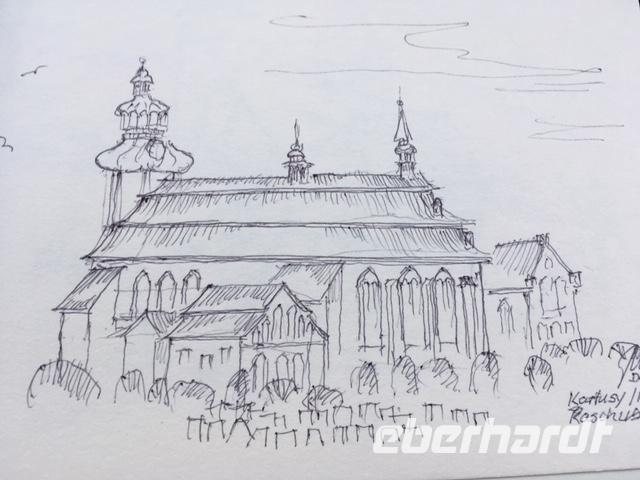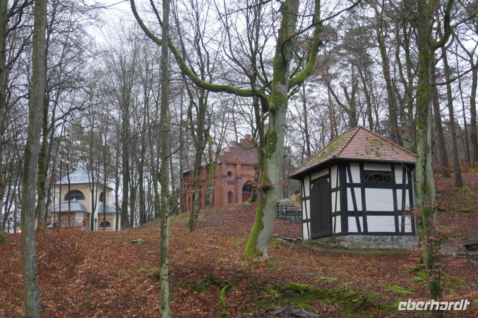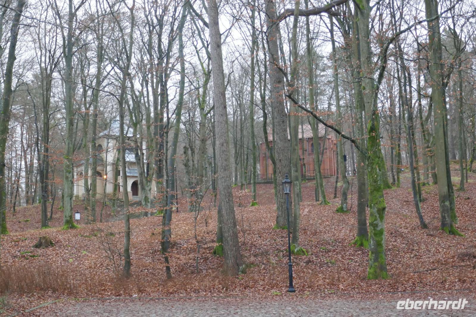 Am letzten Tag des Jahres ging es durch die reizvolle Landschaft der Kaschubischen Schweiz, die auch liebevoll das „Blaue Ländle" genannt wird. Am heutigen Tag brachte uns Bolek Land und Leute näher. Unter anderem erfuhren wir, warum die Kaschuben sprichwörtlich immer an ihrem schwarzen Gaumen erkannt wurden. Es kam vom Schnupftabak. Kostproben dazu wurden auch an uns gereicht. Unser erster Stopp war der Kalvarienberg von Wejherowo. Er wird auch oft als kaschubisches Jerusalem bezeichnet. Er besteht aus 26 Kapellen und verteilt sich auf einer Anhöhe im Wald.