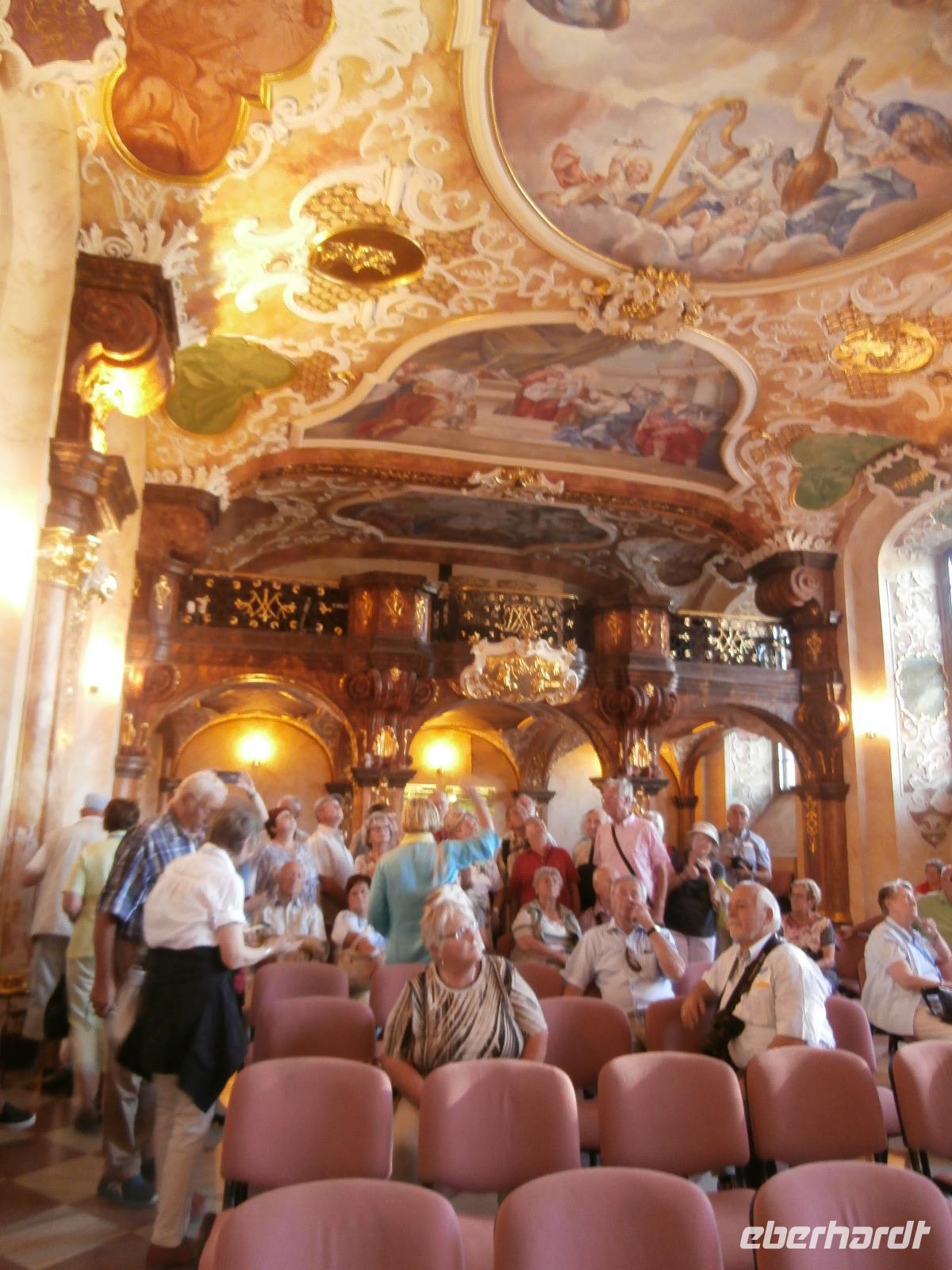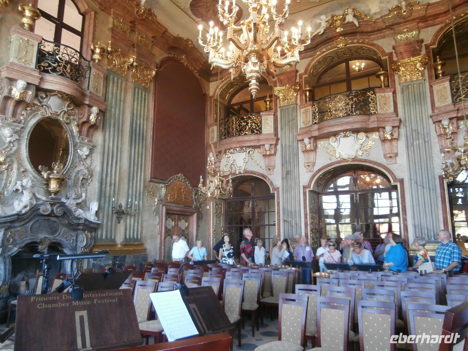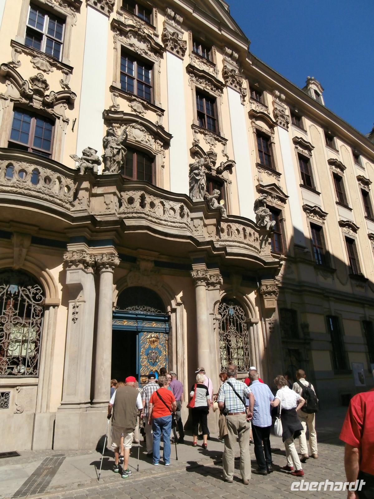 Wir starten unsere viertägige Reise in Chemnitz, haben noch Zustiege bis Bautzen und sind am Ende eine große Reisegruppe von 43 Personen. Die große Hitze der letzten Tage hält an, aber unser Reisebus ist gut klimatisiert. Vorbei an Görlitz passieren wir die Grenze zu Polen ohne Kontrollen. In Nähe von Zgorzelec legen wir eine längere Pause ein, hier wird Geld in die Landeswährung Polens getauscht und ein Mittagsstopp eingelegt. Gegen Mittag werden wir im Schloss Fürstenstein, dem größten Schloss Schlesiens, erwartet. Es ist fantastisch gelegen nördlich der Stadt Walbrzychs, umgeben von Wald und herrlicher Natur. Das Schloss auch „Tor nach Schlesien" bezeichnet, hatte eine große strategische Bedeutung, es sicherte die Handelswege nach Tschechien von Schlesien aus ab. Während und nach dem II. Weltkrieg erfuhr das Schloss viel Zerstörung, erst in den 70iger Jahren wurde mit Renovierungsarbeiten begonnen. Die prächtigen Schlossterrassen entstanden im 18. und 19. Jahrhundert, über sie verlassen wir das Anwesen von Schloss Fürstenstein und setzen unsere Fahrt nach Breslau fort. Die Anfahrt zum fünf Sterne Hotel Sofitel Wroclaw Old Town gestaltet sich sehr schwierig, überall parken abgestellte Autos die Straße zum Hotel zu, unser Buschauffeur Andreas Marx meistert diese Herausforderung ganz toll. Das gemeinsame Abendessen ist lecker und wird uns an den Tisch serviert. Den Abend lassen wir am nahe gelegenen Rynek in der Altstadt ausklingen. Laues Lüftchen, Musik, Wasserspiele und ein Bier in einem von den vielen Restaurants genießen wir in Breslau.