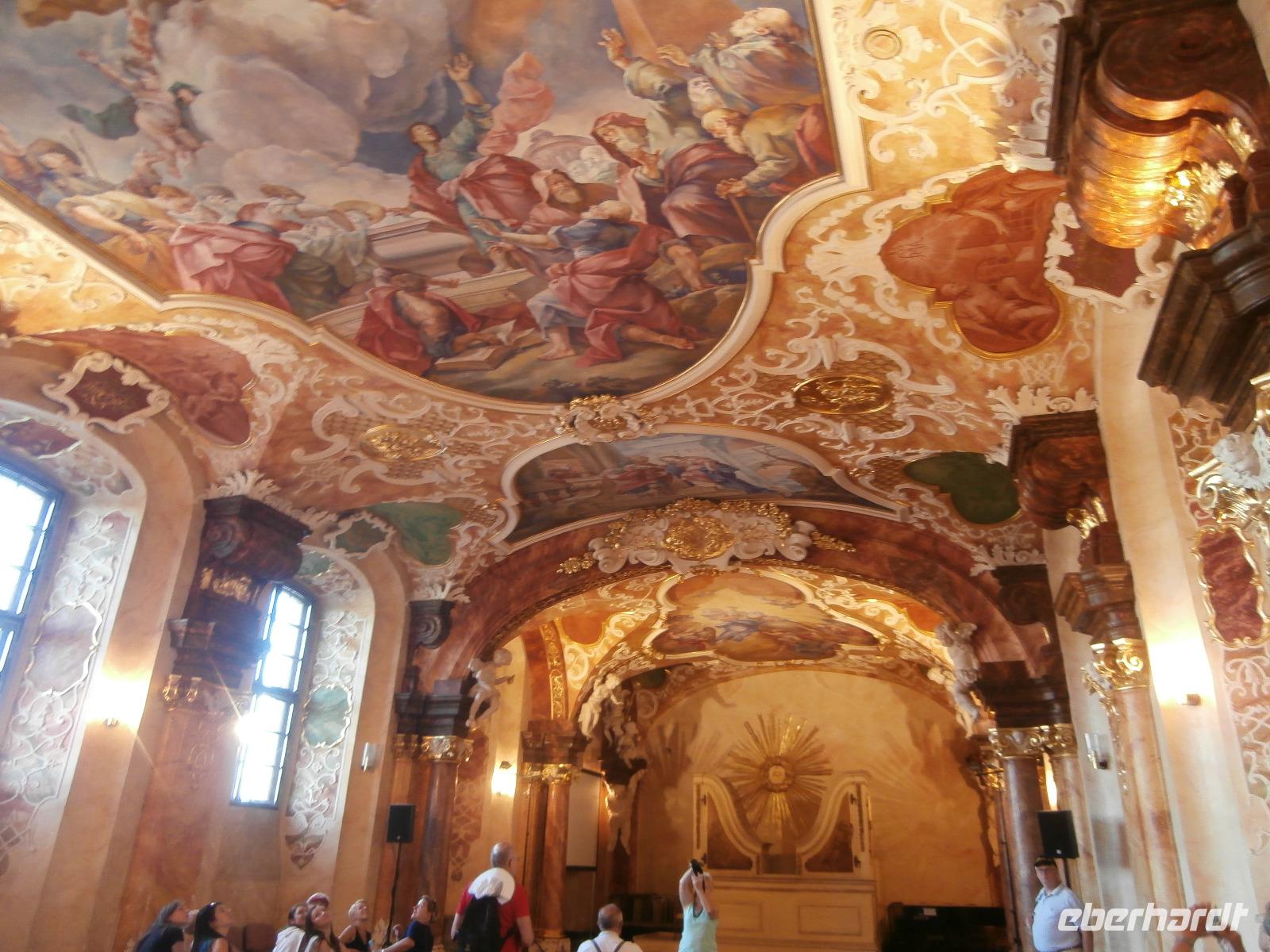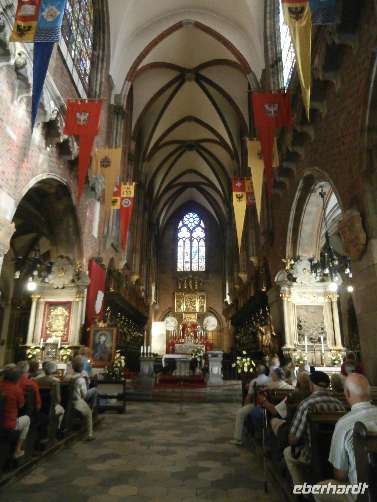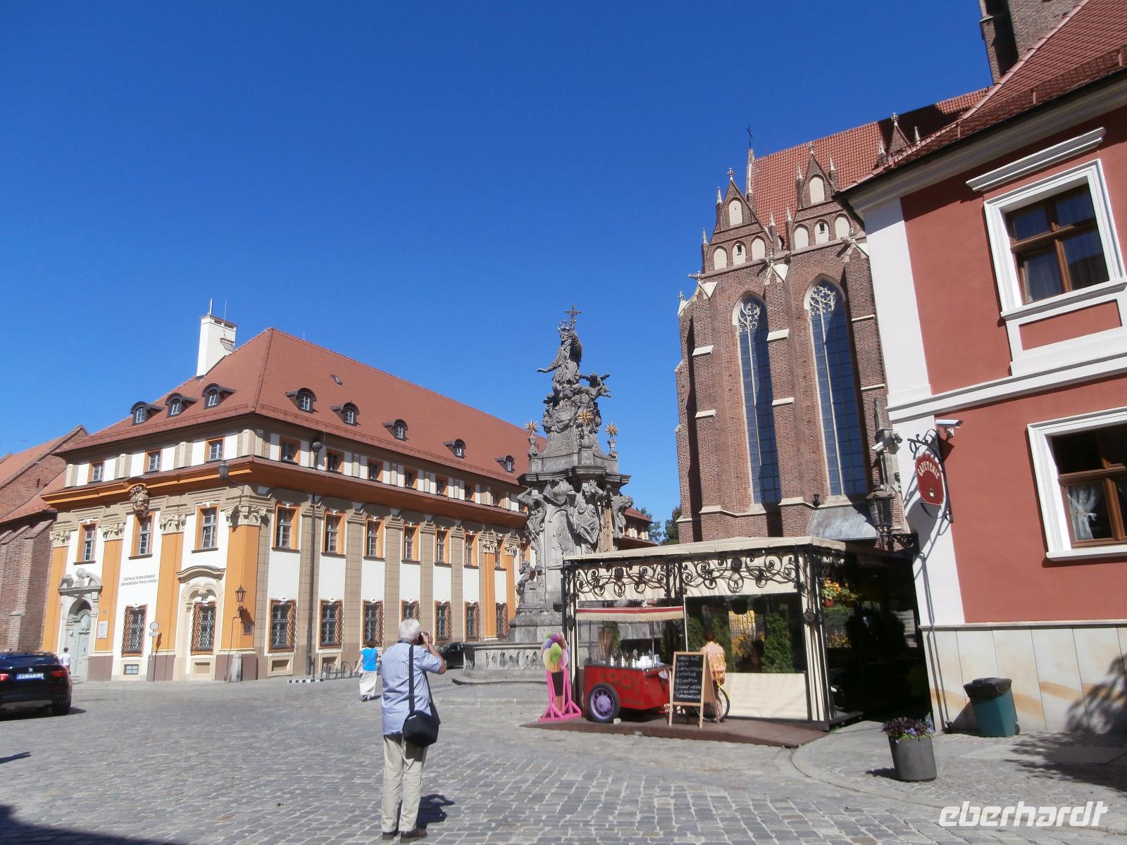 Bei traumhaftem Sommerwetter mit Rekordtemperaturen starten wir mit Ewa, unserer örtlichen Reiseleiterin, zur Stadtrundfahrt in Breslau. Mit Bus und Chauffeur Andreas fahren wir als Erstes hinaus zur Hala Stulecia, der Jahrhunderthalle, die zu den größten öffentlichen Eisenbetonbauten der Welt zählt. Der Fontana, dem Wasserspiel an der Jahrhunderthalle, schauen wir zu, am Abend findet regelmäßig eine beeindruckende Lichtershow statt. In der Nähe sind der Zoo und der Japanische Garten auch sehenswert. Die Dom Insel, Breslaus Wiege, ist seit Versandung der Oder im 19. JH mit dem Festland verbunden. Die Johanneskathedrale ist das machtvollste Gebäude der Dom Insel, welche wir im Anschluss besichtigen. Die Kreuzkirche steht nebenan und in den drei Kapellen des Breslauer Doms sehen wir kunstvolle Ausarbeitungen des Barocks. Die Hitze macht sich breit, wir werden im klimatisierten Bus von Andreas zum Universitäts-Hauptgebäude gefahren. Ab hier sind wir mit Ewa zu Fuß unterwegs. Im barocken Hauptgebäude der Breslauer Universität besichtigen wir das freskengeschmückte Treppenhaus und danach betreten wir mit der Aula Leopoldina den wertvollsten und schönsten Saal der Uni und einen der schönsten Hörsäle Polens. Vom Boden bis zur Decke ist er mit Schnitzereien und Goldstuck geschmückt. Der 41 Meter hohe Mathematische Turm mit seiner Aussichtsterrasse bietet uns am Nachmittag fantastische Ausblicke über Breslau und die Oder. Den Stadtrundgang beenden wir am Rynek, in seiner Mitte stehen das Alte und das Neue Rathaus, die ehemaligen Tuchhallen und ringsum reihen sich barocke Bürgerhäuser. Gute Stimmung, ein Kommen und Gehen ist allgegenwärtig, viele Straßencafés laden ein, unser Sommerwetter macht diesen Platz zu etwas ganz Besonderen. Jeden Abend sind wir im „Salon" der Stadt unterwegs, unser Hotel ist ganz nah dran. Im Brauereirestaurant Spiz treffen wir uns am Abend zum Essen mit einer genussvollen Bierverkostung, drei Sorten probieren wir.