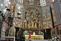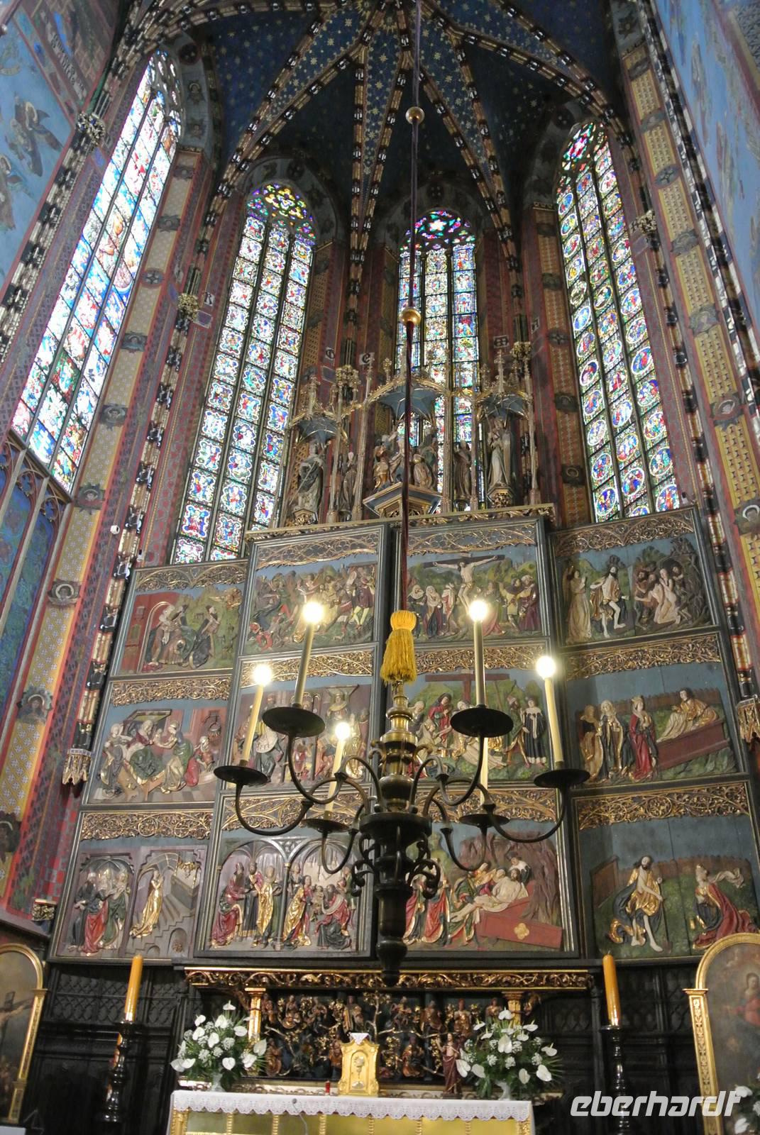 Als eine der ersten Gruppen erhielten wir Plätze in den ersten Reihen vor dem grandiosen Altar des Nürnberger Künstlers Veit Stoß. Man hat es nicht lesen brauchen, um einschätzen zu können, dass er sehr lange an der Fertigstellung des Altars gearbeitet haben muß; es waren 12 Jahre, die Veit Stoß ab 1477 für die Vollendung des 11x13 m großen Kunstwerks aus Lindenholz benötigte. Aber auch das gesamte Innere der Marienkirche war von unvergleichlicher Pracht und Schönheit.