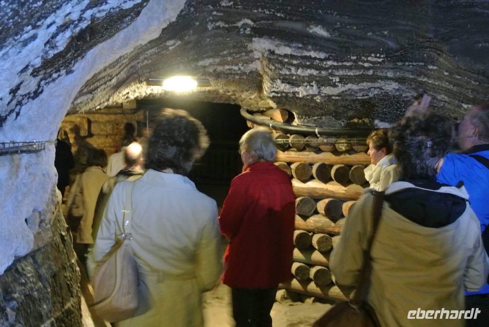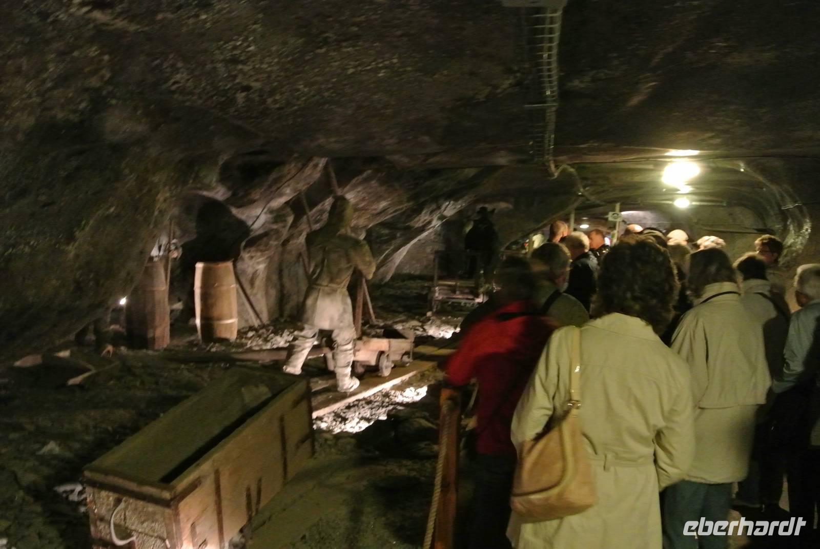 Marek führte uns durch lange, mit dicken Holzbalken gesicherten, Salzstollen, die durch Bergwerk-Laternen beleuchte waren. An verschiedenen Plätzen war durch Modelle oder Originalexponate, die sehr schwere und gefährliche Arbeit der Bergleute anschaulich dargestellt.