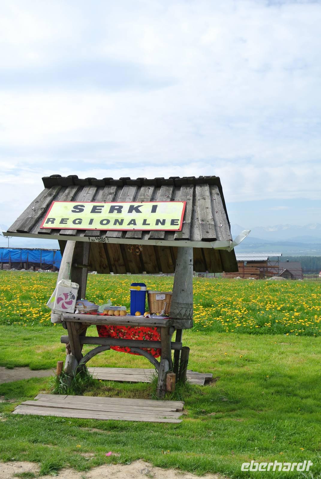 Danach fuhren wir Richtung Zakopane, dem bekanntesten polnischen Wintersport- und Ferienort. Dort machten wir zuerst eine Käseverkostung der in ganz Polen begehrten Schaaf- und Ziegenkäsespezialitäten der Goralen. Auf dem lebendigen Käsemarkt herrschte eine umtriebige Stimmung. Die Markthändler haben sich regelrecht überboten, mit dem Anpreisen ihres Käses. Nach so viel Käse fuhr ein Teil der Gruppe mit der Seilbahn auf den Gubalowka Berg; wegen dem schönen Bergpanorama dort oben. Die andern Gäste blieben mit dem Reiseleiter unten im Tal und erkundeten den Goralen Ort.