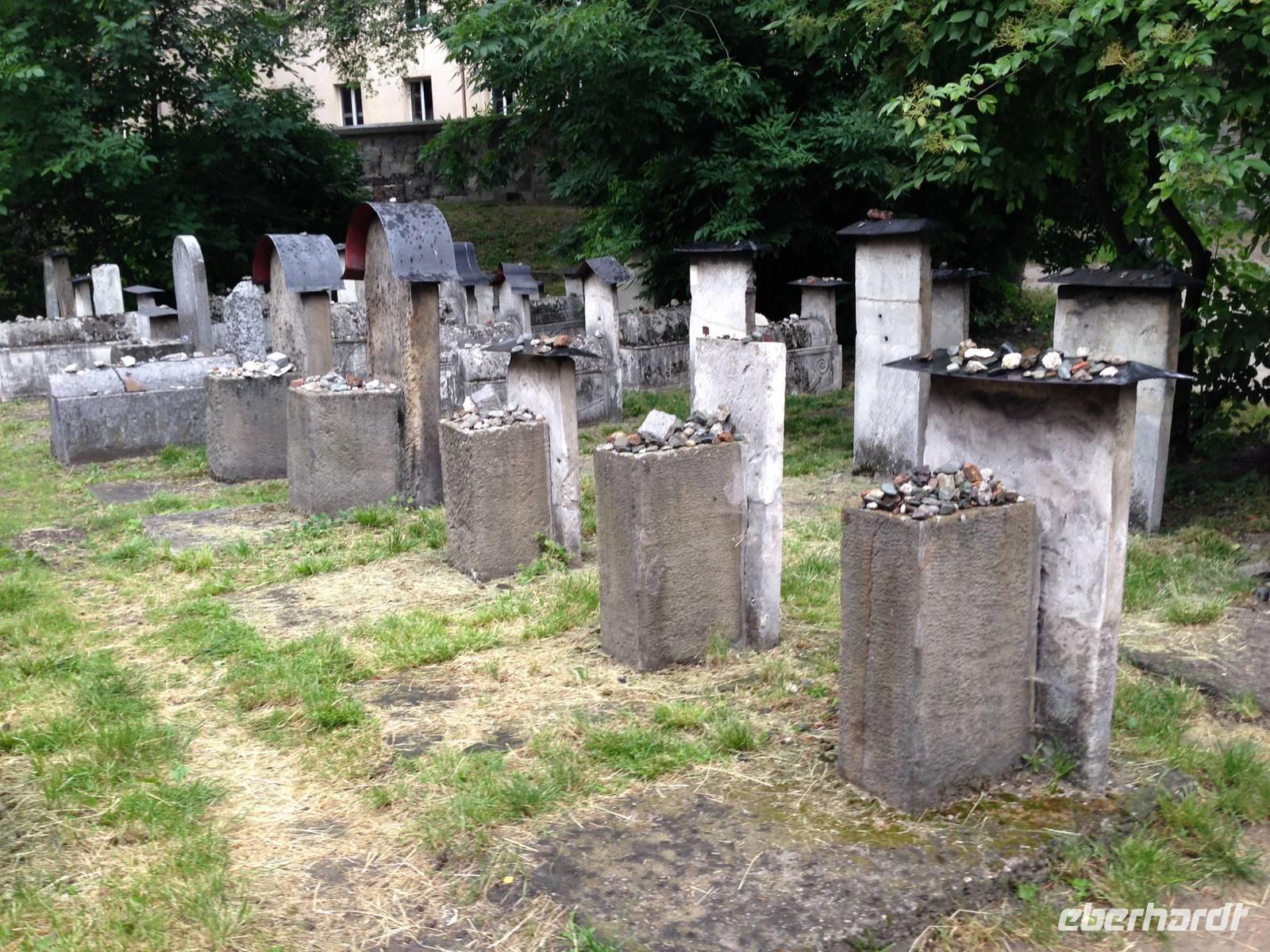 Trotz des immer stärker werdenden Regens spazieren wir über den jüdischen Friedhof und erfahren, was es mit den alten Gräbern und Steinsammlungen auf sich hat. Steine auf Grabstätten zu legen, ist eine Tradition aus der zeit, als die Gräber der Israeliten in der Wüste waren. Um zu vermeiden, dass Tiere die Toten ausbuddeln, wurden diese mit Steinpyramiden geschützt. Mit der Zeit drohten die Pyramiden jedoch zusammenzufallen, damit die Totenruhe trotzdem gewahrt wurde, legte jeder Besucher wieder einen Stein obenauf.