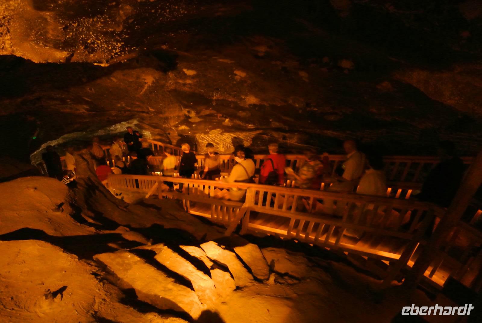 Ab 10:25 Uhr begann die einzigartige Führung mit dem großartigem Bergwerkführer Marek Untertage durch das Salzbergwerk. Zunächst ging es über eine gut und sichre ausgebaute Holztreppe 100 m tief unter die Erde.