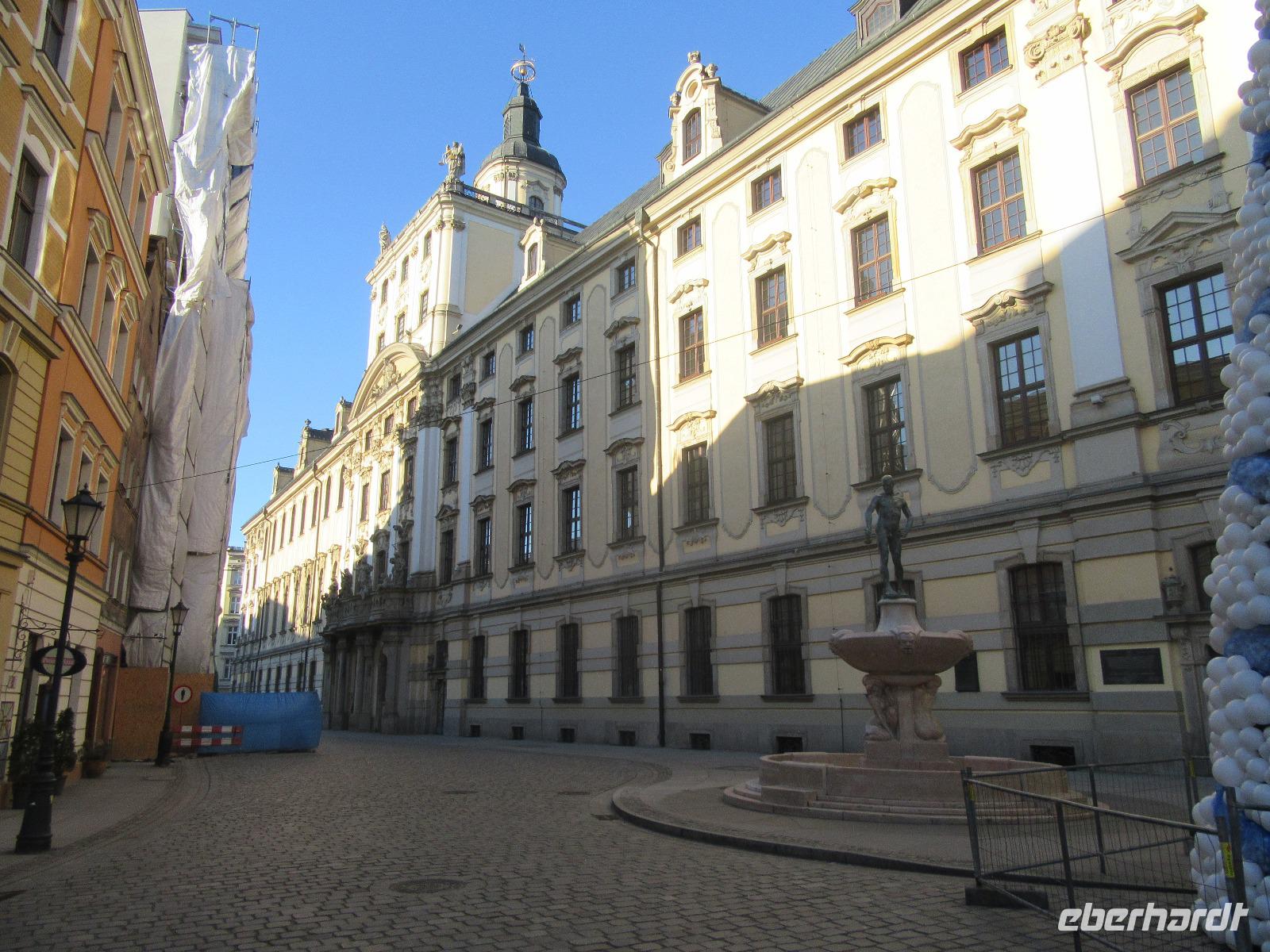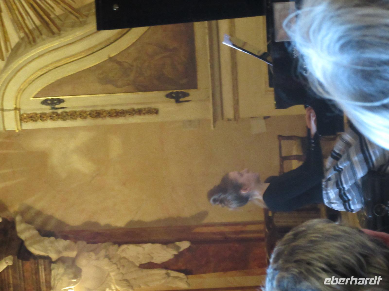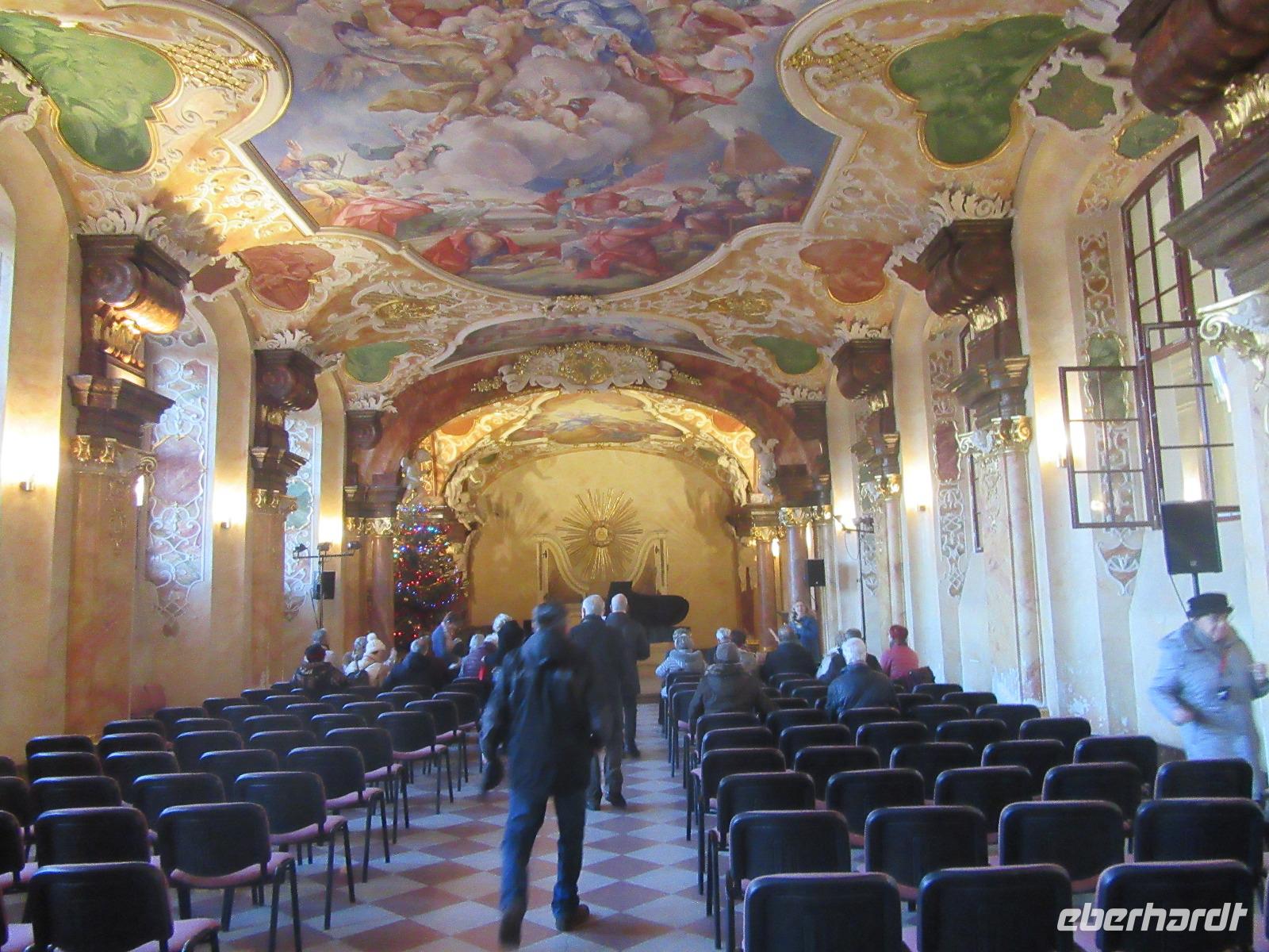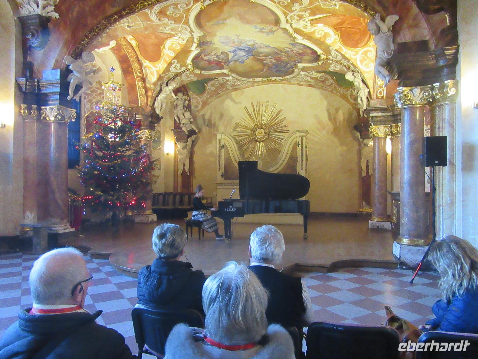 Für die Überraschung begeben wir uns zum Breslauer Oratorium. Hier werden wir eine Aufführung der 14-jährigen Julia Leniart hören, sie ist Preisträgerin mehrerer internationaler Klavierwettbewerbe. Nach der Aufführung zeigt Aldona uns das Oratorium. Wir setzen unseren Stadtrundgang fort und kommen zum Ossolineum, heute eine Bibliothek mit Druckwerken, Handschriften und Druckgrafiken zu polnischen Themen, früher ein Gymnasium für Jungen.