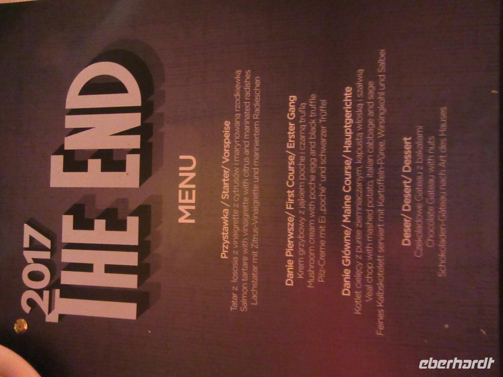 Das Silvestermenü besteht aus einem leckeren 4-Gänge-Menü, natürlich vorrangig polnische Spezialitäten sowie einem riesigen Buffet aus Kalt -, Warm- und Süßspeisen. Wer hier also nicht satt wird, wird es wahrscheinlich nirgendwo ??