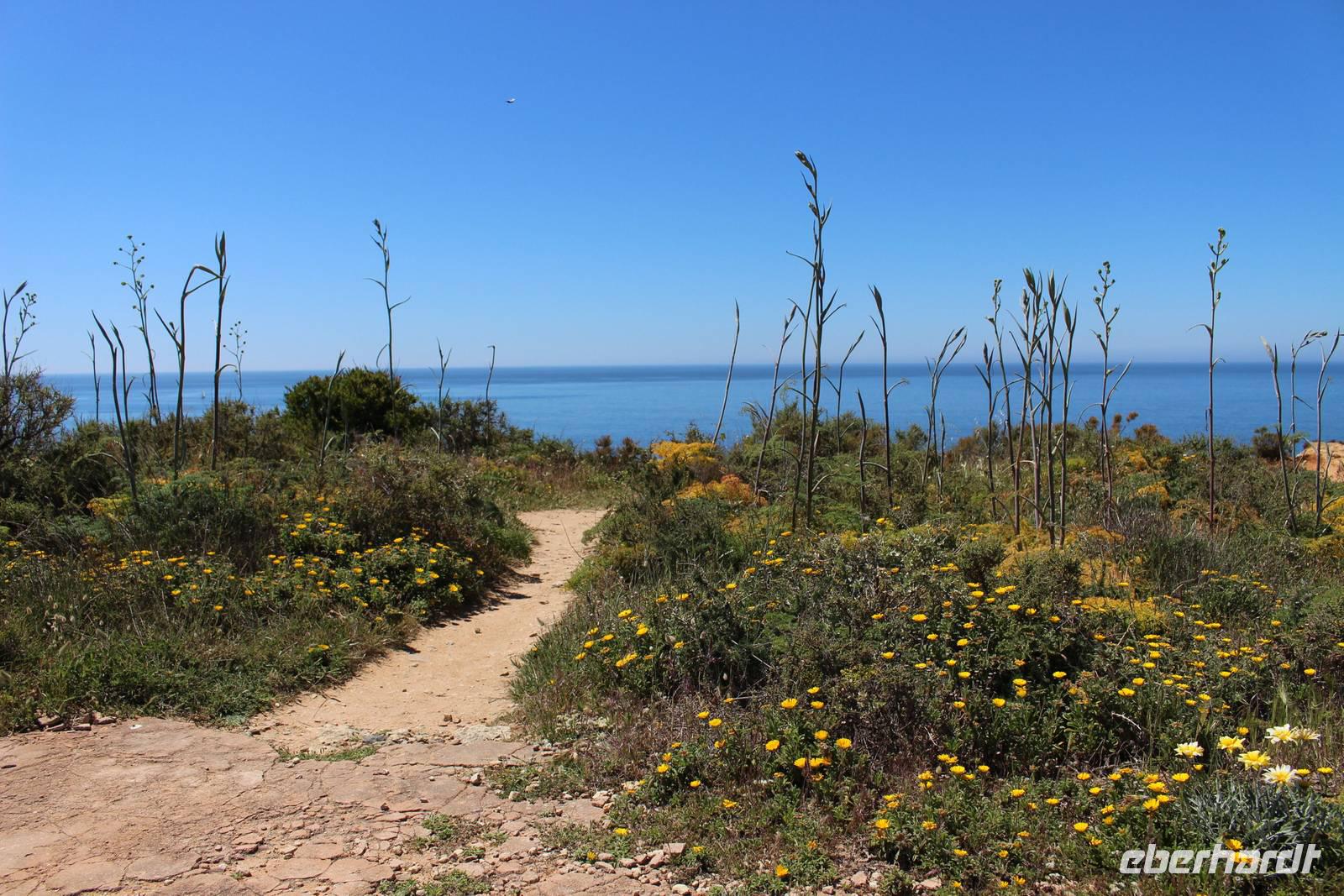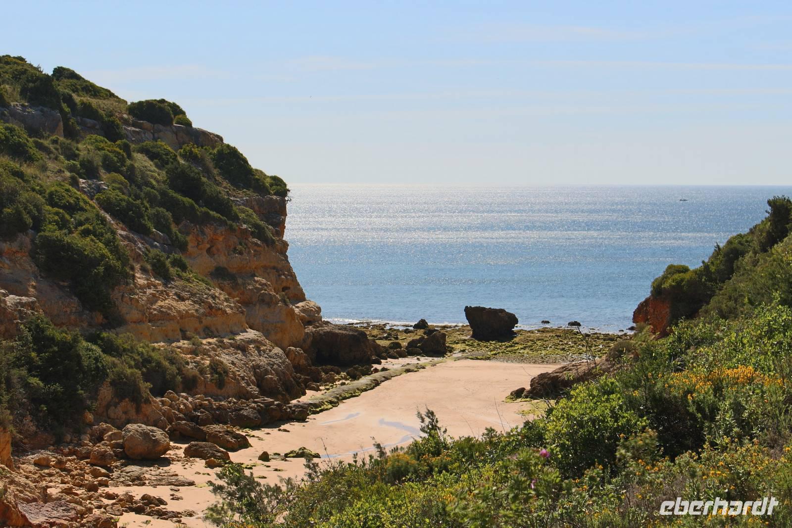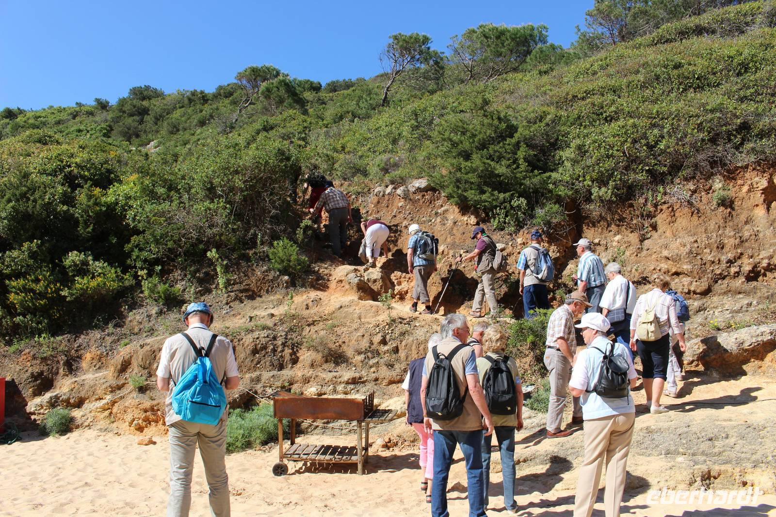 Gut ausgestattet mit Wanderstock und der richtigen Kleidung startete unsere Wanderung. Nachdem wir den ersten etwas steileren Aufstieg gut bewältigt hatten, wurden wir auch schon mit ersten tollen Ausblicken auf die Küste belohnt. Der Wanderweg führte uns direkt an der Küste entlang in bis zu 47 Metern über dem Meeresspiegel. Hinter jeder Ecke erwarteten uns tolle Fotomotive und atemberaubende Aussichten. Wir entdeckten wunderschöne kleine Buchten mit Traumstränden. Oft sah man die Einheimischen, die den Feiertag zum 1. Mai ganz traditionell mit einem Barbecue am Strand feierten. Unsere Reiseleiterin Fátima erklärte uns, dass es hier üblich ist, diesen Feiertag so zu verbringen und dazu alle Freunde und die ganze Familie einzuladen.
