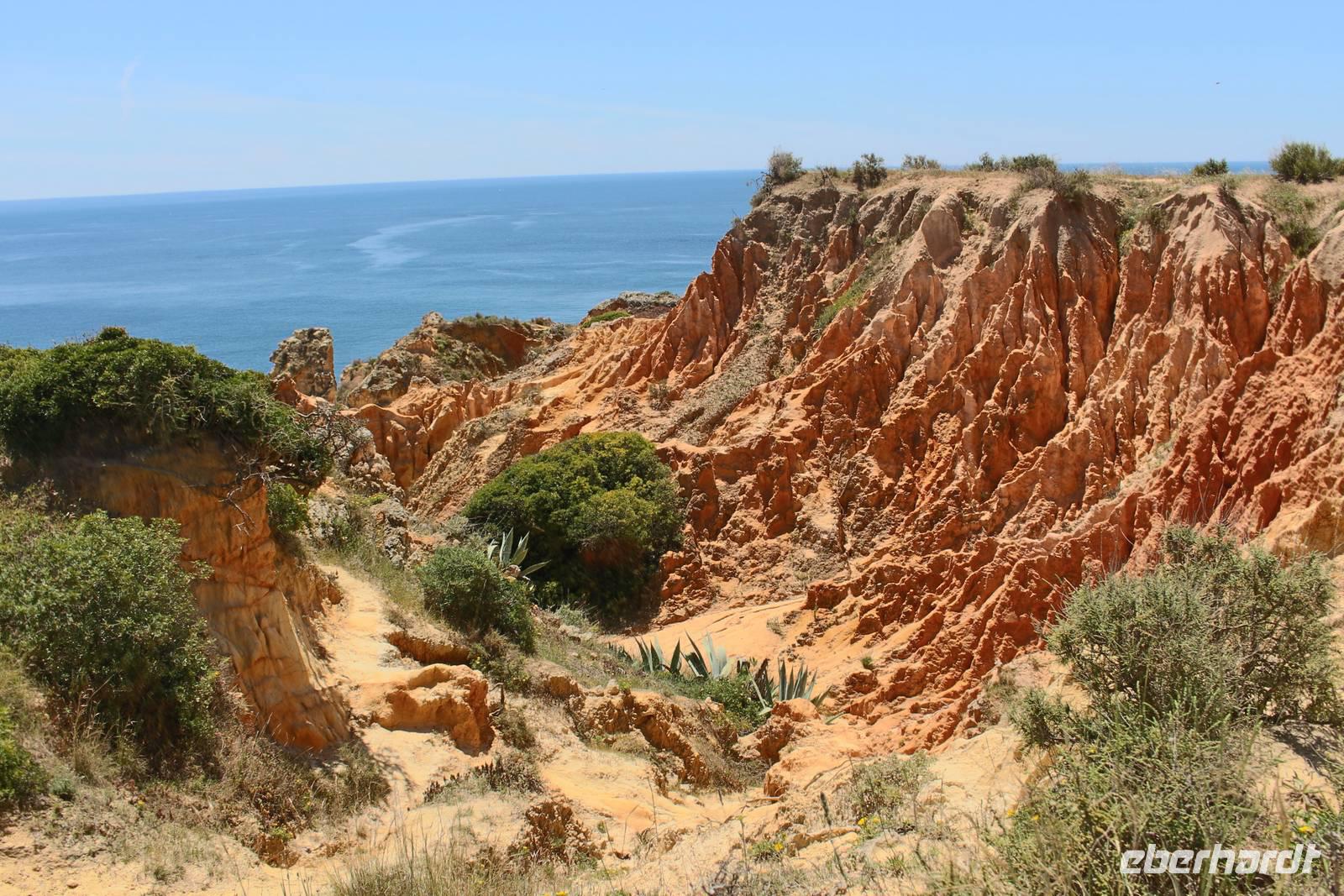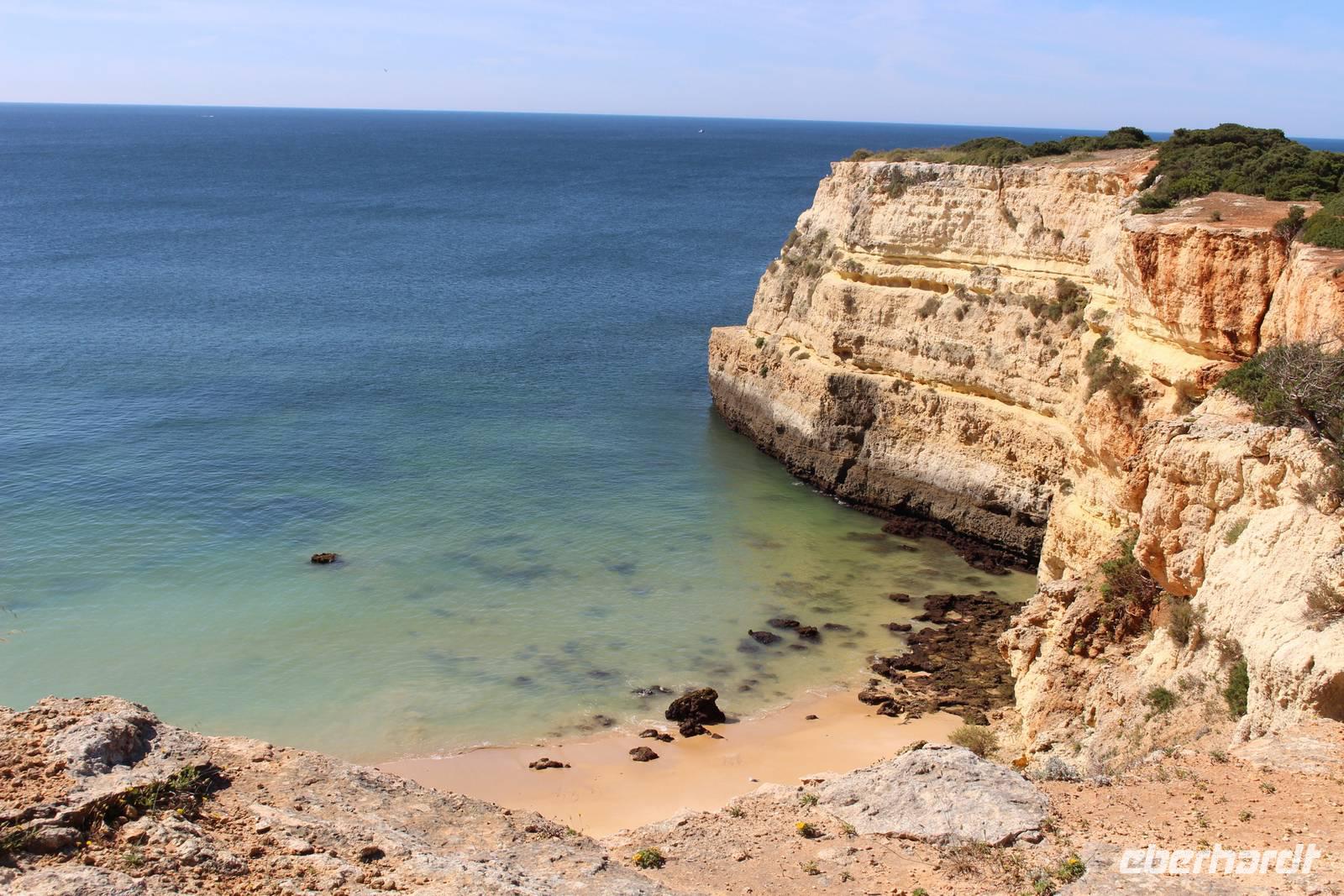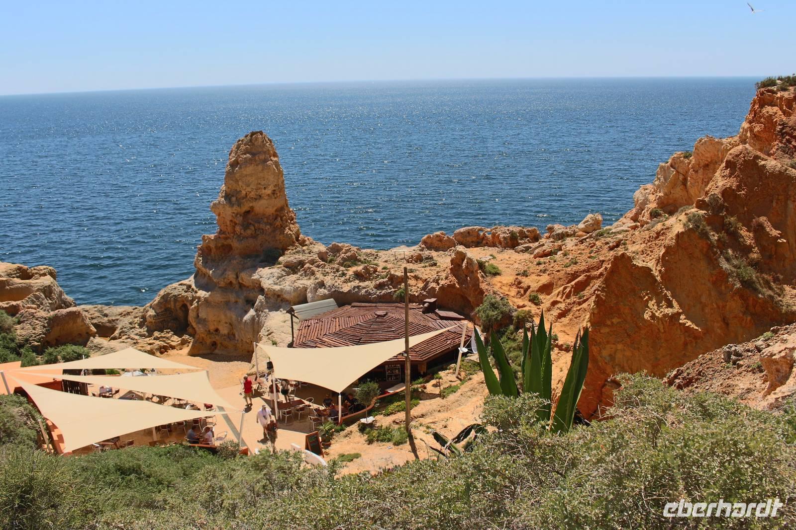 Nach ca. 5 Kilometern machten wir eine gemeinsame Pause. Hier wartete unser Fahrer George schon mit dem Bus auf uns, sodass einige die Wanderung hier beenden und mit dem Bus zum Ziel fahren konnten. Alle noch Wanderfreudigen begaben sich nun auf das letzte Stück, welches durch einen recht steilen Abstieg und vor allem durch die hohen Temperaturen von bis zu 35°C noch einmal recht anstrengend wurde. Froh waren wir alle, als wir das Café in Benagil erreichten, wo auch schon George und der Rest der Gruppe auf uns warteten. Hier war nun die Möglichkeit, sich nach dieser Wanderung auszuruhen und bei einem kühlen Getränk zu erfrischen.