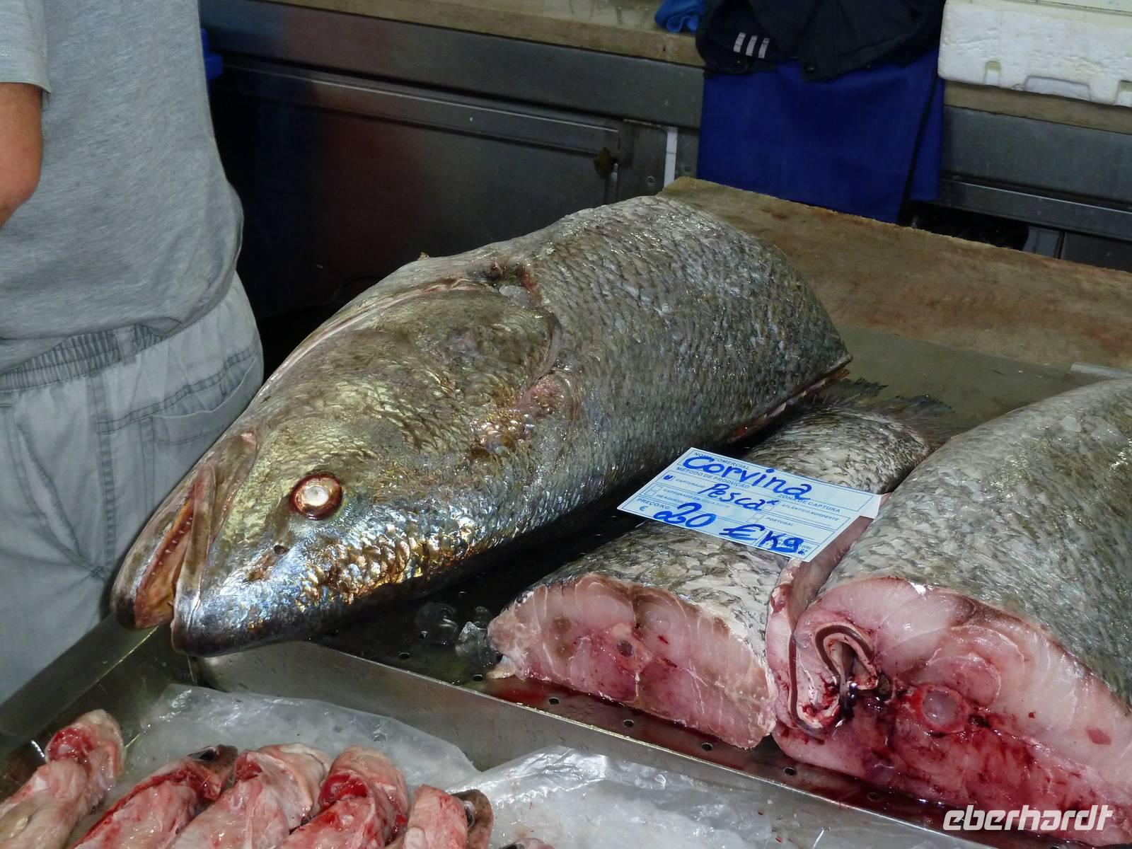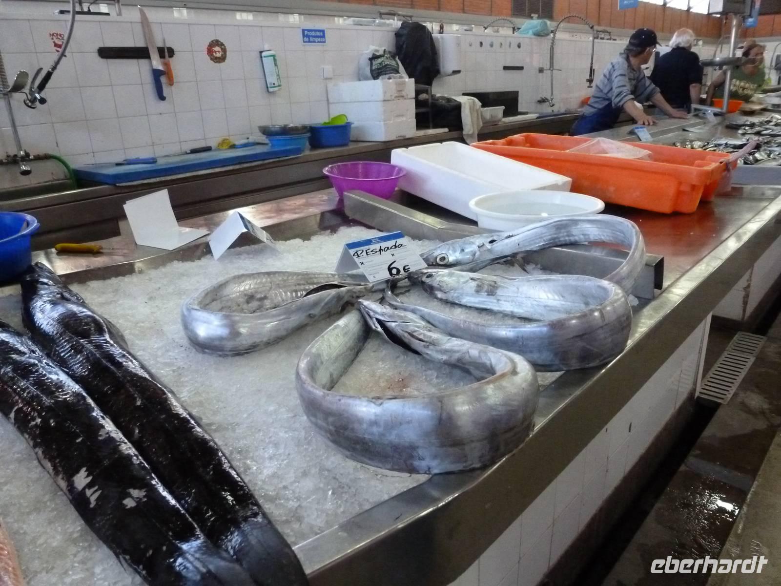 Hier konnten wir vom Bus aus die Salinen sehen und hatten einen guten Ausblick auf das Naturschutzgebiet Ria Formosa. Wir machten eine kleine Pause an der Markthalle, um uns den bekannten Fischmarkt der Stadt anzuschauen. Uns erwartete eine ganze Halle mit verschiedensten Fischen, von denen uns viele noch recht unbekannt waren, aber von Fátima erklärt wurden.