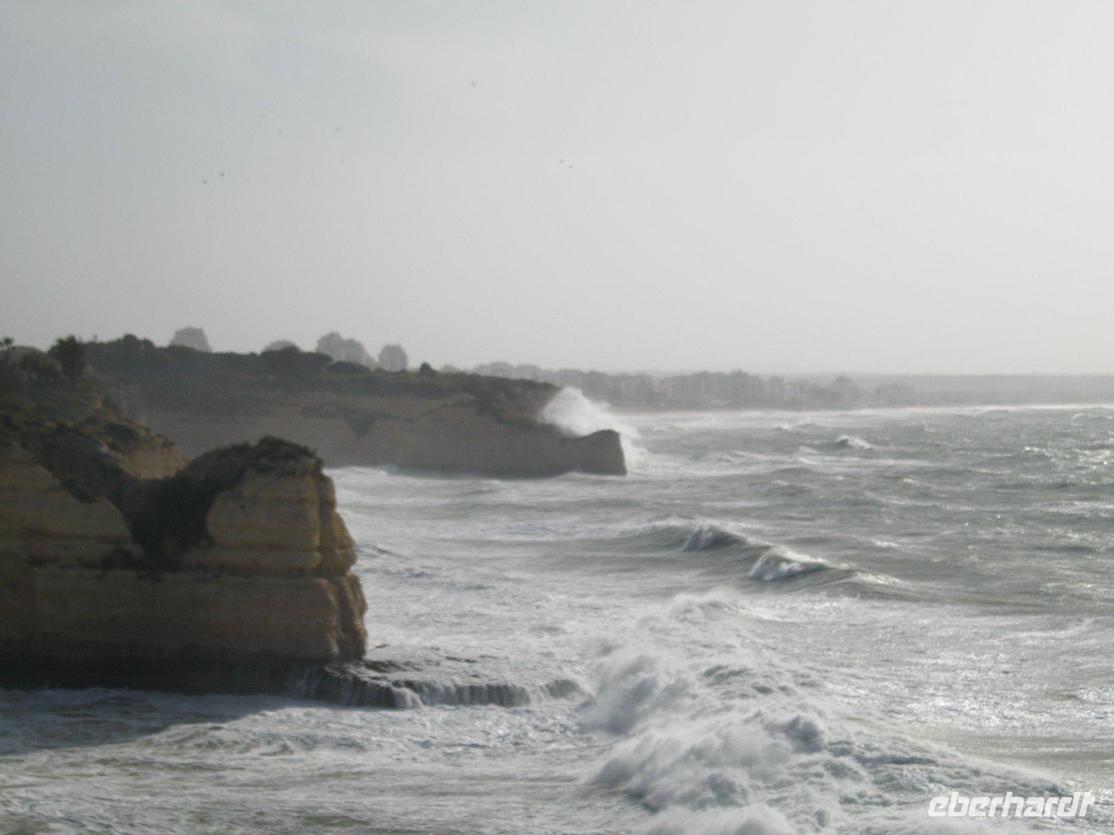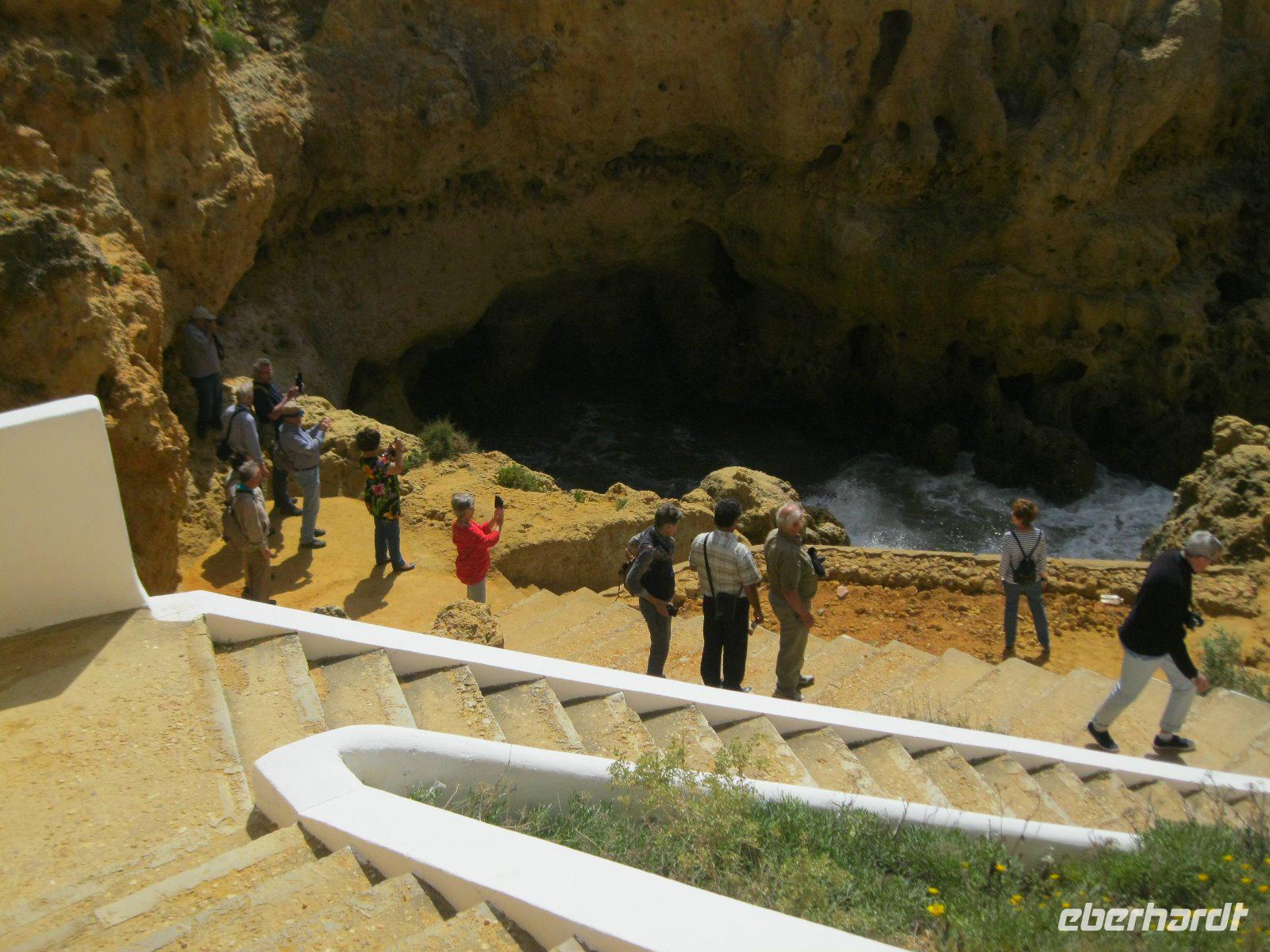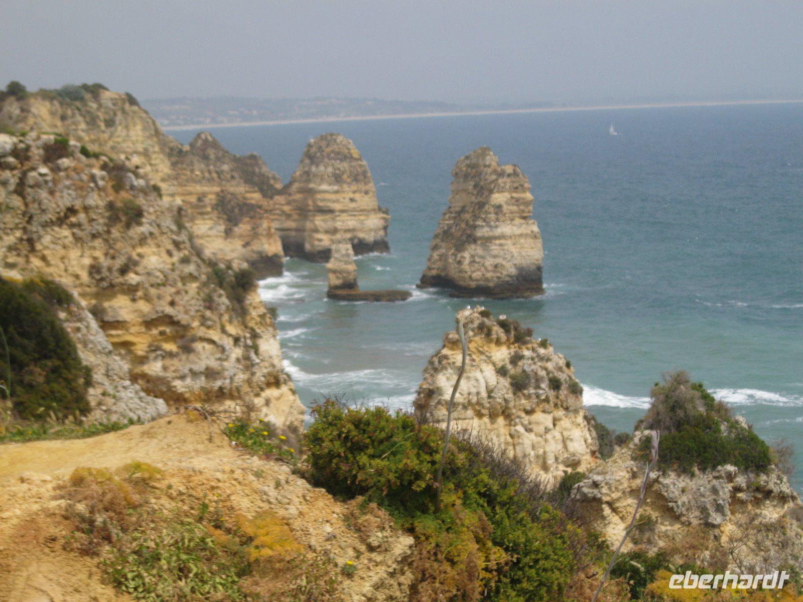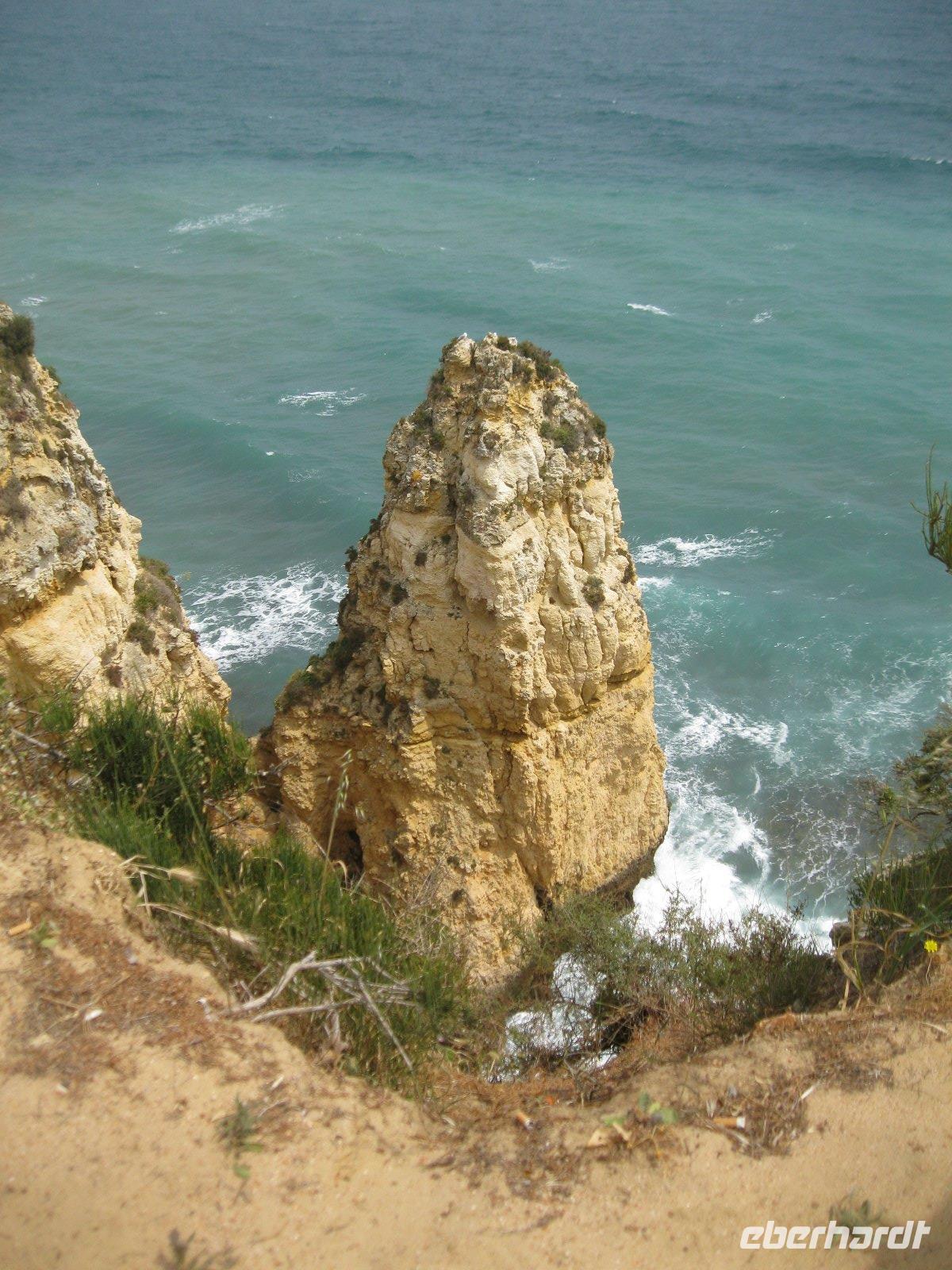 Wir überquerten, bei Portimao, den Rio Arade und gelangten, vorbei an Weinbaugebieten, nach Sagres. Von dem, bis zu 150m hohen, Felsplateau hatten wir einen weiten Blick über den Atlanic. An dieser Stelle sollten sich, laut Legende, die Götter nach getaner Arbeit ausgeruht haben. Ruhm erreichte dieser Ort durch "Heinrich der Seefahrer", der hier seine berühmte Navigationsschule bauen ließ. Im Jahre 1457 nahm er sogar Fortaleza de Sagres zu seinem Ruhesitz. Weiter ging es nach Cabo de Sao Vincente, "dem Ende der Welt" , das von einem Leuchtturm markiert wird. Mit 3000 Watt- Blinkfeuer, ist der 1846 errichtete Orientierungspunkt, das stärkste Leuchtfeuer Europas. Natürlich ließen wir es uns nicht nehmen, die letzte Bratwurst vor Amerika zu probieren, sogar mit Zertivikat. Einen zusätzlichen Stop machten wir am Leuchtturm Ponta da Piedale. Dort spazierten wir über die Klippen und es bot sich uns ein fantasticher Blick auf die, von der Natur so eigen geschaffenen, Felsformationen. Allerdings ahnten wir schon hier, dass die geplante Bootsfahrt förmlich ins Wasser fallen wird. Meeresgott Neptun war so aufbrausend das kein Ausflugsschiff den Hafen von Lagos verlassen konnte.Was solls, bummelten wir eben etwas länger durch Lagos. Hier begannen und endeten viele der großen portugisischen Entdeckerfahrten. Somit kamen auch die ersten Sklaven, zum Verkauf, nach Europa. Heute ziert den einstigen Sklavenmarkt das majestätische Denkmal von Infante Henrique. Wir besuchten auch die Kirche St.Antonio (Goldkirche) mit den vergoldeten Schnitzereien, die den portugiesischen Barock prägten. Wieder geht ein ereignisreicher Tag dem Ende zu.