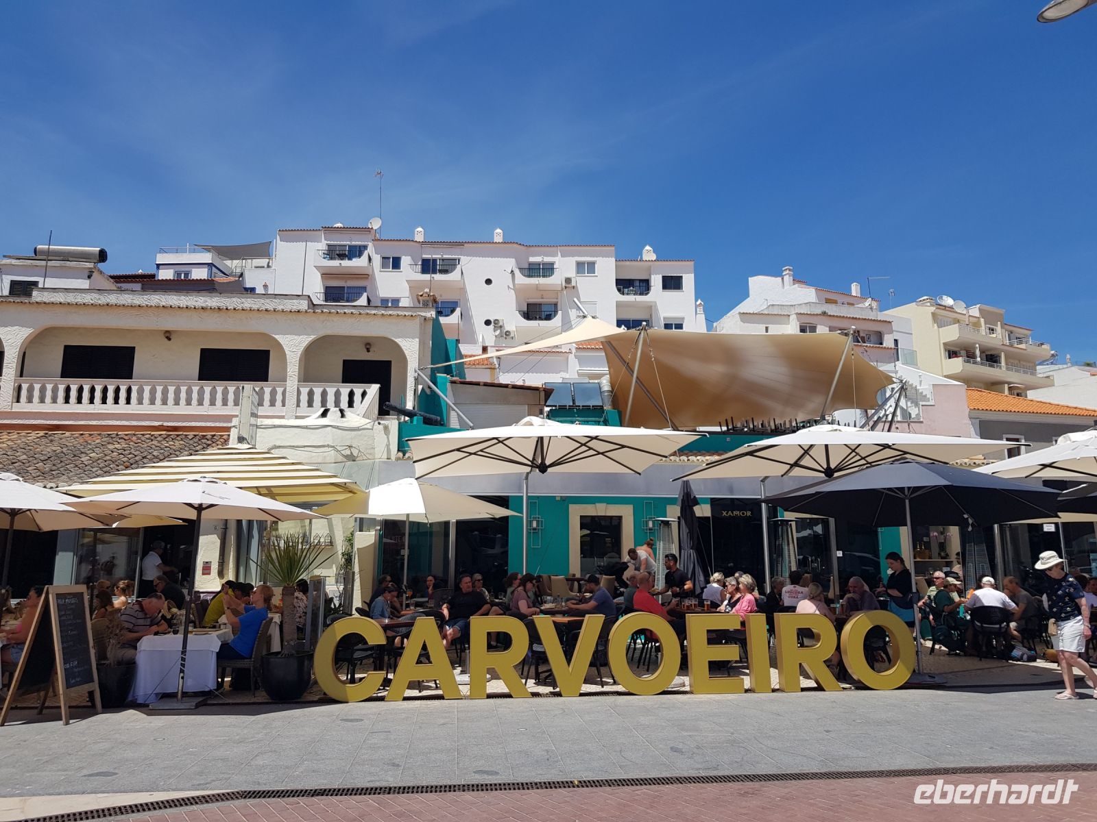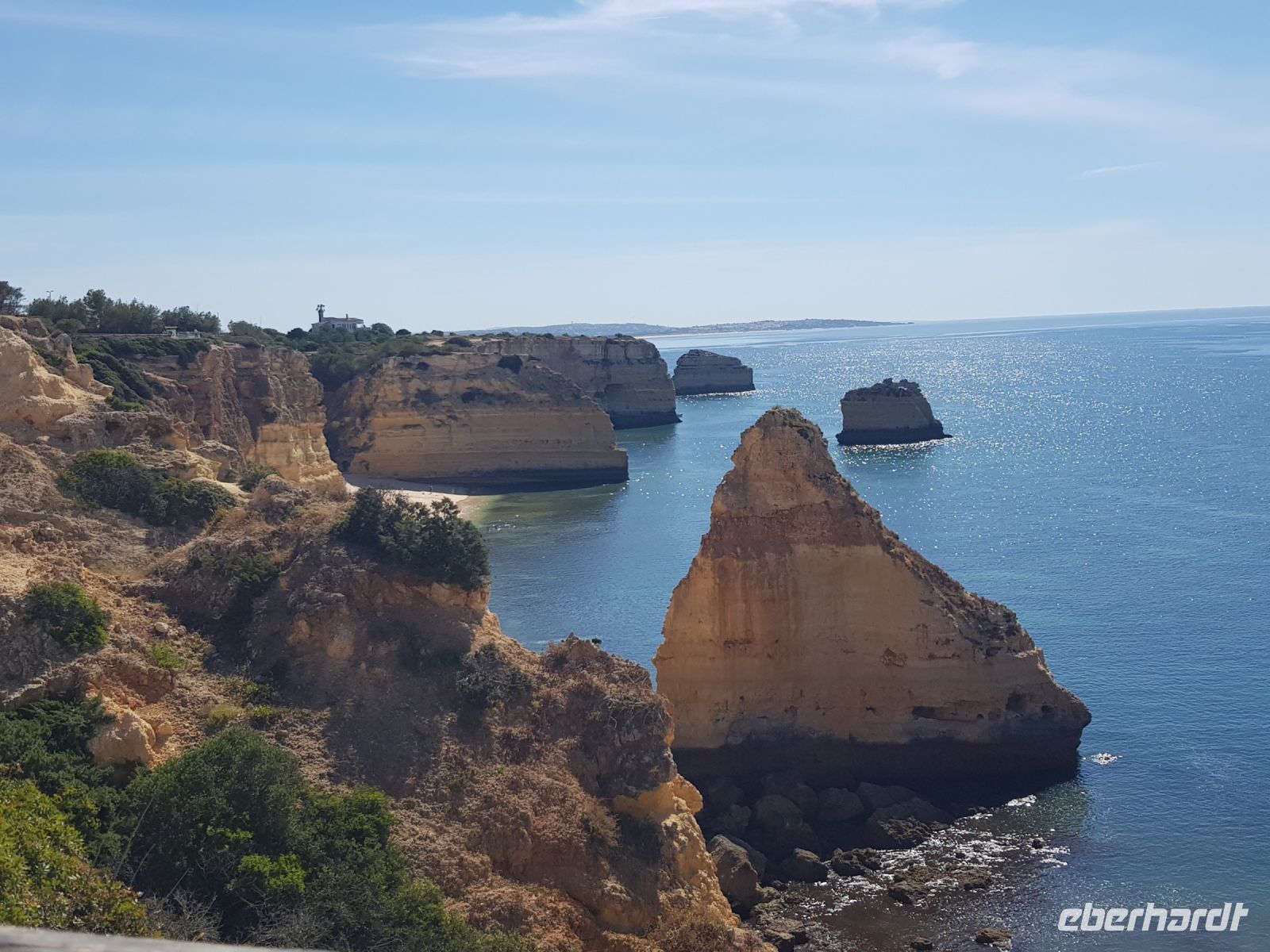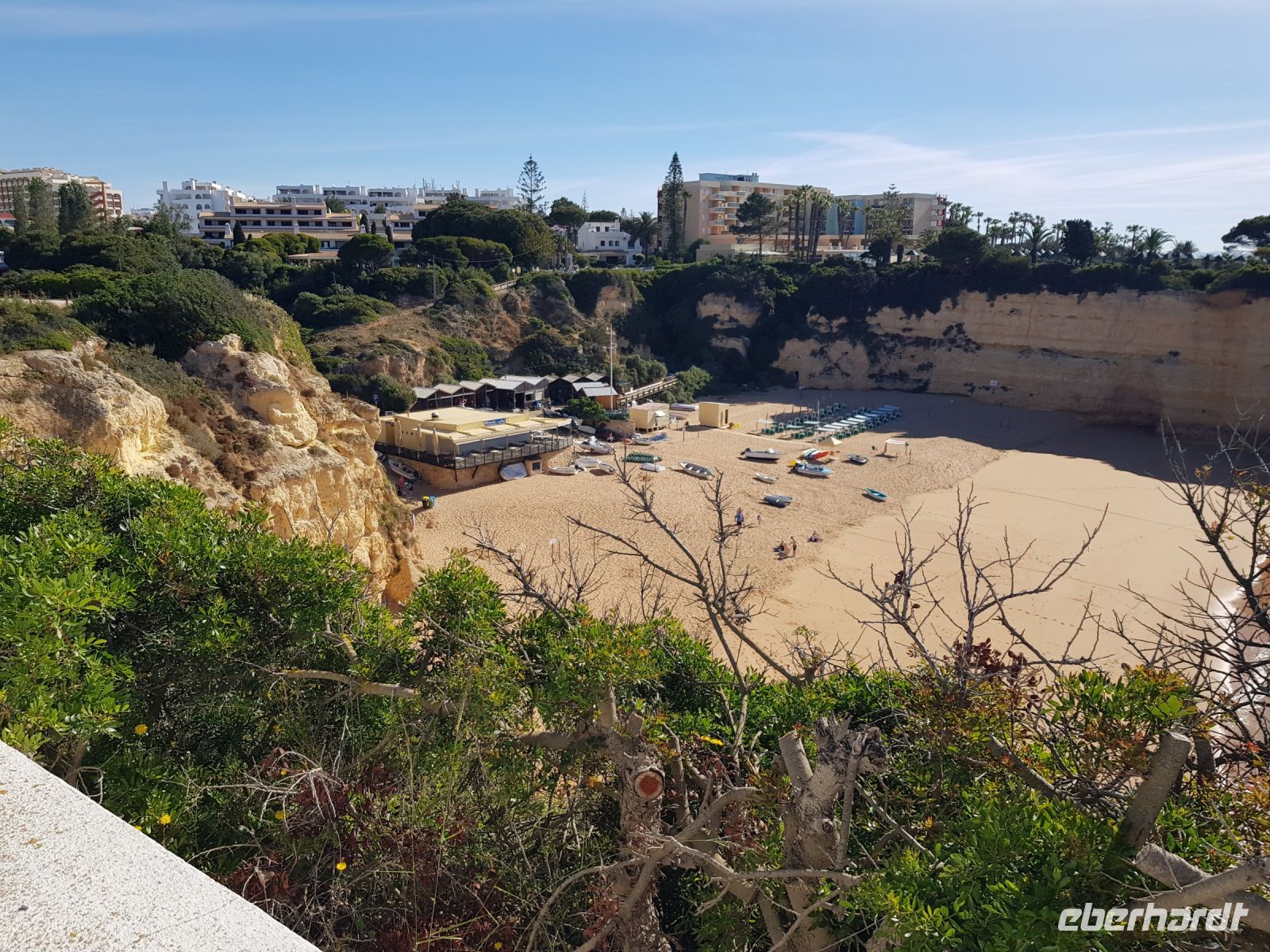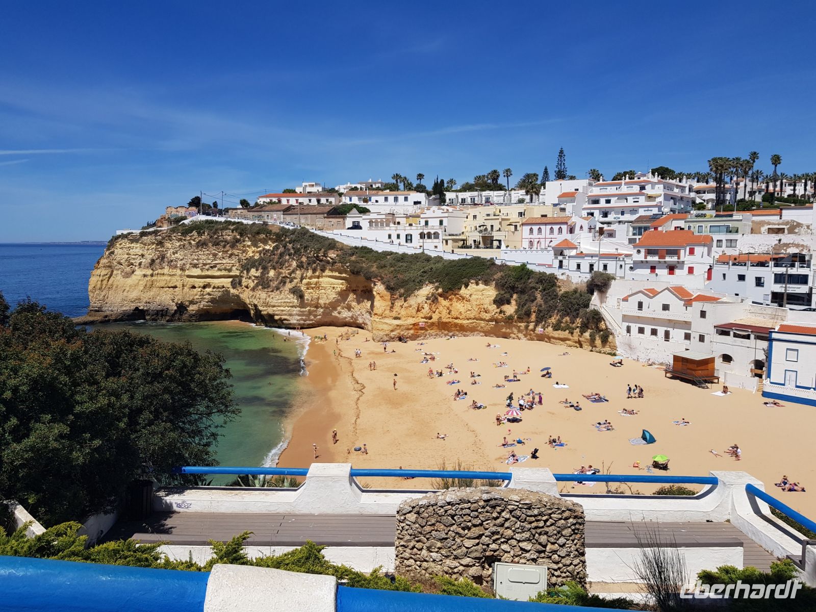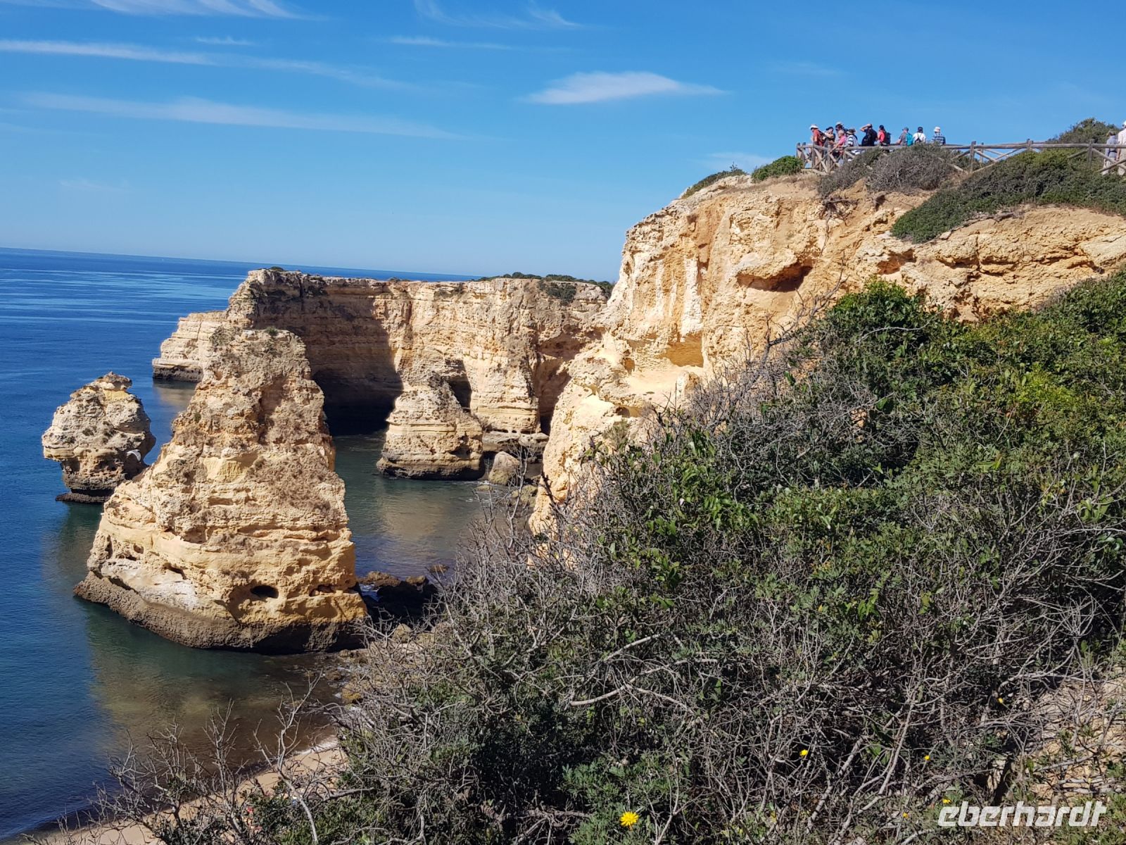 Geduld und Nerven bei der Vorbereitung, diesen Tag optimal zu gestalten. Statt des bestellten Kleinbusses kam ein großer, noch mal 300 g Geduld vom Konto abgehoben! ( wie soll dieser lange Bus an die geplanten Praias fahren können?). Es geht zunächst besser als gedacht. und ein bißchen laufen wollen wir ja auch. Als erste "Perle" ist die Felsenkapelle NOSSA SENHORA DA ROCHA geplant. Die Aussicht auf die Bucht mit ihrem schroffen Felsen ist großartig. Aber es soll noch besser werden, weil als nächste "Perle" eine Wanderung an der "PRAIA DA MARINHA" geplant ist. Aber erst einmal muss man unbedingt fotografieren. Dabei weiter zu laufen ist gar nicht so einfach. SENSATIONELL diese Ausblicke auf die Felsformationen! Das sind genau einige dieser Postkartenmotive! Wir wandern gemütlich in die eine Richtung nach rechts und dann geht es einige Meter den Weg zur Badebucht hinunter bevor es noch in die andere Richtung geht. Man kann sich gar nicht satt sehen an diesen herrlichen Motiven, es ist wie in einem Film. Danach fährt uns der Bus nach CARVOVEIRO - das schönste Fischerdorf an der Algarve. Aber mit so einem großen Bus gibt es Schwierigkeiten durch die engen Gassen zu fahren, die auch schon mal fast zugeparkt sind. Am geplanten Parkplatz vor der ALGAR SECO ( dem Küstenwanderweg aus Holzbohlen) können wir auch nicht parken, die Einbahnstrasse führt uns wieder ins Zentrum. Also machen wir die Wanderung andersherum, ist auch nicht so schlimm, wir müssen den Weg nur hin (vom Zentrum des Dorfes den Berg hinauf zur Algar Seco) und dann wieder zurückgehen. Aber diese 3."Perle" ALGAR SECO mit ihren Buchten, die man teilweise hinabsteigen kann, ist es wert!