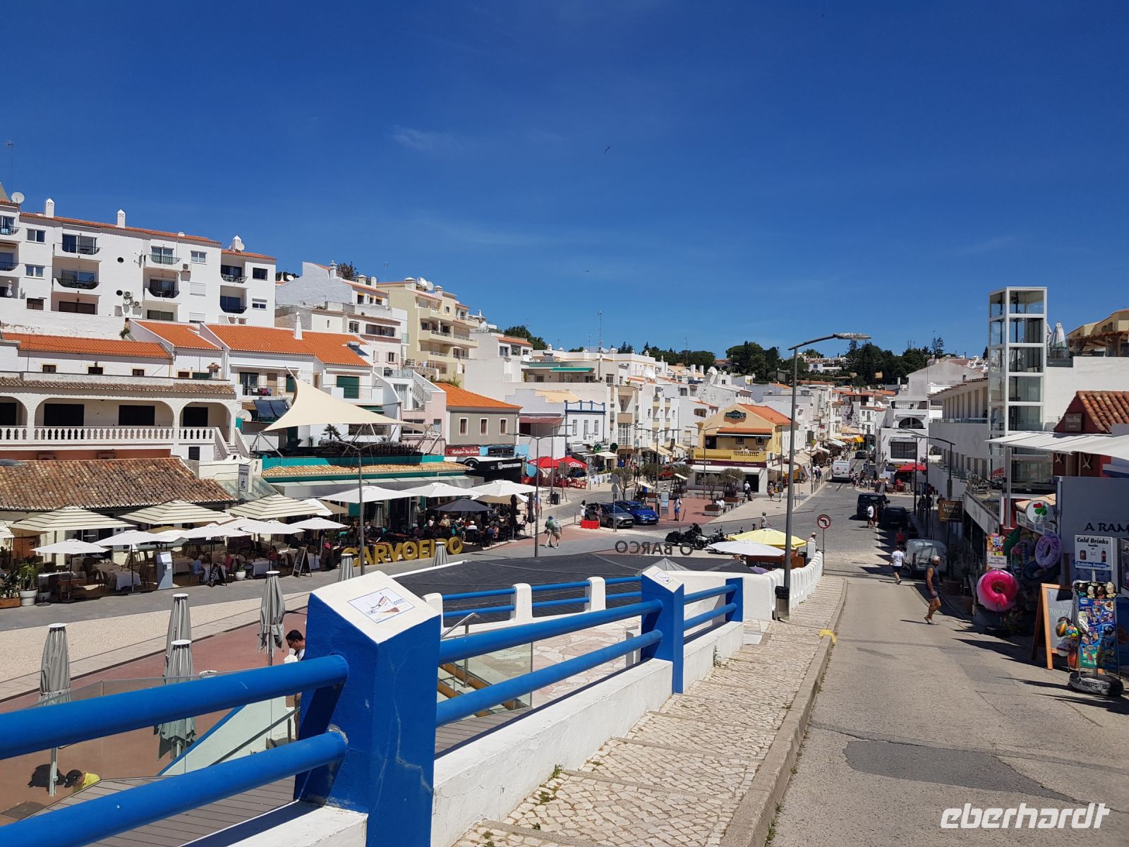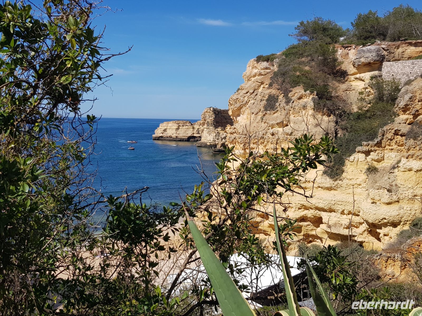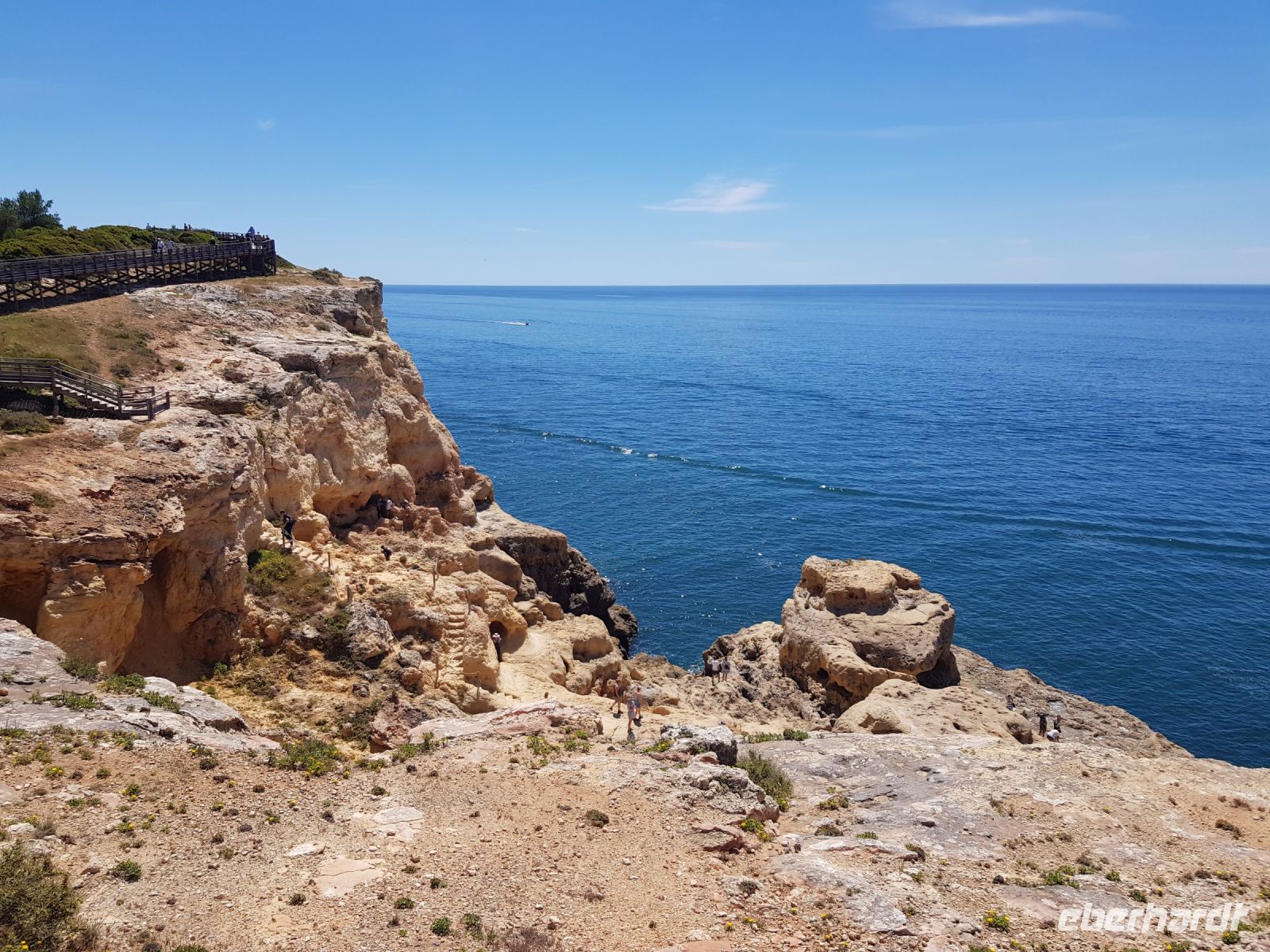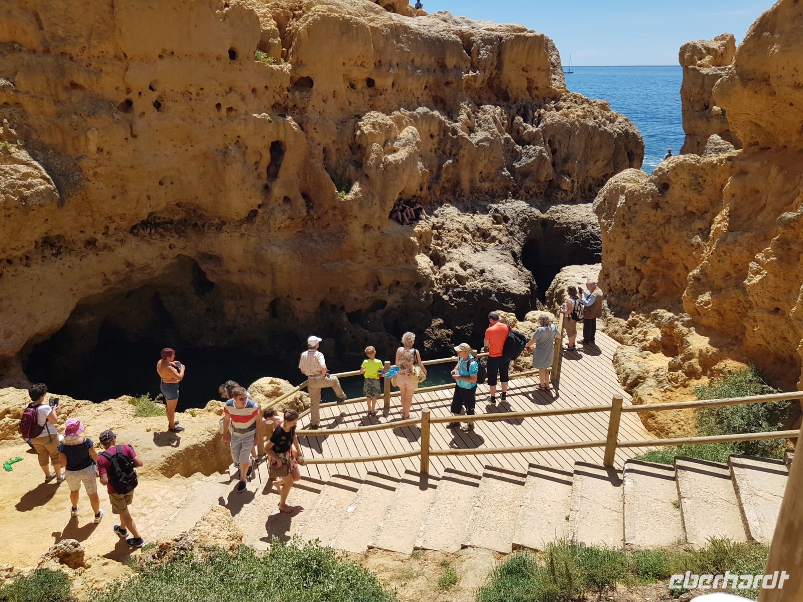 Geduld und Nerven bei der Vorbereitung, diesen Tag optimal zu gestalten. Statt des bestellten Kleinbusses kam ein großer, noch mal 300 g Geduld vom Konto abgehoben! ( wie soll dieser lange Bus an die geplanten Praias fahren können?). Es geht zunächst besser als gedacht. und ein bißchen laufen wollen wir ja auch. Als erste "Perle" ist die Felsenkapelle NOSSA SENHORA DA ROCHA geplant. Die Aussicht auf die Bucht mit ihrem schroffen Felsen ist großartig. Aber es soll noch besser werden, weil als nächste "Perle" eine Wanderung an der "PRAIA DA MARINHA" geplant ist. Aber erst einmal muss man unbedingt fotografieren. Dabei weiter zu laufen ist gar nicht so einfach. SENSATIONELL diese Ausblicke auf die Felsformationen! Das sind genau einige dieser Postkartenmotive! Wir wandern gemütlich in die eine Richtung nach rechts und dann geht es einige Meter den Weg zur Badebucht hinunter bevor es noch in die andere Richtung geht. Man kann sich gar nicht satt sehen an diesen herrlichen Motiven, es ist wie in einem Film. Danach fährt uns der Bus nach CARVOVEIRO - das schönste Fischerdorf an der Algarve. Aber mit so einem großen Bus gibt es Schwierigkeiten durch die engen Gassen zu fahren, die auch schon mal fast zugeparkt sind. Am geplanten Parkplatz vor der ALGAR SECO ( dem Küstenwanderweg aus Holzbohlen) können wir auch nicht parken, die Einbahnstrasse führt uns wieder ins Zentrum. Also machen wir die Wanderung andersherum, ist auch nicht so schlimm, wir müssen den Weg nur hin (vom Zentrum des Dorfes den Berg hinauf zur Algar Seco) und dann wieder zurückgehen. Aber diese 3."Perle" ALGAR SECO mit ihren Buchten, die man teilweise hinabsteigen kann, ist es wert!