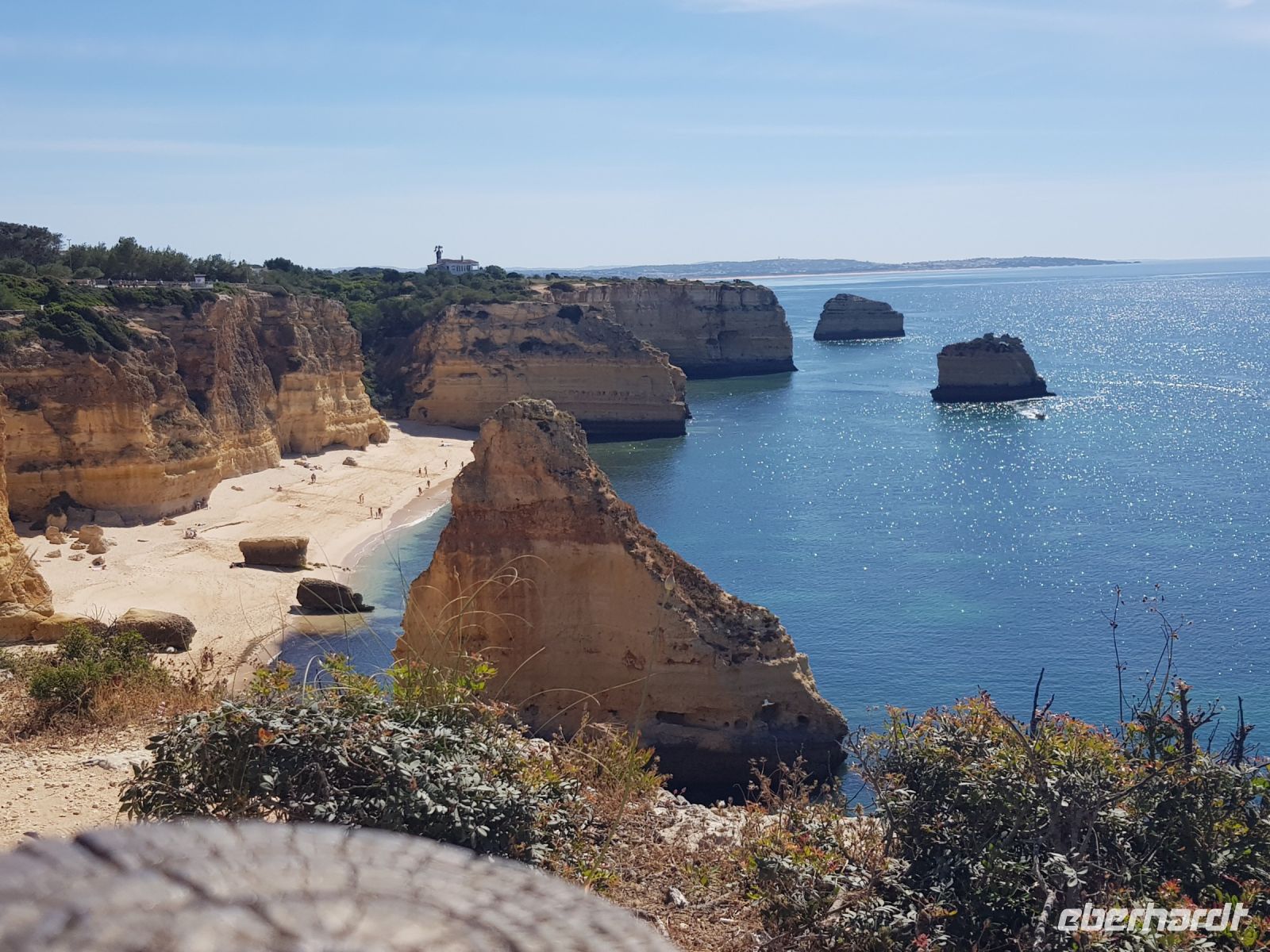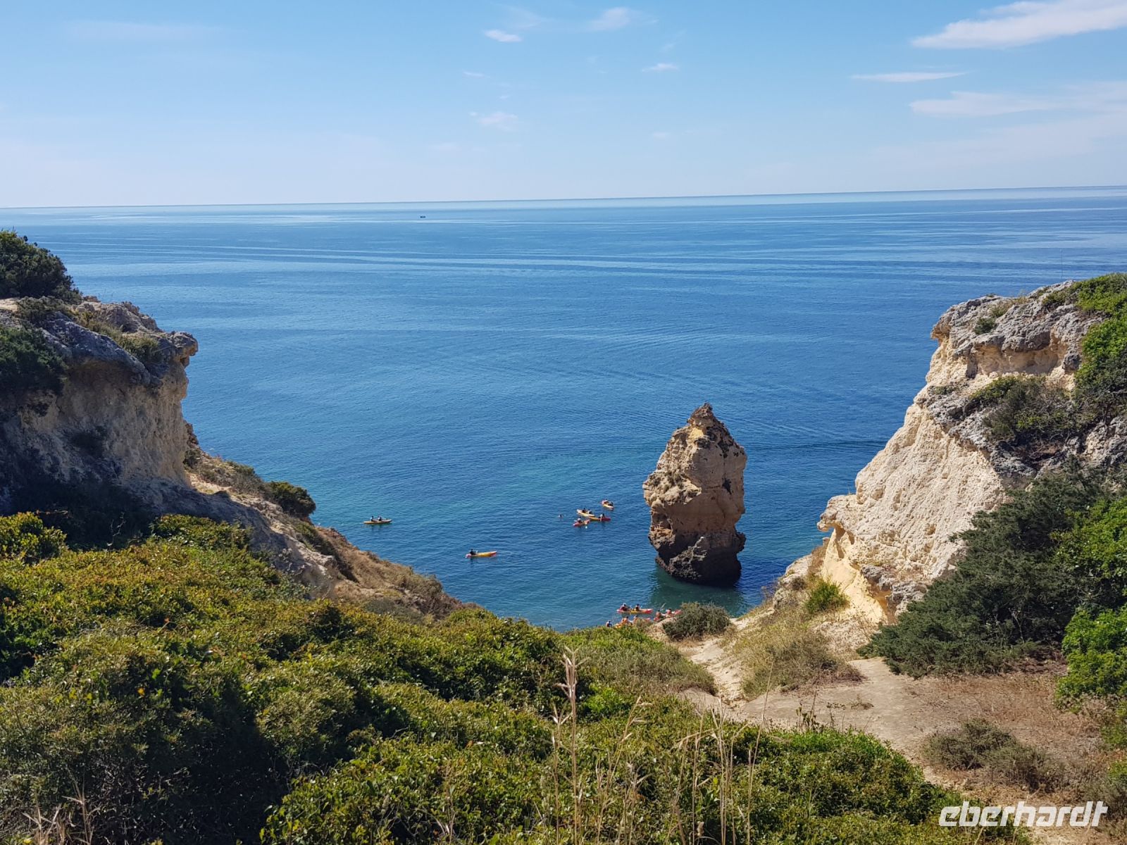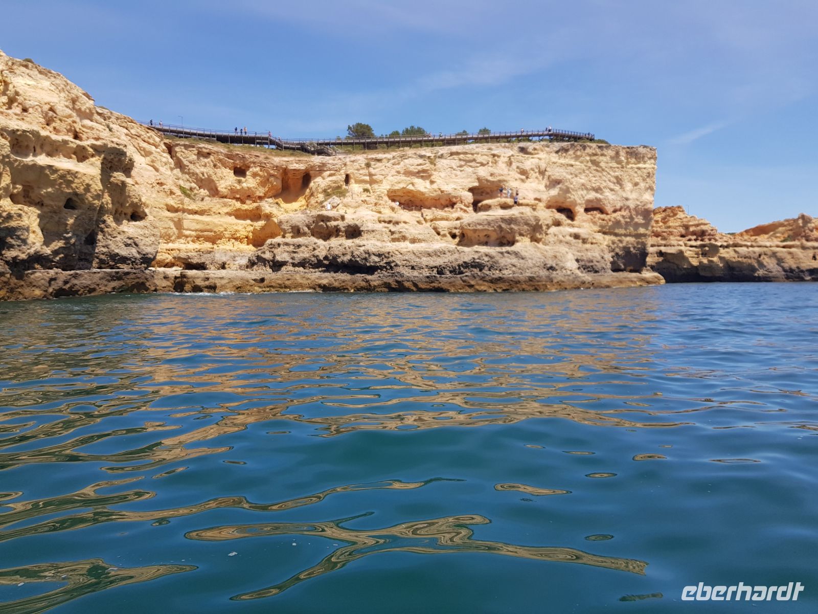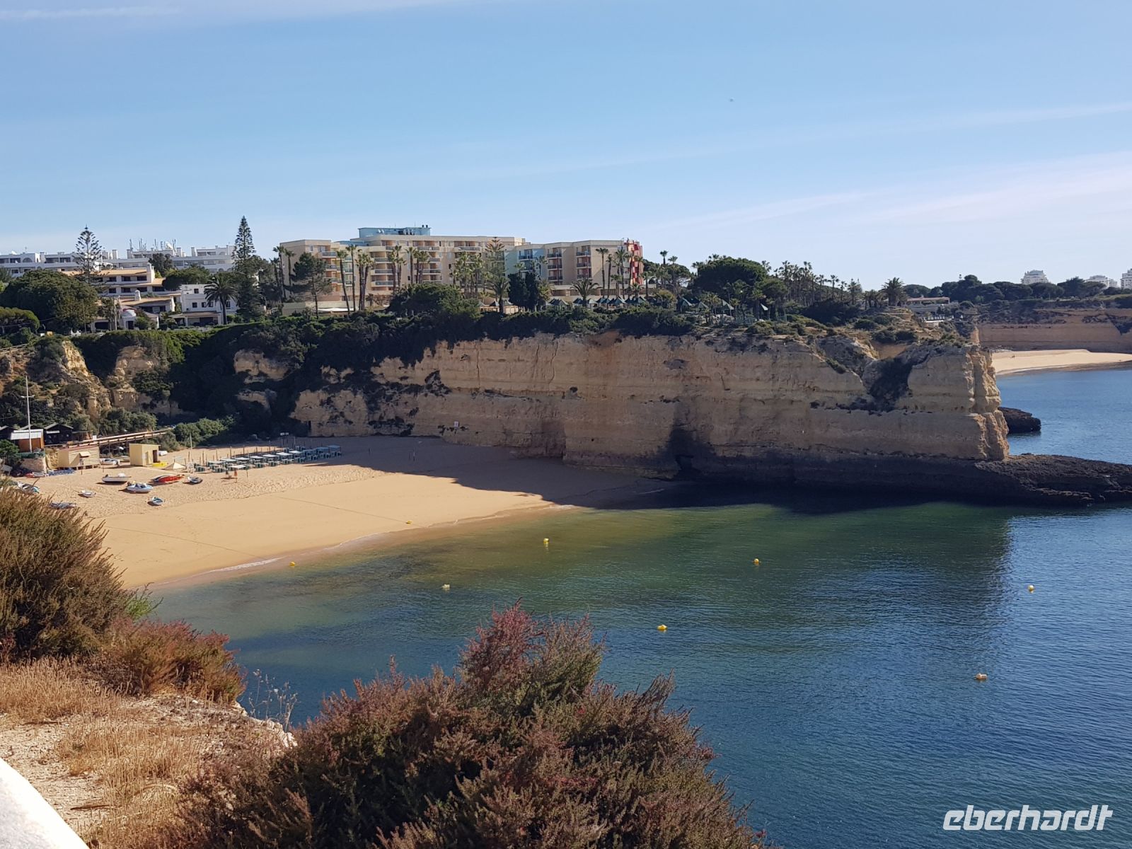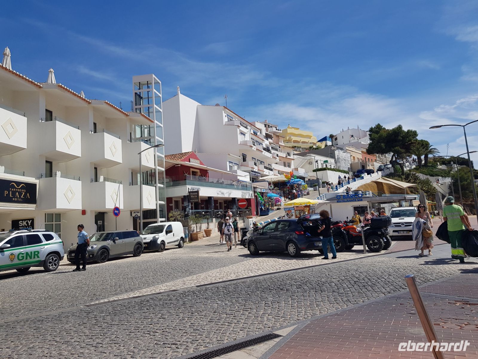 Geduld und Nerven bei der Vorbereitung, diesen Tag optimal zu gestalten. Statt des bestellten Kleinbusses kam ein großer, noch mal 300 g Geduld vom Konto abgehoben! ( wie soll dieser lange Bus an die geplanten Praias fahren können?). Es geht zunächst besser als gedacht. und ein bißchen laufen wollen wir ja auch. Als erste "Perle" ist die Felsenkapelle NOSSA SENHORA DA ROCHA geplant. Die Aussicht auf die Bucht mit ihrem schroffen Felsen ist großartig. Aber es soll noch besser werden, weil als nächste "Perle" eine Wanderung an der "PRAIA DA MARINHA" geplant ist. Aber erst einmal muss man unbedingt fotografieren. Dabei weiter zu laufen ist gar nicht so einfach. SENSATIONELL diese Ausblicke auf die Felsformationen! Das sind genau einige dieser Postkartenmotive! Wir wandern gemütlich in die eine Richtung nach rechts und dann geht es einige Meter den Weg zur Badebucht hinunter bevor es noch in die andere Richtung geht. Man kann sich gar nicht satt sehen an diesen herrlichen Motiven, es ist wie in einem Film. Danach fährt uns der Bus nach CARVOVEIRO - das schönste Fischerdorf an der Algarve. Aber mit so einem großen Bus gibt es Schwierigkeiten durch die engen Gassen zu fahren, die auch schon mal fast zugeparkt sind. Am geplanten Parkplatz vor der ALGAR SECO ( dem Küstenwanderweg aus Holzbohlen) können wir auch nicht parken, die Einbahnstrasse führt uns wieder ins Zentrum. Also machen wir die Wanderung andersherum, ist auch nicht so schlimm, wir müssen den Weg nur hin (vom Zentrum des Dorfes den Berg hinauf zur Algar Seco) und dann wieder zurückgehen. Aber diese 3."Perle" ALGAR SECO mit ihren Buchten, die man teilweise hinabsteigen kann, ist es wert!