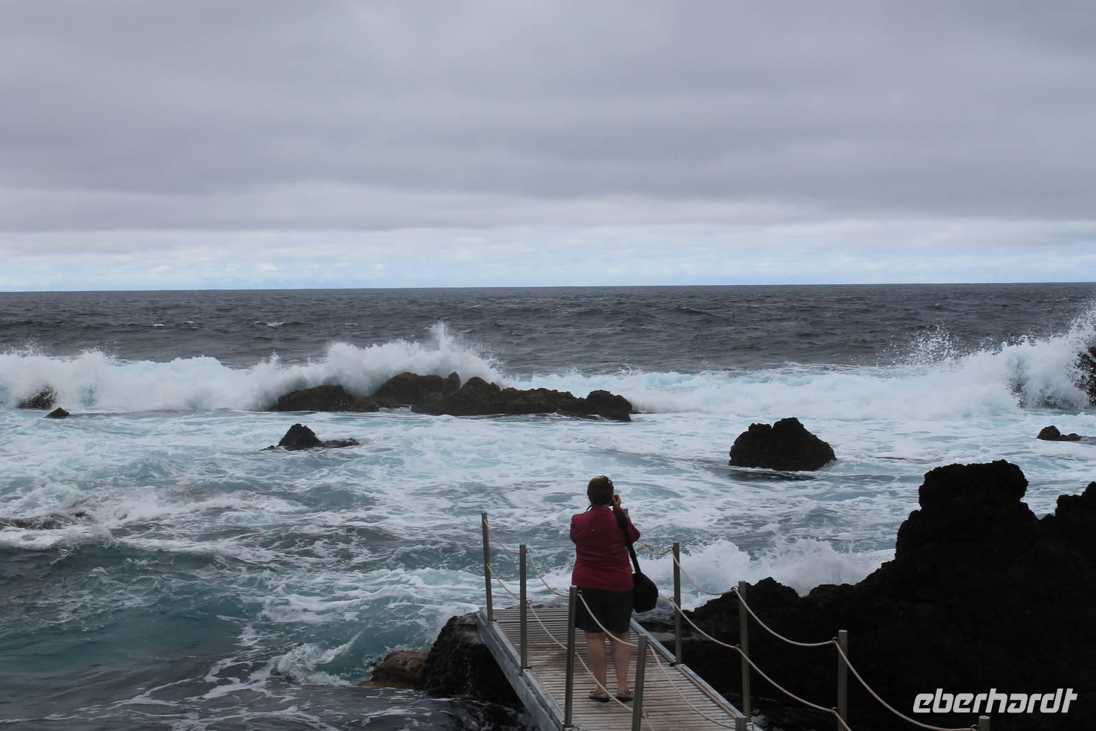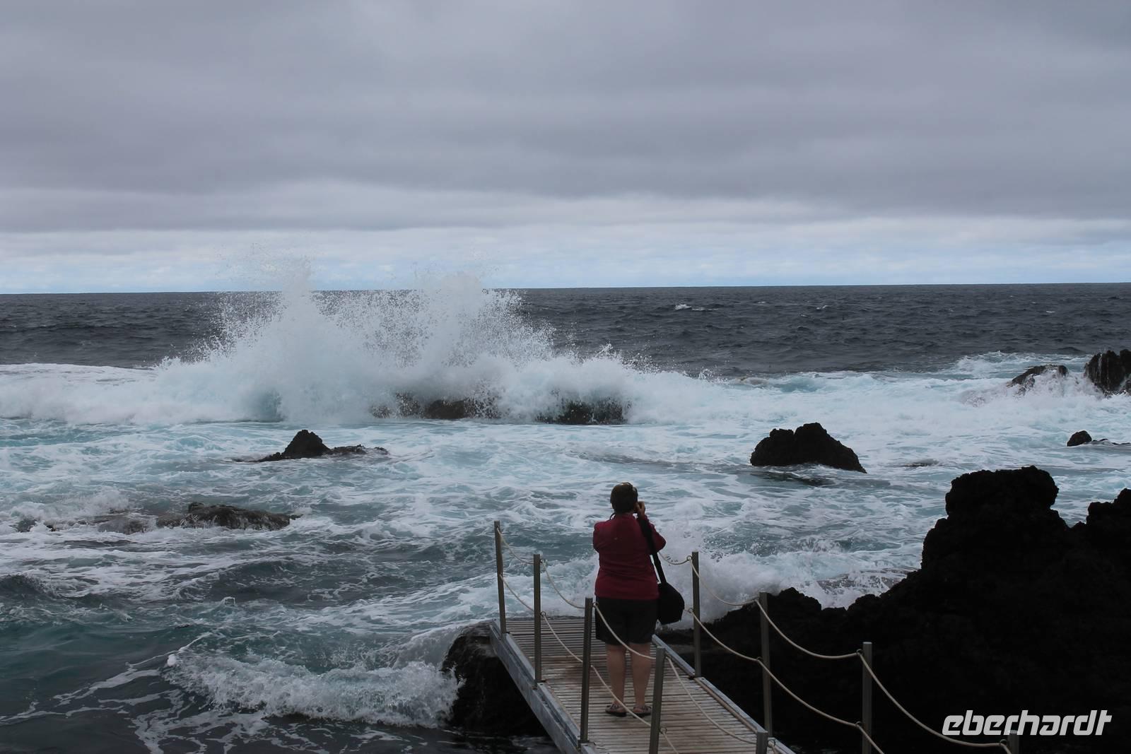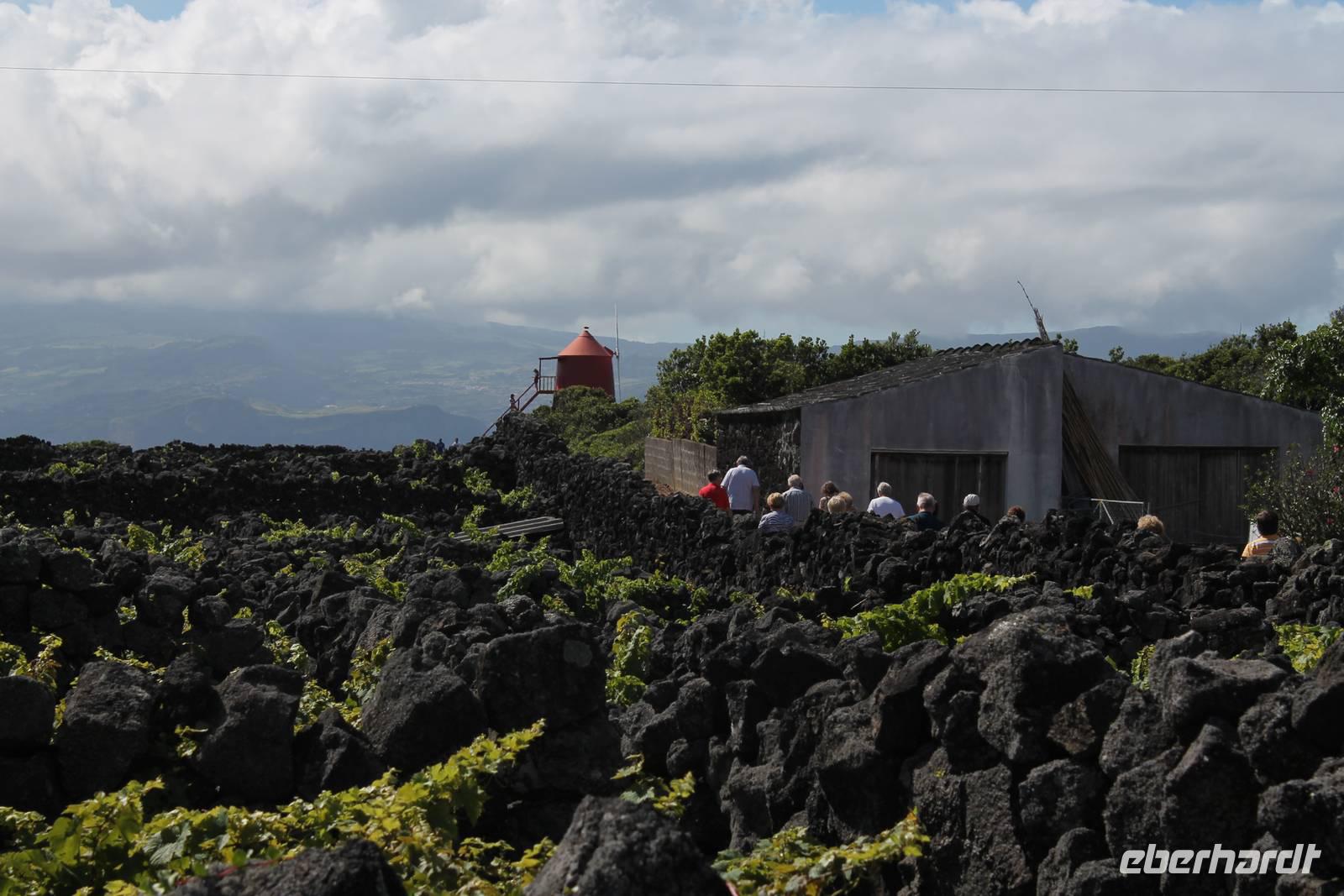 Nach diesem tollen Erlebnis ging es weiter Richtung Biscoitos, wo wir am Weinmuseum stoppten. Zuerst erzählte Paula viel über die Geschichte des Weinanbaus und wir warfen einen Blick in das kleine Museum. Dann konnten 3 Weine verkostet werden: Verdelho als Tafelwein, Chico Maria und Angelica - natürlich mit steigendem Alkoholgehalt . Im Anschluss daran fuhren wir zu den Meeresschwimmbecken. Dort legten wir auf Einladung von Eberhardt TRAVEL eine Kaffeepause mit Dona Amelia-Kuchen ein, der wohl berühmteste Kuchen der Azoren. Nach der Rückfahrt entlang der Westküste waren wir
