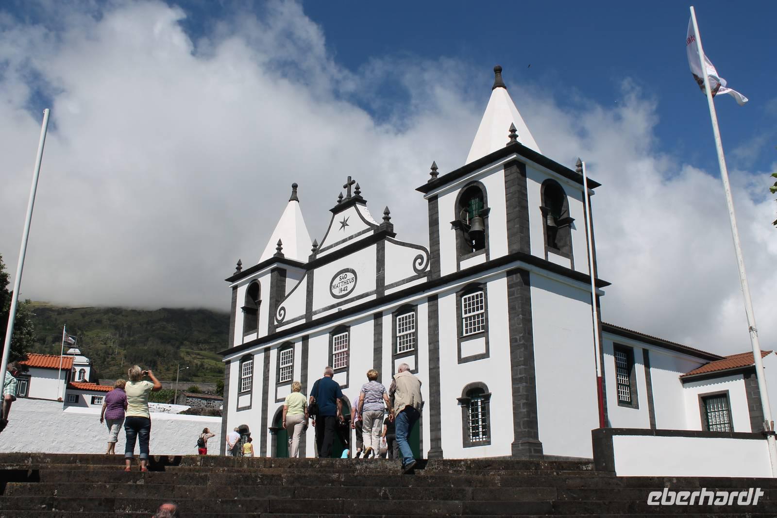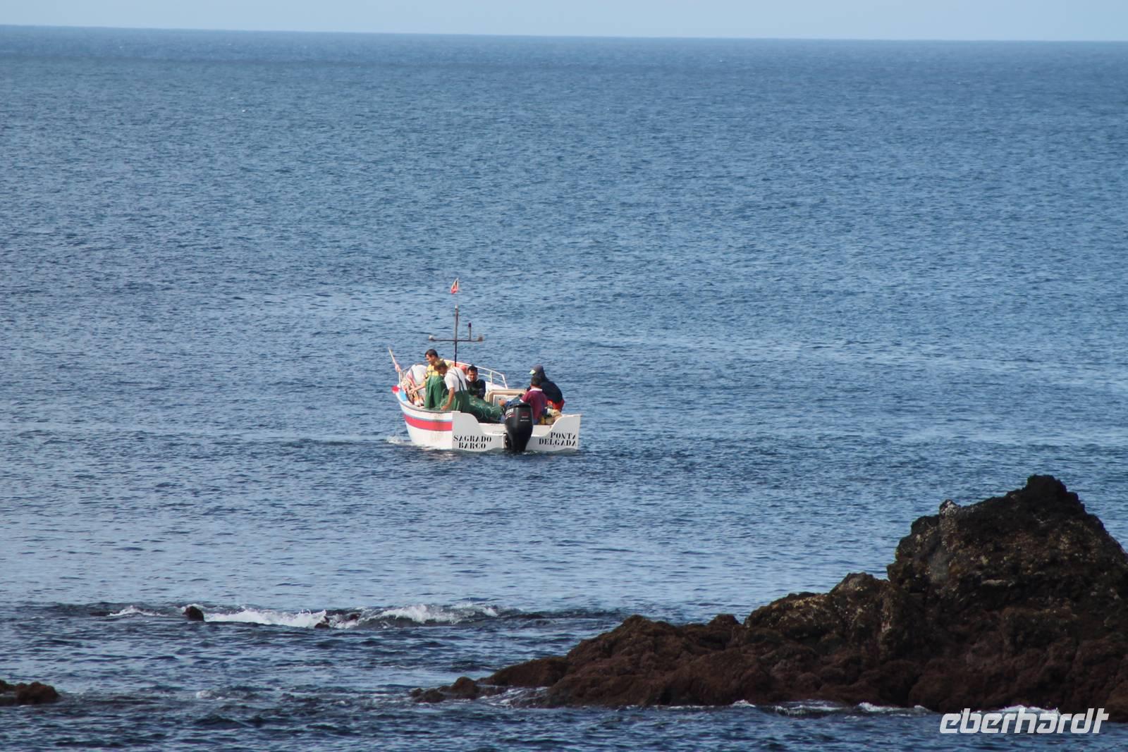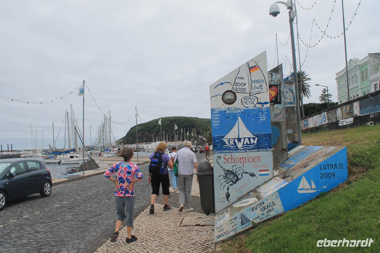 Da es erst Vormittag war, starteten wir bereits am Flughafen zu unserer Inselrundfahrt auf Faial - Richtung Westen. Den ersten Stopp legten wir an der Handarbeitsschule ein, wo Schmuck, Tischdecken usw. aus den verschiedensten Materialien hergestellt, verkauft werden. Weiter ging es nach nach Capelinhos, wo wir das Informationszentrum zum Vulkanausbruch des gleichnamigen Vulkans 1957-1958 besuchten. Ein Jahr lang spuckte der Vulkan hier Asche und Lava aus - die Giebel der ehemaligen Dorfhäuser sieht man heute teilweise unter der Asche heraus ragen. In diesem Zentrum informieren ein 3-D-Film, ein „normaler" Film sowie diverse Ausstellungen über die Entstehung der Azoren, den Aufbau und Ausbruch von Vulkanen auf den Azoren und weltweit. Zum Schluss warfen wir einen Blick auf das „neue Land" vom Außengelände des alten Leuchtturms aus, dessen Erdgeschoss heute noch von der Asche bedeckt ist. Nach diesem beeindruckenden Besuch führte unsere Fahrt nach Praia do Norte, wo wir unsere Mittagspause in einem kleinen Restaurant mit Meerblick einlegten. Frisch gestärkt ging es weiter zum Krater Caldeira - bei schönstem Wetter hatten wir eine tolle Sicht in den Krater und auch zum Pico auf der gleichnamigen Nachbarinsel, dem mit 2.351 Metern höchsten Berg Portugals. Auf dem Rückweg begegneten uns wie selbstverständlich Kühe auf der Straße, und nicht nur 2 oder 3, sondern eine ganze Herde . Unsere Fahrt in die Hauptstadt Horta führte uns entlang des flämischen Tals zum Aussichtspunkt „Miradouro Nossa Senhora da Conceicao" mit tollem Blick auf Horta. Nach der Ankunft im Hotel unternahmen einige schon einen ersten Spaziergang entlang der berühmten Hafenmauer, an der sich die Weltumsegler oder Atlantiküberquerer bei ihrem Stopp in Horta verewigen. Viele aus der Reisegruppe begleiteten mich am Abend in das um die Ecke liegende Restaurant „Canto da Doca", wo wir vom heißen Lavastein aßen - ein tolles und vor allem sehr schmackhaftes Erlebnis. Einige probieren mit mir hier auch den erfrischenden portugiesischen Vinho Verde, zu deutsch: Grüner Wein.