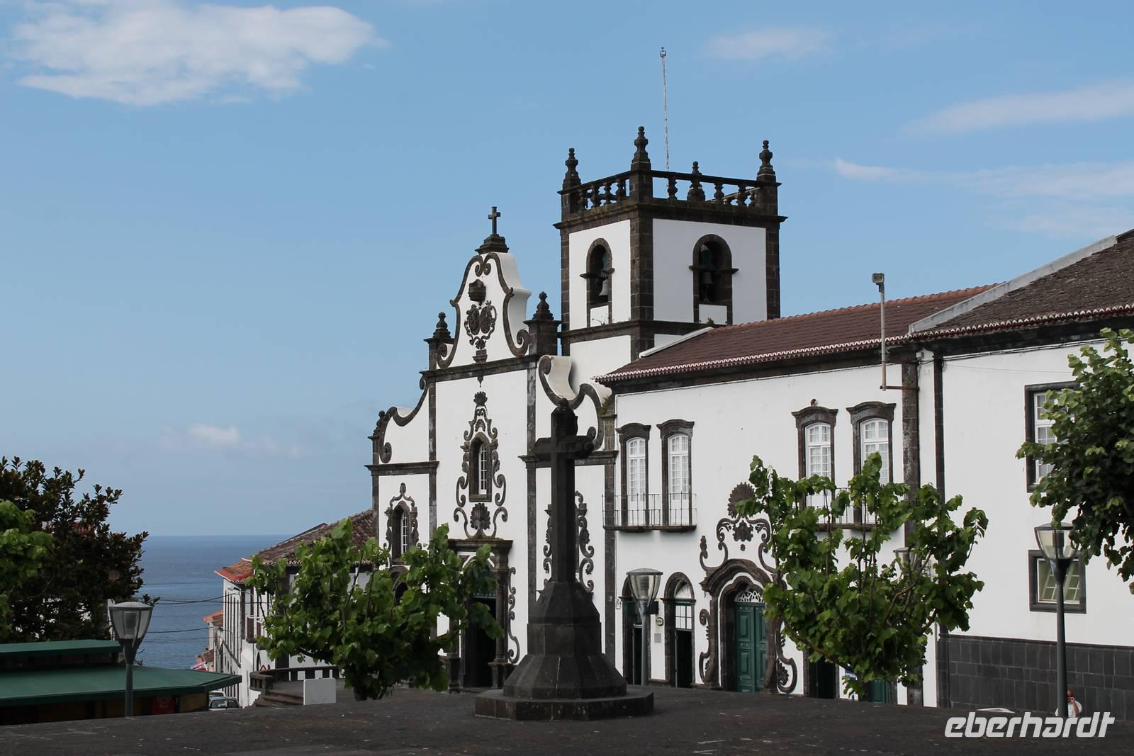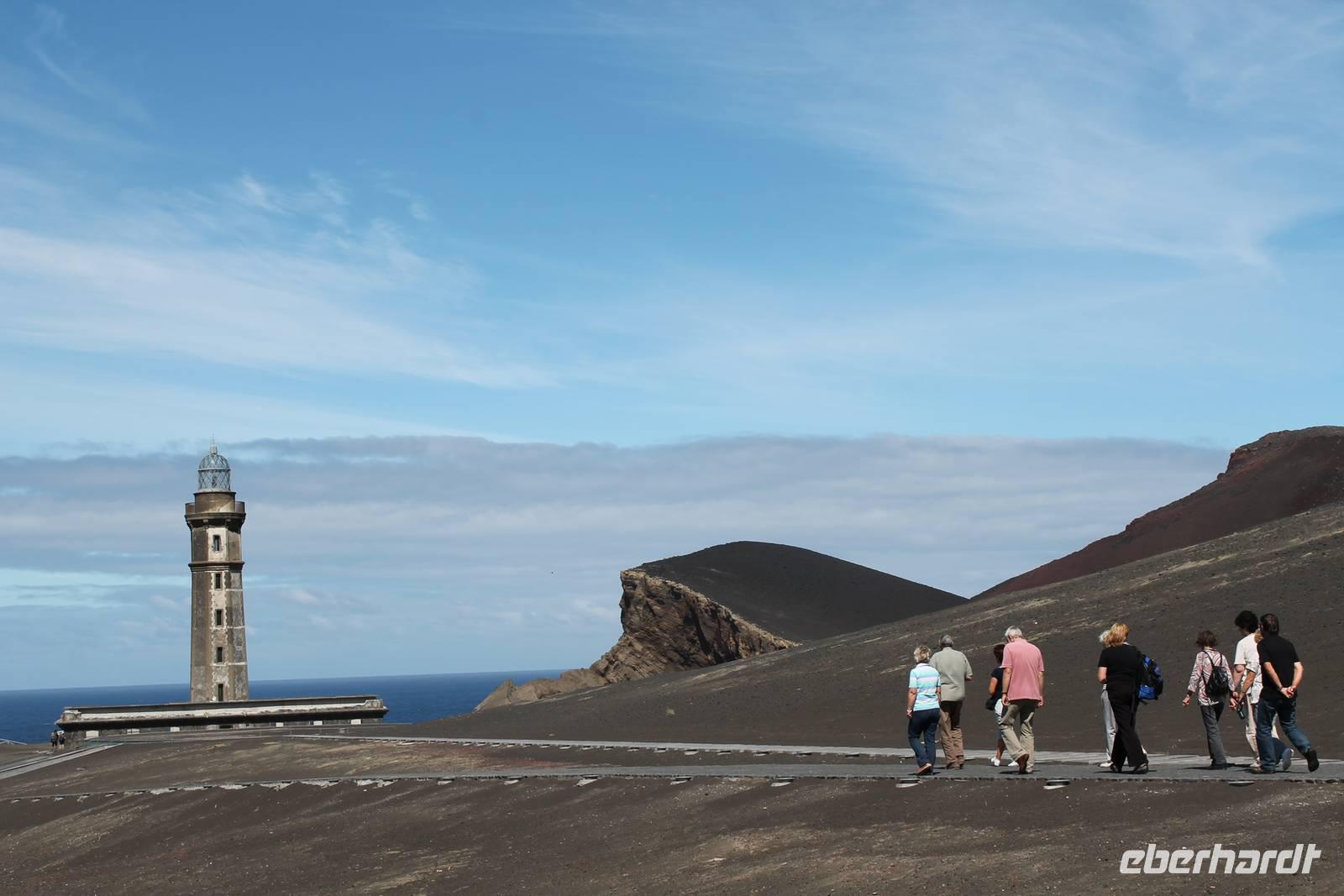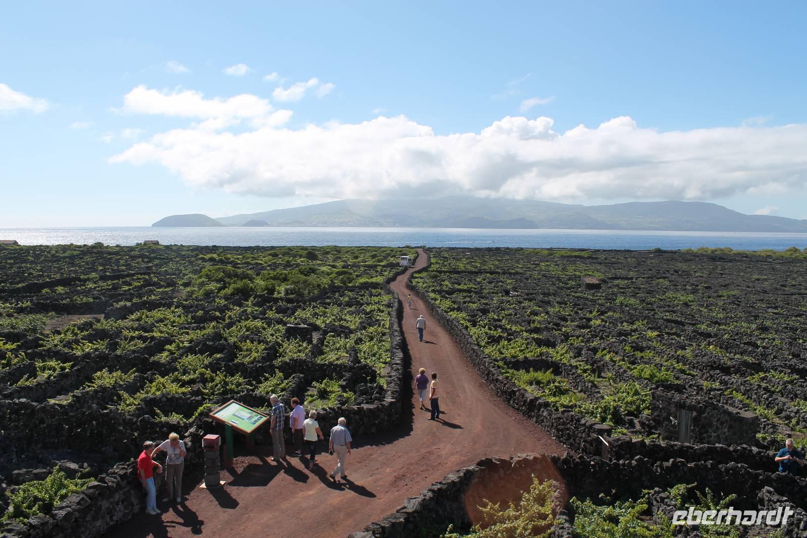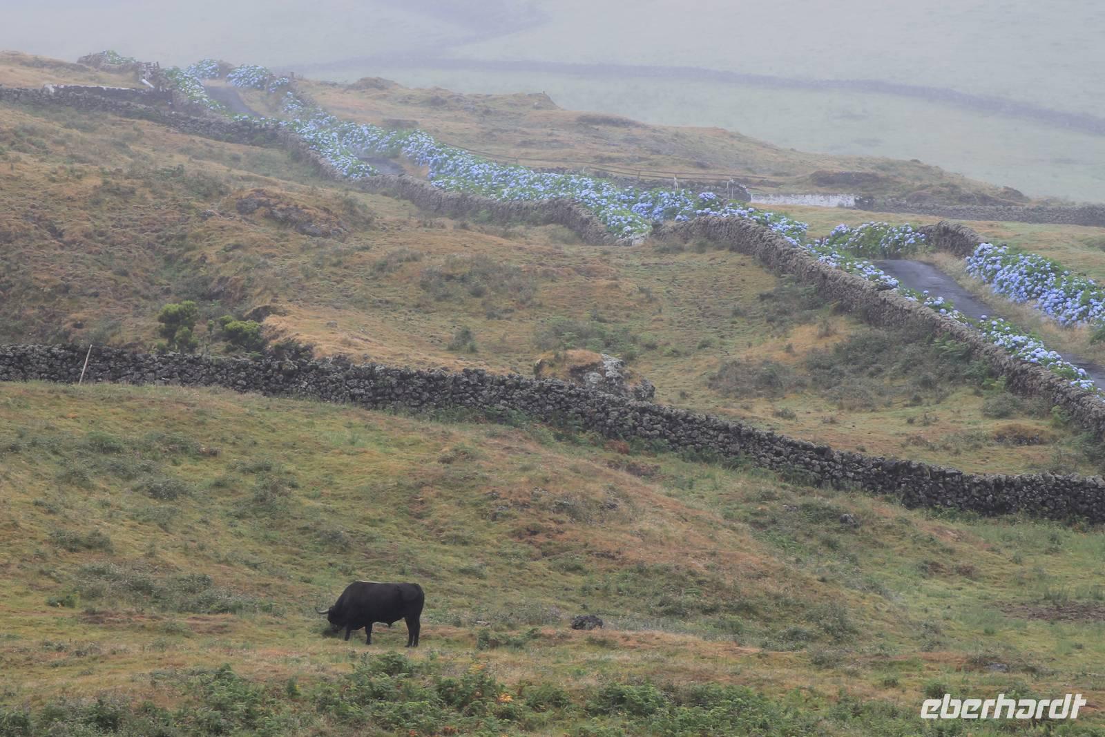 Da es erst Vormittag war, starteten wir bereits am Flughafen zu unserer Inselrundfahrt auf Faial - Richtung Westen. Den ersten Stopp legten wir an der Handarbeitsschule ein, wo Schmuck, Tischdecken usw. aus den verschiedensten Materialien hergestellt, verkauft werden. Weiter ging es nach nach Capelinhos, wo wir das Informationszentrum zum Vulkanausbruch des gleichnamigen Vulkans 1957-1958 besuchten. Ein Jahr lang spuckte der Vulkan hier Asche und Lava aus - die Giebel der ehemaligen Dorfhäuser sieht man heute teilweise unter der Asche heraus ragen. In diesem Zentrum informieren ein 3-D-Film, ein „normaler" Film sowie diverse Ausstellungen über die Entstehung der Azoren, den Aufbau und Ausbruch von Vulkanen auf den Azoren und weltweit. Zum Schluss warfen wir einen Blick auf das „neue Land" vom Außengelände des alten Leuchtturms aus, dessen Erdgeschoss heute noch von der Asche bedeckt ist. Nach diesem beeindruckenden Besuch führte unsere Fahrt nach Praia do Norte, wo wir unsere Mittagspause in einem kleinen Restaurant mit Meerblick einlegten. Frisch gestärkt ging es weiter zum Krater Caldeira - bei schönstem Wetter hatten wir eine tolle Sicht in den Krater und auch zum Pico auf der gleichnamigen Nachbarinsel, dem mit 2.351 Metern höchsten Berg Portugals. Auf dem Rückweg begegneten uns wie selbstverständlich Kühe auf der Straße, und nicht nur 2 oder 3, sondern eine ganze Herde . Unsere Fahrt in die Hauptstadt Horta führte uns entlang des flämischen Tals zum Aussichtspunkt „Miradouro Nossa Senhora da Conceicao" mit tollem Blick auf Horta. Nach der Ankunft im Hotel unternahmen einige schon einen ersten Spaziergang entlang der berühmten Hafenmauer, an der sich die Weltumsegler oder Atlantiküberquerer bei ihrem Stopp in Horta verewigen. Viele aus der Reisegruppe begleiteten mich am Abend in das um die Ecke liegende Restaurant „Canto da Doca", wo wir vom heißen Lavastein aßen - ein tolles und vor allem sehr schmackhaftes Erlebnis. Einige probieren mit mir hier auch den erfrischenden portugiesischen Vinho Verde, zu deutsch: Grüner Wein.