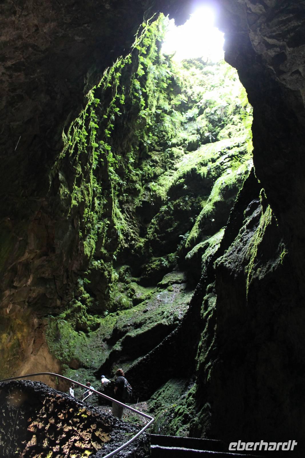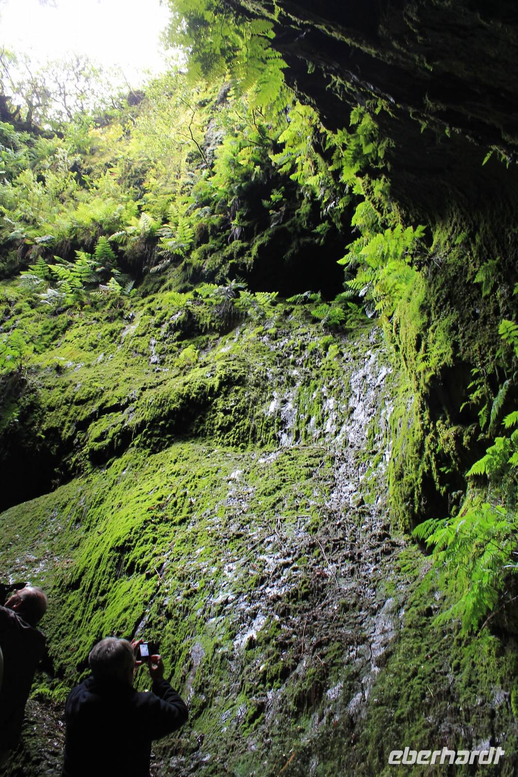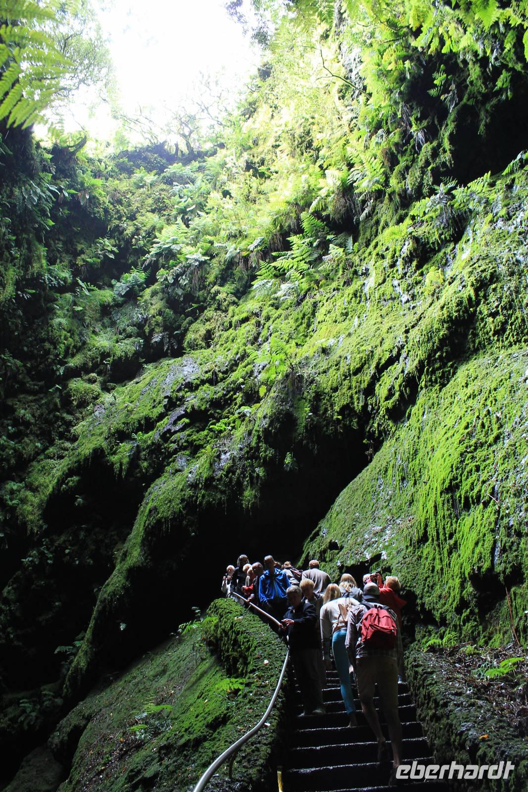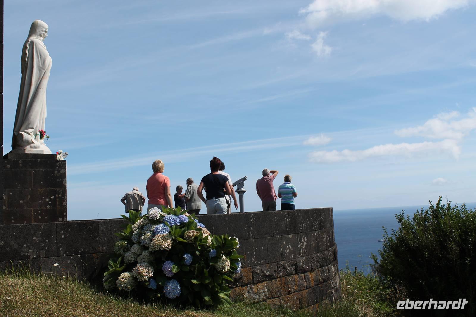 Auch das Frühstück in diesem Hotel bot für jeden Geschmack etwas, und dazu noch einen wunderbaren Meerblick. Leider nieselte es bei unserem Start zur Inselrundfahrt mit Paula. Wir fuhren zum Hausberg der unter UNESCO-Schutz stehenden Hauptstadt Terceiras, Angra do Heroismo, dem Monte Brasil. Die Festung auf dem Monte Brasil wurde im 17. Jahrhundert von den Spaniern gebaut, und ist heute mit 4 Kilometer langen Mauern die größte spanische Festung außerhalb Spaniens. Der Krater des Monte Brasil wird heute als Schießübungsplatz genutzt. Leider hatte man aufgrund des Wetters vom Monte Brasil keine gute Sicht. Den nächsten Stopp legten wir am Kloster des Klarissenordens ein. Da es regnete, fuhren wir mit dem Bus zum Rathaus und Paula legte für uns eine Geschichtsstunde ein - sie erklärte uns die wichtigsten geschichtlichen Daten - sehr interessant und in wunderbarem Ambiente in einem sehr feinen Saal. Weiter ging es bei unserem Rundgang zur Sé Catedral mit einem besonders hübschen Lesepult aus dem 17. Jahrhundert, welches aus tropischen Hölzern mit Intarsienarbeiten aus Walknochen verziert ist. Im Palacio dos Capitaes Generais, einstiger Amtssitz der Generalkapitäne und heute Herberge einiger Ämter, zeigte uns Paula die verschiedenen Räume, z.B. auch den „Saal der häßlichen Gesichter". Nach der Besichtigung der Kirche „Igreja Nossa Senhora da Guia" spazierten wir als Abschluss durch den Jardim Publico, in dem man neben Rosen und Magnolien auch einen Kaffeebaum findet. Da es immer noch regnete, gingen wir recht zügig zum Bus und fuhren Richtung Praia da Vitoria, immer an der Küste entlang. In Sao Sebastiao statteten wir der Pfarrkirche und der Heilig-Geist-Kapelle einen Besuch ab. In Praia da Vitoria begaben wir uns zunächst zur Anhöhe mit der Statue Muttergottes, um einen schönen Blick auf die Stadt zu bekommen. Dann legten wir an der Uferpromenade unsere Mittagspause ein. Dort kam uns der Service doch recht langsam vor. Aber jeder hatte etwas gefunden und so führten wir unser Programm fort: die Vulkanhöhle „Algar do Carvao" erwartete unseren Besuch. Insgesamt 357 Stufen unterschiedlicher Höhe sind zu absolvieren, wenn man bis ganz nach unten möchte, allerdings ist bereits der erste Blick entlang der Felswände nach oben durch den 45 Meter hohen Vulkanschlot nach den ersten wenigen Stufen sehr beeindruckend.