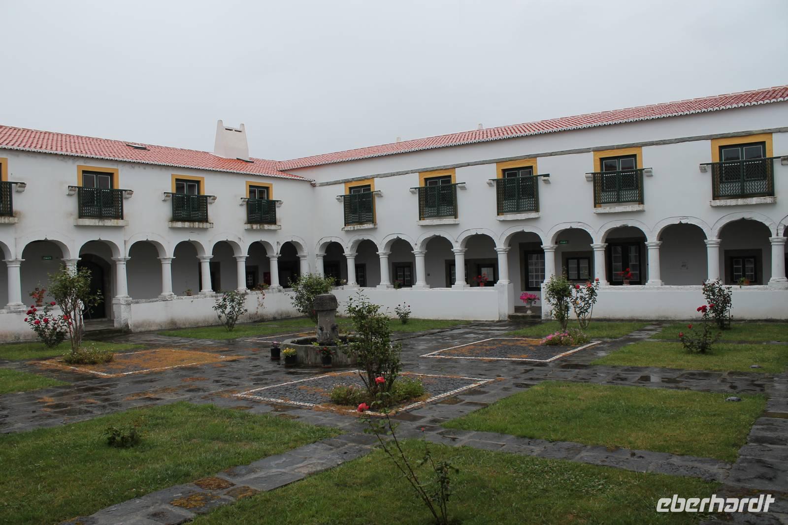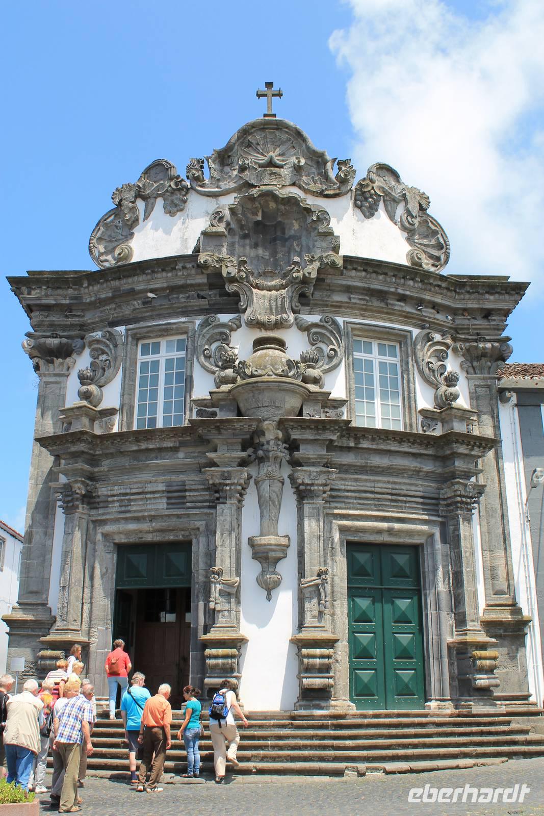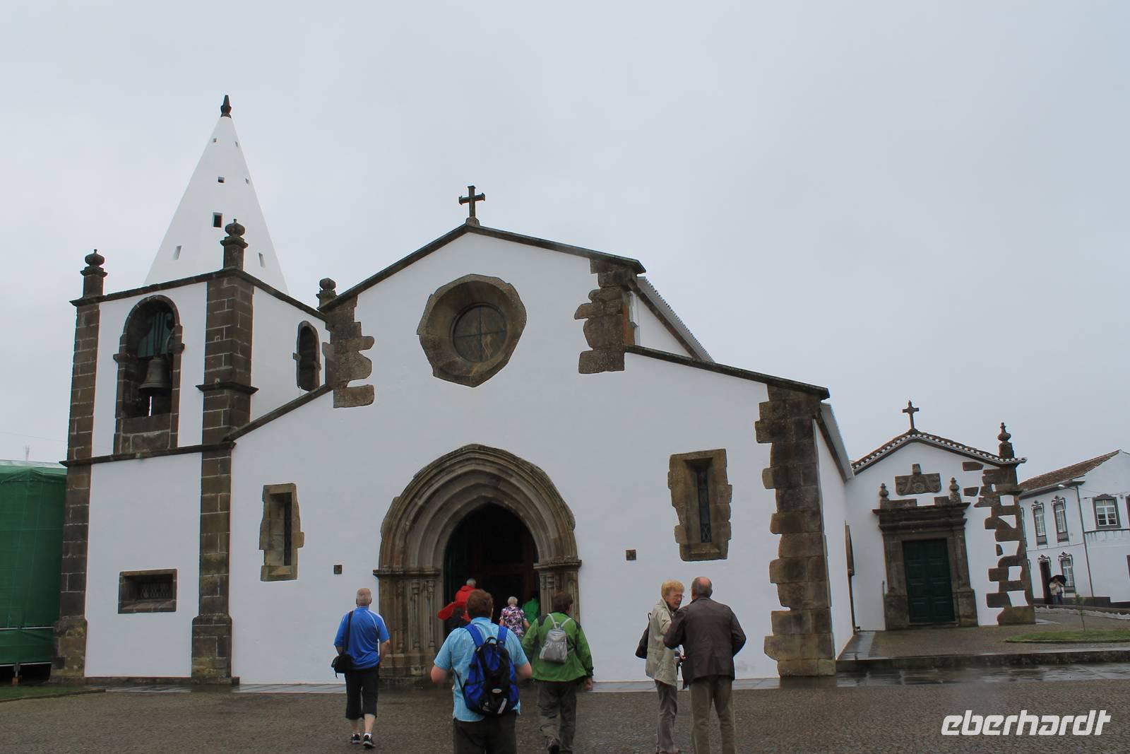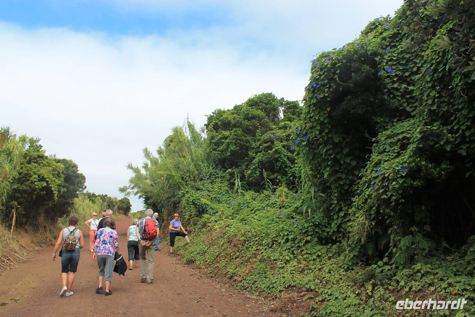 Auch das Frühstück in diesem Hotel bot für jeden Geschmack etwas, und dazu noch einen wunderbaren Meerblick. Leider nieselte es bei unserem Start zur Inselrundfahrt mit Paula. Wir fuhren zum Hausberg der unter UNESCO-Schutz stehenden Hauptstadt Terceiras, Angra do Heroismo, dem Monte Brasil. Die Festung auf dem Monte Brasil wurde im 17. Jahrhundert von den Spaniern gebaut, und ist heute mit 4 Kilometer langen Mauern die größte spanische Festung außerhalb Spaniens. Der Krater des Monte Brasil wird heute als Schießübungsplatz genutzt. Leider hatte man aufgrund des Wetters vom Monte Brasil keine gute Sicht. Den nächsten Stopp legten wir am Kloster des Klarissenordens ein. Da es regnete, fuhren wir mit dem Bus zum Rathaus und Paula legte für uns eine Geschichtsstunde ein - sie erklärte uns die wichtigsten geschichtlichen Daten - sehr interessant und in wunderbarem Ambiente in einem sehr feinen Saal. Weiter ging es bei unserem Rundgang zur Sé Catedral mit einem besonders hübschen Lesepult aus dem 17. Jahrhundert, welches aus tropischen Hölzern mit Intarsienarbeiten aus Walknochen verziert ist. Im Palacio dos Capitaes Generais, einstiger Amtssitz der Generalkapitäne und heute Herberge einiger Ämter, zeigte uns Paula die verschiedenen Räume, z.B. auch den „Saal der häßlichen Gesichter". Nach der Besichtigung der Kirche „Igreja Nossa Senhora da Guia" spazierten wir als Abschluss durch den Jardim Publico, in dem man neben Rosen und Magnolien auch einen Kaffeebaum findet. Da es immer noch regnete, gingen wir recht zügig zum Bus und fuhren Richtung Praia da Vitoria, immer an der Küste entlang. In Sao Sebastiao statteten wir der Pfarrkirche und der Heilig-Geist-Kapelle einen Besuch ab. In Praia da Vitoria begaben wir uns zunächst zur Anhöhe mit der Statue Muttergottes, um einen schönen Blick auf die Stadt zu bekommen. Dann legten wir an der Uferpromenade unsere Mittagspause ein. Dort kam uns der Service doch recht langsam vor. Aber jeder hatte etwas gefunden und so führten wir unser Programm fort: die Vulkanhöhle „Algar do Carvao" erwartete unseren Besuch. Insgesamt 357 Stufen unterschiedlicher Höhe sind zu absolvieren, wenn man bis ganz nach unten möchte, allerdings ist bereits der erste Blick entlang der Felswände nach oben durch den 45 Meter hohen Vulkanschlot nach den ersten wenigen Stufen sehr beeindruckend.