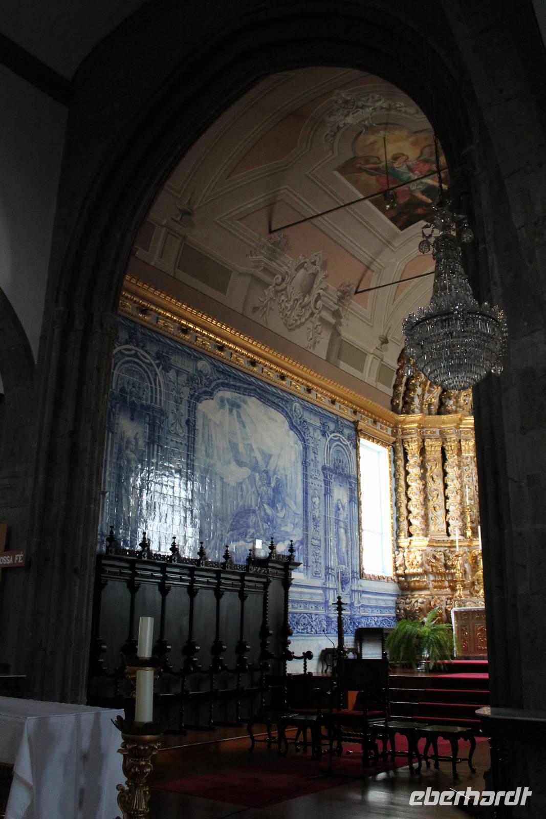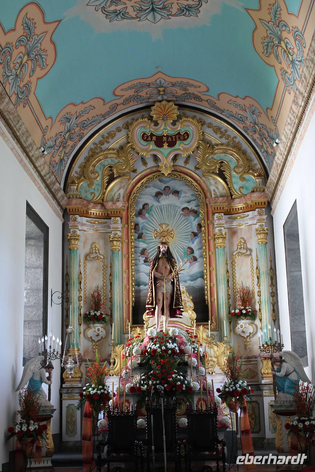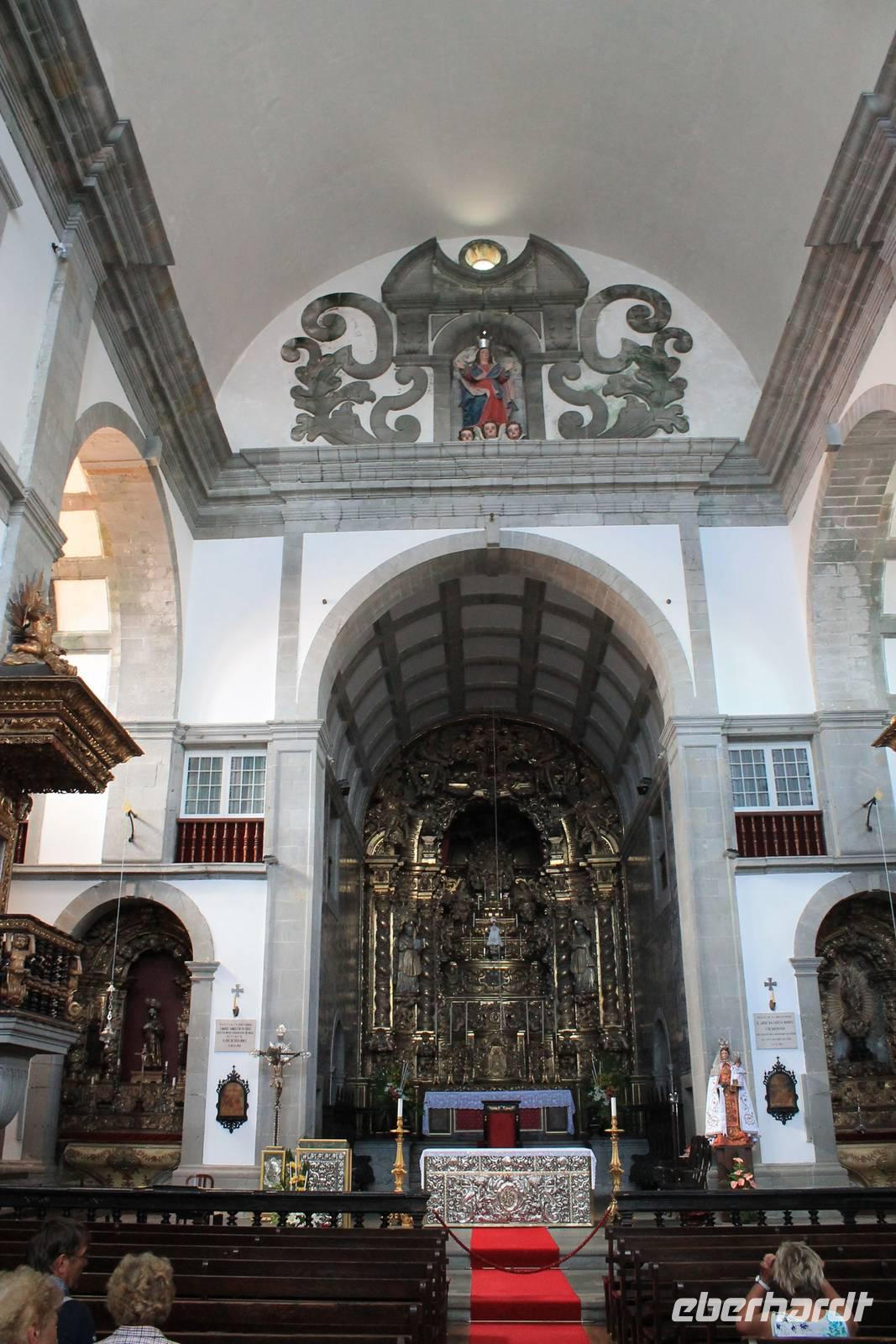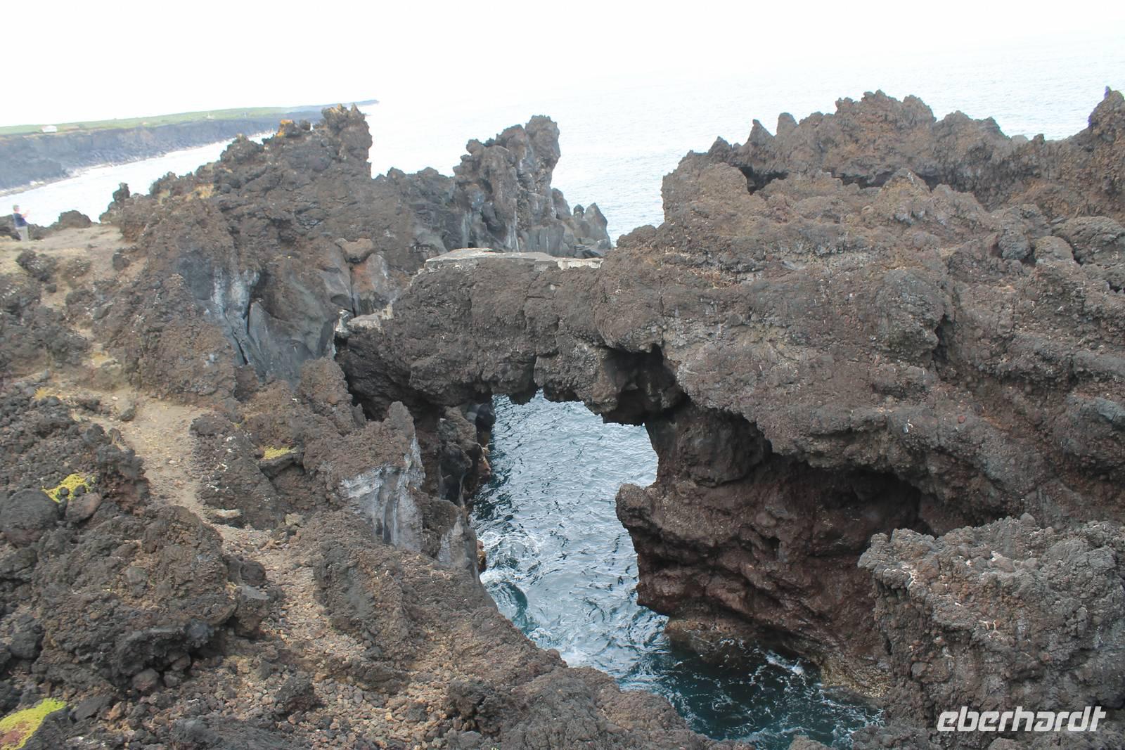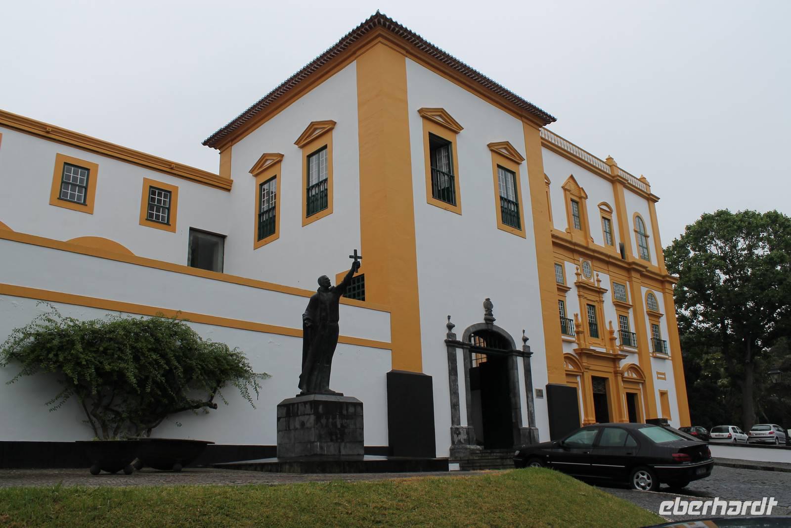 Auch das Frühstück in diesem Hotel bot für jeden Geschmack etwas, und dazu noch einen wunderbaren Meerblick. Leider nieselte es bei unserem Start zur Inselrundfahrt mit Paula. Wir fuhren zum Hausberg der unter UNESCO-Schutz stehenden Hauptstadt Terceiras, Angra do Heroismo, dem Monte Brasil. Die Festung auf dem Monte Brasil wurde im 17. Jahrhundert von den Spaniern gebaut, und ist heute mit 4 Kilometer langen Mauern die größte spanische Festung außerhalb Spaniens. Der Krater des Monte Brasil wird heute als Schießübungsplatz genutzt. Leider hatte man aufgrund des Wetters vom Monte Brasil keine gute Sicht. Den nächsten Stopp legten wir am Kloster des Klarissenordens ein. Da es regnete, fuhren wir mit dem Bus zum Rathaus und Paula legte für uns eine Geschichtsstunde ein - sie erklärte uns die wichtigsten geschichtlichen Daten - sehr interessant und in wunderbarem Ambiente in einem sehr feinen Saal. Weiter ging es bei unserem Rundgang zur Sé Catedral mit einem besonders hübschen Lesepult aus dem 17. Jahrhundert, welches aus tropischen Hölzern mit Intarsienarbeiten aus Walknochen verziert ist. Im Palacio dos Capitaes Generais, einstiger Amtssitz der Generalkapitäne und heute Herberge einiger Ämter, zeigte uns Paula die verschiedenen Räume, z.B. auch den „Saal der häßlichen Gesichter". Nach der Besichtigung der Kirche „Igreja Nossa Senhora da Guia" spazierten wir als Abschluss durch den Jardim Publico, in dem man neben Rosen und Magnolien auch einen Kaffeebaum findet. Da es immer noch regnete, gingen wir recht zügig zum Bus und fuhren Richtung Praia da Vitoria, immer an der Küste entlang. In Sao Sebastiao statteten wir der Pfarrkirche und der Heilig-Geist-Kapelle einen Besuch ab. In Praia da Vitoria begaben wir uns zunächst zur Anhöhe mit der Statue Muttergottes, um einen schönen Blick auf die Stadt zu bekommen. Dann legten wir an der Uferpromenade unsere Mittagspause ein. Dort kam uns der Service doch recht langsam vor. Aber jeder hatte etwas gefunden und so führten wir unser Programm fort: die Vulkanhöhle „Algar do Carvao" erwartete unseren Besuch. Insgesamt 357 Stufen unterschiedlicher Höhe sind zu absolvieren, wenn man bis ganz nach unten möchte, allerdings ist bereits der erste Blick entlang der Felswände nach oben durch den 45 Meter hohen Vulkanschlot nach den ersten wenigen Stufen sehr beeindruckend.