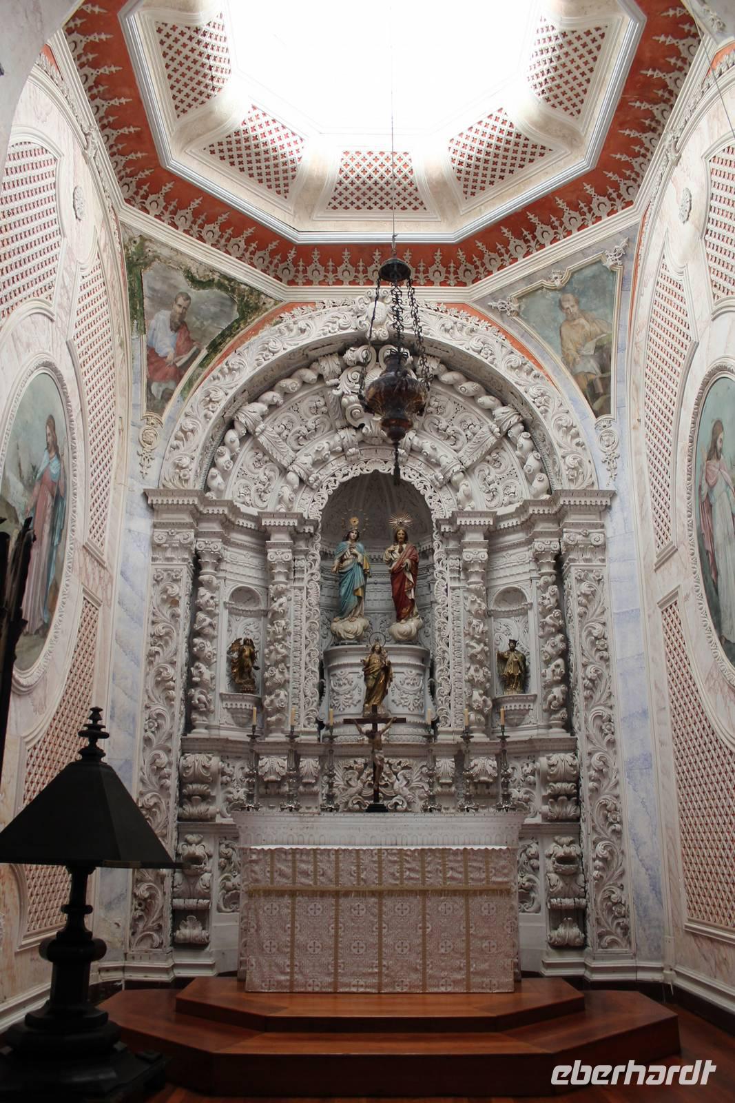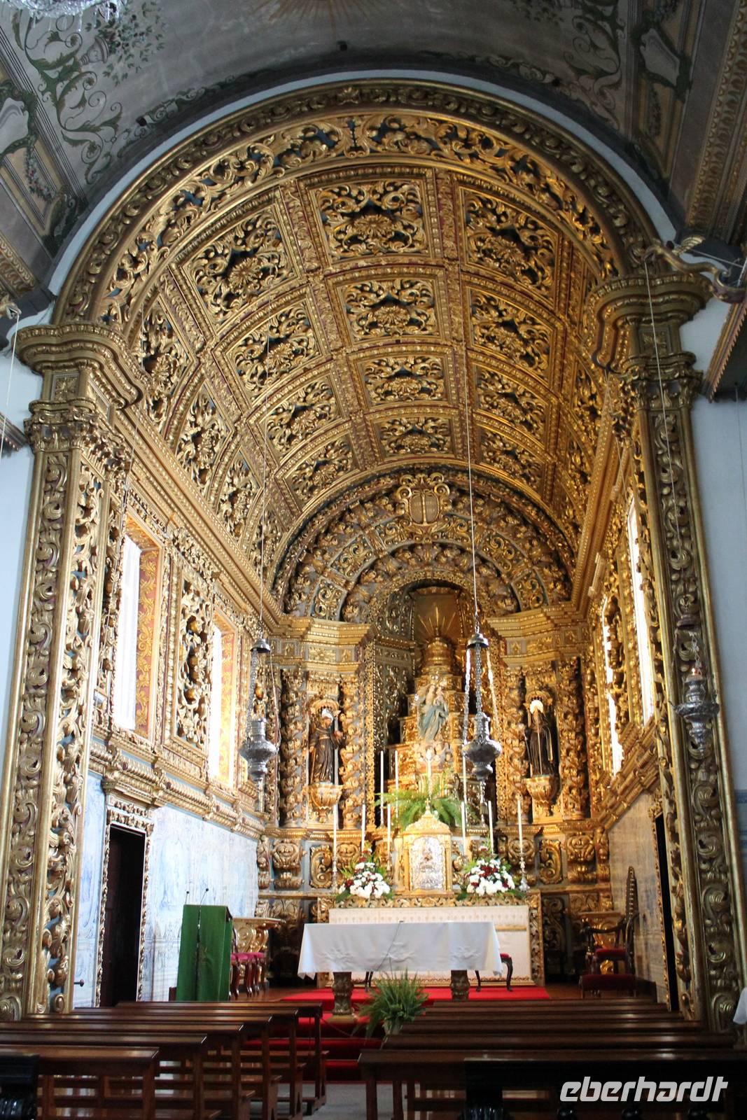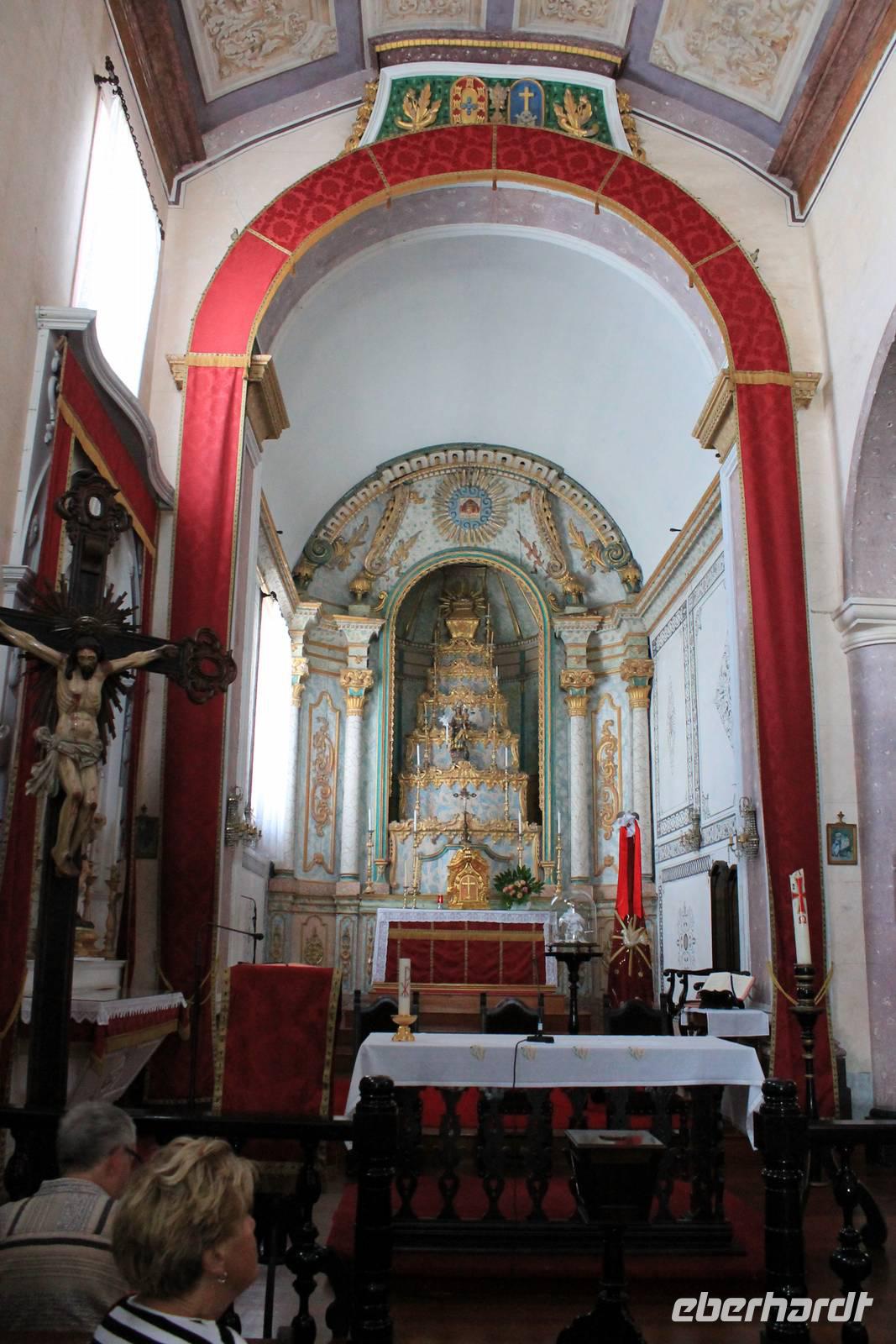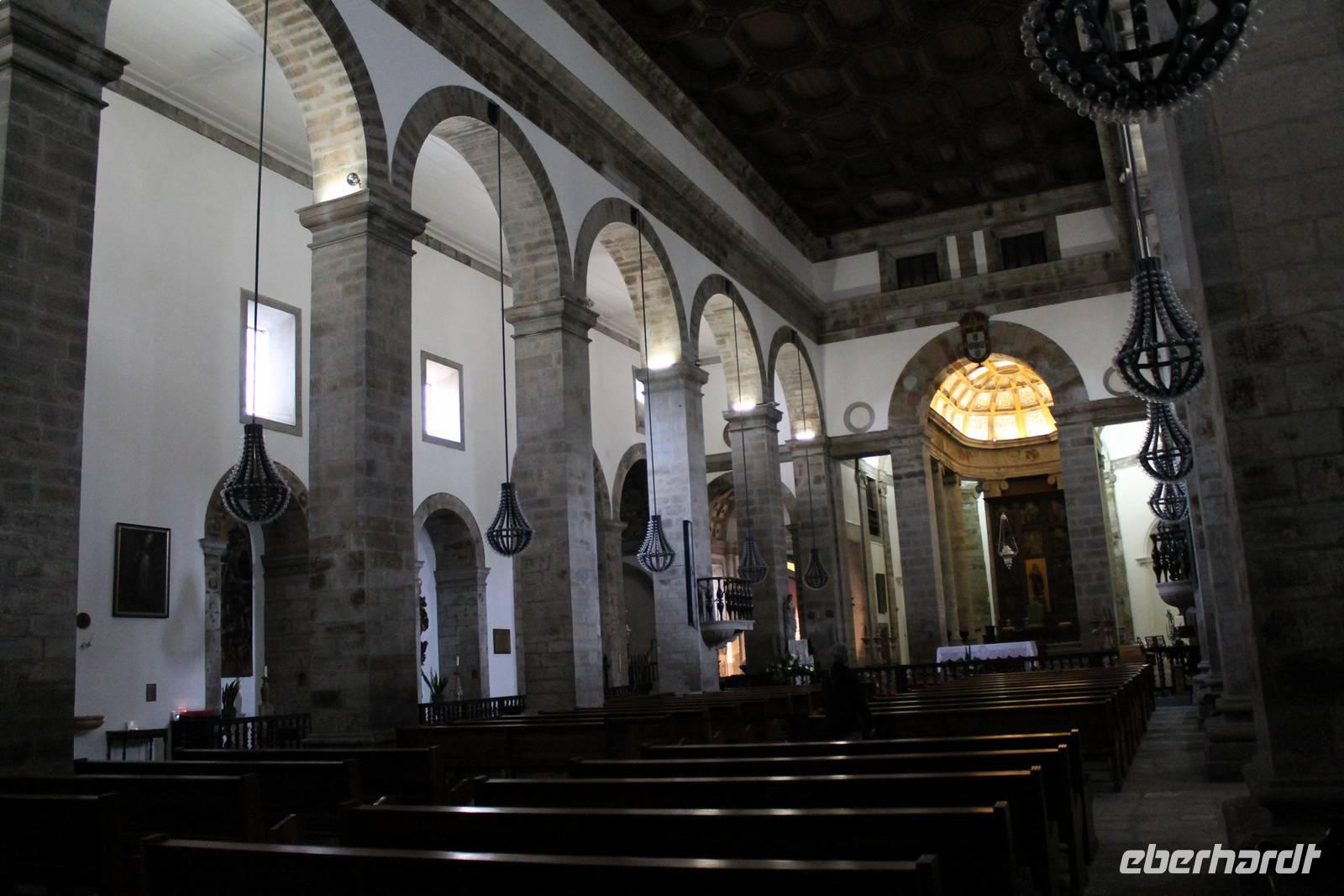 Auch das Frühstück in diesem Hotel bot für jeden Geschmack etwas, und dazu noch einen wunderbaren Meerblick. Leider nieselte es bei unserem Start zur Inselrundfahrt mit Paula. Wir fuhren zum Hausberg der unter UNESCO-Schutz stehenden Hauptstadt Terceiras, Angra do Heroismo, dem Monte Brasil. Die Festung auf dem Monte Brasil wurde im 17. Jahrhundert von den Spaniern gebaut, und ist heute mit 4 Kilometer langen Mauern die größte spanische Festung außerhalb Spaniens. Der Krater des Monte Brasil wird heute als Schießübungsplatz genutzt. Leider hatte man aufgrund des Wetters vom Monte Brasil keine gute Sicht. Den nächsten Stopp legten wir am Kloster des Klarissenordens ein. Da es regnete, fuhren wir mit dem Bus zum Rathaus und Paula legte für uns eine Geschichtsstunde ein - sie erklärte uns die wichtigsten geschichtlichen Daten - sehr interessant und in wunderbarem Ambiente in einem sehr feinen Saal. Weiter ging es bei unserem Rundgang zur Sé Catedral mit einem besonders hübschen Lesepult aus dem 17. Jahrhundert, welches aus tropischen Hölzern mit Intarsienarbeiten aus Walknochen verziert ist. Im Palacio dos Capitaes Generais, einstiger Amtssitz der Generalkapitäne und heute Herberge einiger Ämter, zeigte uns Paula die verschiedenen Räume, z.B. auch den „Saal der häßlichen Gesichter". Nach der Besichtigung der Kirche „Igreja Nossa Senhora da Guia" spazierten wir als Abschluss durch den Jardim Publico, in dem man neben Rosen und Magnolien auch einen Kaffeebaum findet. Da es immer noch regnete, gingen wir recht zügig zum Bus und fuhren Richtung Praia da Vitoria, immer an der Küste entlang. In Sao Sebastiao statteten wir der Pfarrkirche und der Heilig-Geist-Kapelle einen Besuch ab. In Praia da Vitoria begaben wir uns zunächst zur Anhöhe mit der Statue Muttergottes, um einen schönen Blick auf die Stadt zu bekommen. Dann legten wir an der Uferpromenade unsere Mittagspause ein. Dort kam uns der Service doch recht langsam vor. Aber jeder hatte etwas gefunden und so führten wir unser Programm fort: die Vulkanhöhle „Algar do Carvao" erwartete unseren Besuch. Insgesamt 357 Stufen unterschiedlicher Höhe sind zu absolvieren, wenn man bis ganz nach unten möchte, allerdings ist bereits der erste Blick entlang der Felswände nach oben durch den 45 Meter hohen Vulkanschlot nach den ersten wenigen Stufen sehr beeindruckend.