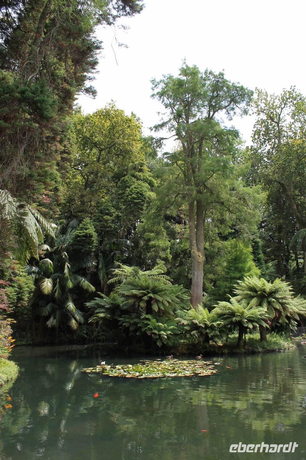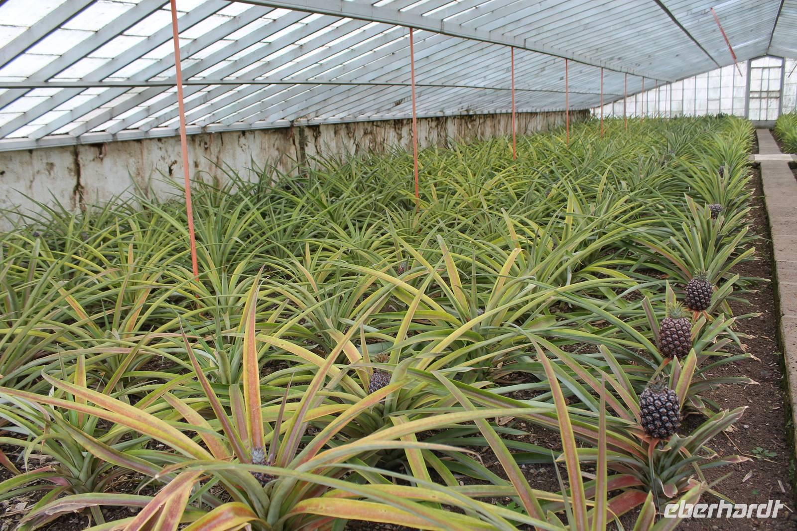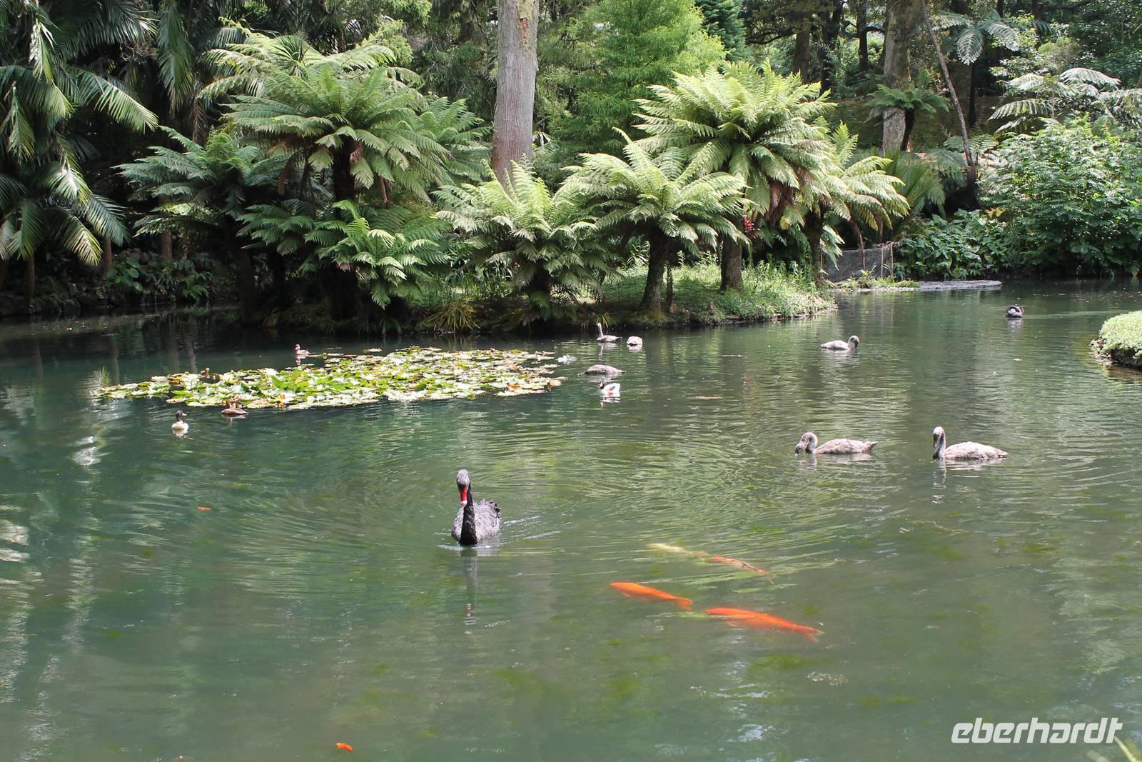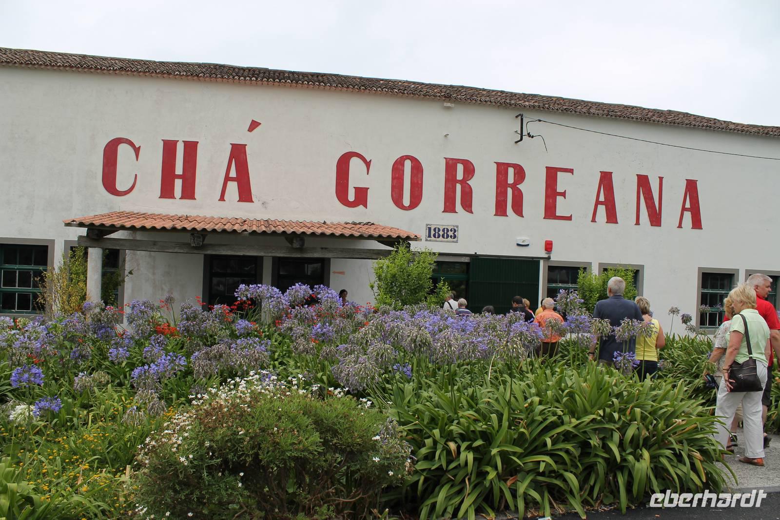 Nach diesem interessanten Besuch fuhren wir zum See von Furnas, wo die Töpfe aus den warmen Erdlöchern geholt werden, die das spätere Mittagessen beinhalten: "Cozido das Furnas" - ein Topf aus verschiedenen Fleischsorten, Würstchen, Yams, Kartoffeln, Kohl, Möhren. Nachdem auch unser Topf gehoben wurde, begaben wir uns zum angeschlossenen Restaurant des Hotels Terra Nostra, dem „Casino". Dort erwartete uns zuerst die Caldo Verde - Grüne Suppe, dann der "Cozido das Furnas" und zum Abschluss herrlich frische zuckersüße Ananas. Natürlich waren auch Brötchen, diverse Getränke und Kaffee inkludiert. Frisch gestärkt besuchten wir den Park Terra Nostra, in dem man nicht nur im 38 Grad Celsius warmen Wasser baden, sondern auch Pflanzen aus aller Welt sowie Kois und schwarze Schwäne bewundern kann. Begeistert fuhren wir weiter und legten noch einen Stopp am Miradoro do Pico do Ferra (Eisenberg) mit Blick hinunter zum Lagoa das Furnas-Gebiet ein. Auch der Besuch der Teefabrik „Plantacoes de Cha Gorreana", 1883 gegründet, stand heute noch auf dem Programm. Nachdem uns Serafina einiges dazu erklärt hatte, konnten wir die Fabrik besichtigen und auch Tee verkosten. Noch ein kurzer Fotostopp an der Steilküste des Inselnordens und schon ging es zurück nach Ponta Delgada. 19.15 Uhr trafen wir uns für ein gemeinsames Abendessen, wer wollte. Wir aßen am Hafen im Restaurant "La Cantina" - es gab für jeden Geschmack etwas und stellte uns alle zufrieden, allerdings dauerte die Abrechnung ziemlich lang... Wir spazierten im herrlichen Mondlicht zurück zu unserem gegenüberliegenden Hotel.