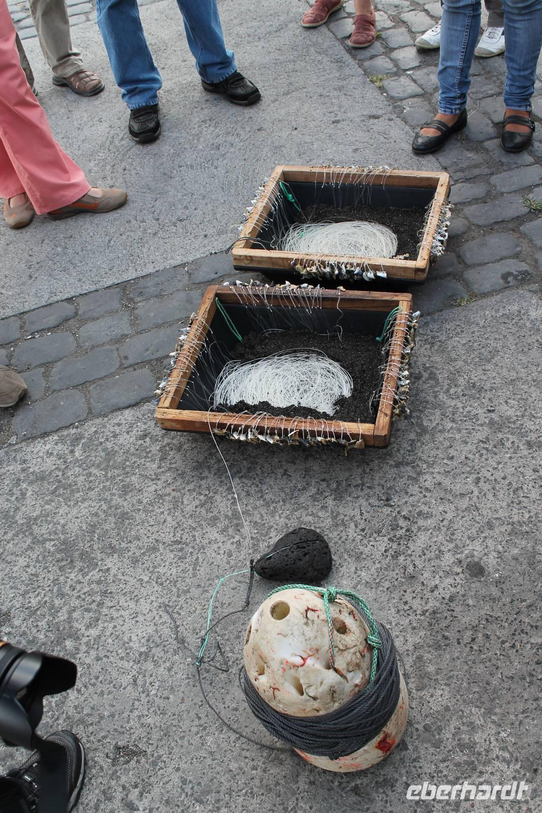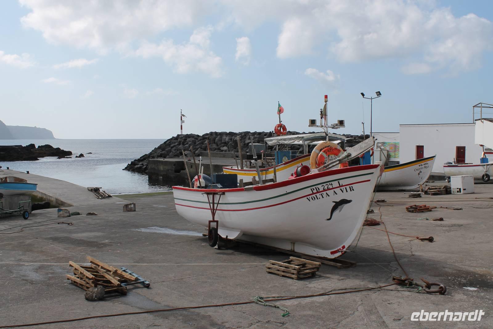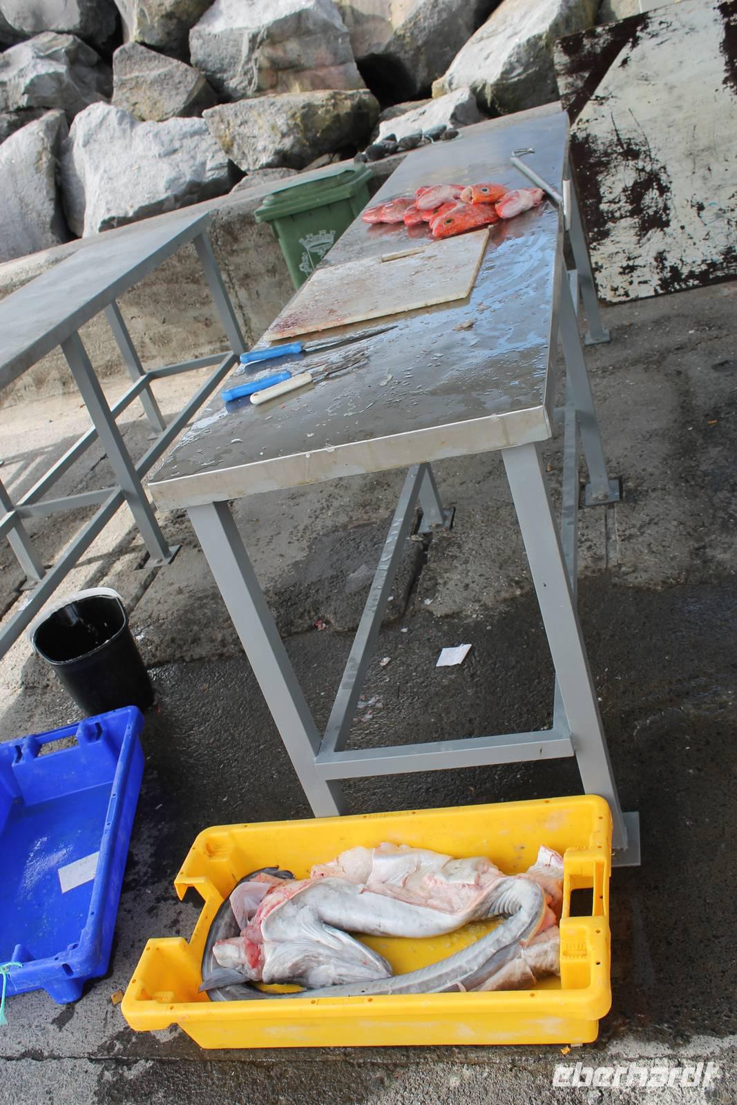 Nach unserem Start vom Hotel - mit dem etablierten Team aus Serafina und Luis - legten wir zuerst einen Stopp in der Stadt Lagoa mit Besichtigung der Keramikfabrik ein. Diese existiert nun schon in 5. Generation seit 1862. Hier werden per Hand verschiedenste Haushaltsutensilien, aber auch die berühmten portugiesischen Azulejos, die Kacheln, hergestellt. Da man hier als Figur und Bildnis das Symbol der Azoren für die Trachten der Frauen sah, erklärte uns Serafina die Geschichte zu „Mantel und Kapuze". Am lustigsten war aber doch die Geschichte der Maschine, die ohne Deckel geliefert wurde . Weiter ging unser heutiger Ausflug Richtung Fischereihafen - die Fischer bereiteten die Netze für die nächste Fahrt zum Fischen vor - ein junger Mann erklärte uns alles ganz genau. Am Hafen konnte man auch einem Mann beim Zerlegen eines Gabeldorsches zuschauen.