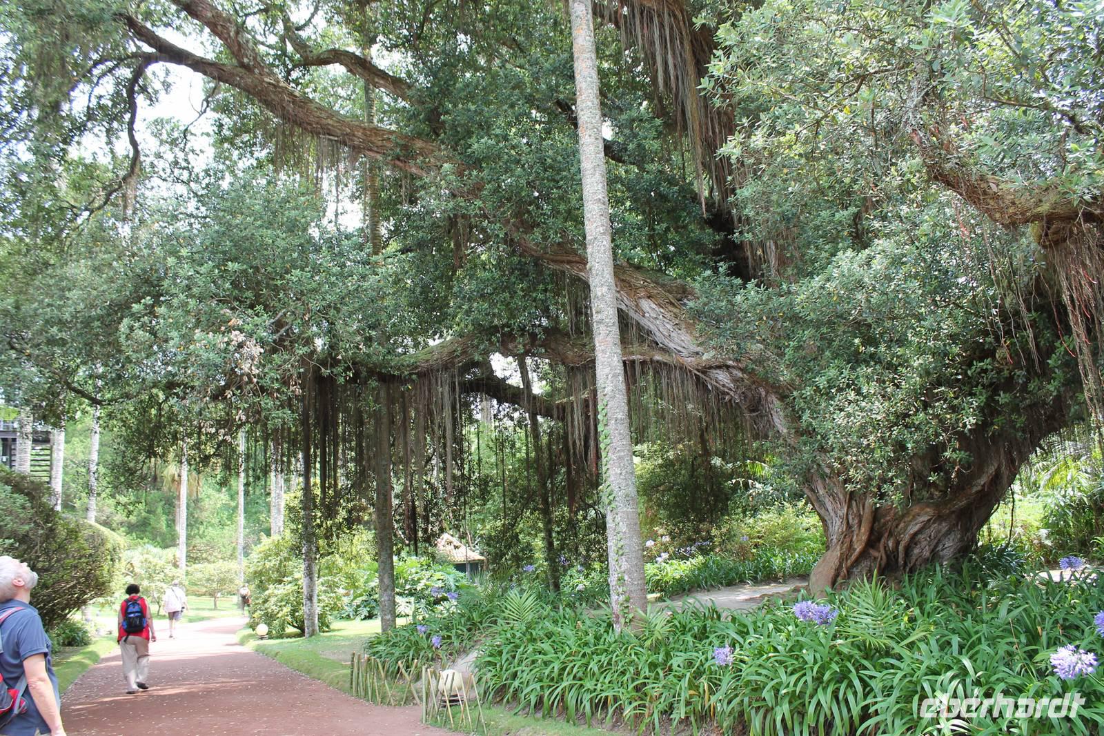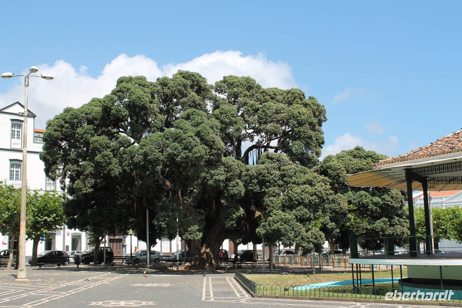 Da es Richtung Osten heute sehr wolkenverhangen aussah, disponierten Serafina und ich kurzfristig um und fuhren statt zum Feuersee nach Sete Cidades. Über Santa Clara und vorbei am Flughafen fuhren wir Richtung Sete Cidades. Der erste Stopp am Lagoa do Carvao bot leider außer Nebel keine Aussicht. Am Aussichtspunkt „Vista do Rei" am See - konnte man nur kurze Sekunden einen Blick auf die Seen Lagoa Azul und Lagoa Verde werfen, dann waren sie rasch wieder im Nebel verschwunden. Am Lagoa do Santiago konnte man alles sehen, aber dieser war leider auch nicht ganz so spektakulär. An der Brücke zwischen Lagoa Azul und Lagoa Verde stiegen wir aus und unternahmen einen wunderschönen Spaziergang entlang des Lagoa Azul - für jeden zu schaffen mit tollen Naturerlebnissen. Kurz vor 12 Uhr kamen wir in Sete Cidades an und legten unsere Mittagspause ein. Wir besichtigten die Kirche und kehrten in einem kleinen Cafe schräg gegenüber der Kirche ein, wo es für kleine Preise Baguettes, Empanadas und Suppe gab. Serafina und ich hatten vor der Mittagspause noch überlegt, ob wir eventuell zu den Aussichtspunkten zurück fahren sollten, aber auch eine Stunde später hatte sich der Nebel nicht verzogen, also fuhren wir die Küstenstraße hinauf und stoppten am Aussichtspunkt „Ponta do Escalvado" mit spektakulärem Blick auf das Meer und die Ortschaft Mosteiros. Nach Pilar fuhren wir noch einmal hinauf zum Kraterrand und sahen doch eine ganze Menge der Seen. Weiter ging unsere Fahrt immer an der Küste entlang bis Capelas, wo wir das ethnografische Museum besichtigten. Manuela Joao Melo zeigt hier seine über viele Jahre gesammelten Werke aus den verschiedensten Bereichen des Lebens: eine alte Schulausstattung, alte Radios, eine alte Druckerei und auch ganz kleine Kunstwerke aus Fischschuppen und Feigenbaummark. Der nächste Stopp erfolgte am Aussichtspunkt mit Blick zum Fels-„Elefanten". Beim Besuch der Ananasplantage am Stadtrand von Ponta Delgada konnten wir einen Blick in die Gewächshäuser werfen und Likör und Marmelade der süßen Frucht verkosten. Im Botanischen Garten von Ponta Delgada zog vor allem der größte 200 Jahre alte Gummibaum unsere Aufmerksamkeit auf sich. Das musste natürlich in einem Gruppenbild festgehalten werden. Nach einer Erfrischungspause im Hotel holte uns Serafina für das gemeinsame Abendessen im Restaurant „Anfiteatro" ab. Ein fantastisches Menü inklusive Getränke erwartete uns. Es wurde als Vorspeise „5 Gefühle" serviert, als Hauptgang gebratener Thunfisch und als Nachtisch Halbgefrorenes mit Banane und leckeren Schokoladenakzenten. Zufrieden und satt schlenderten wir nach Hause.