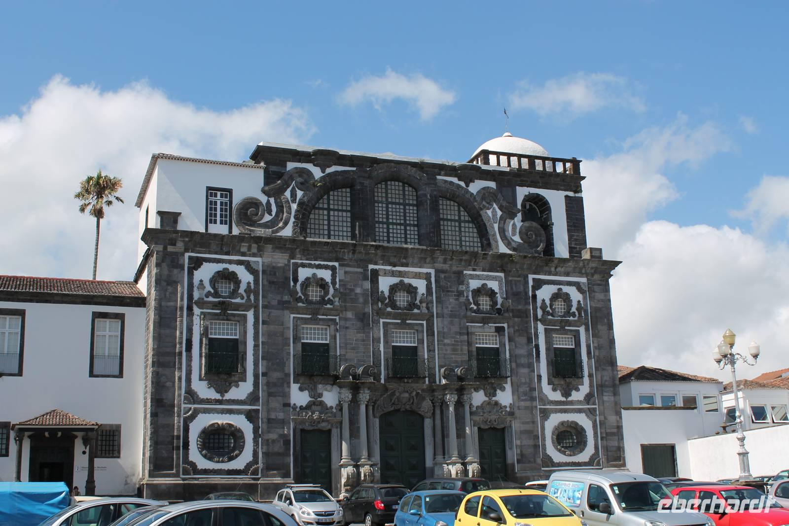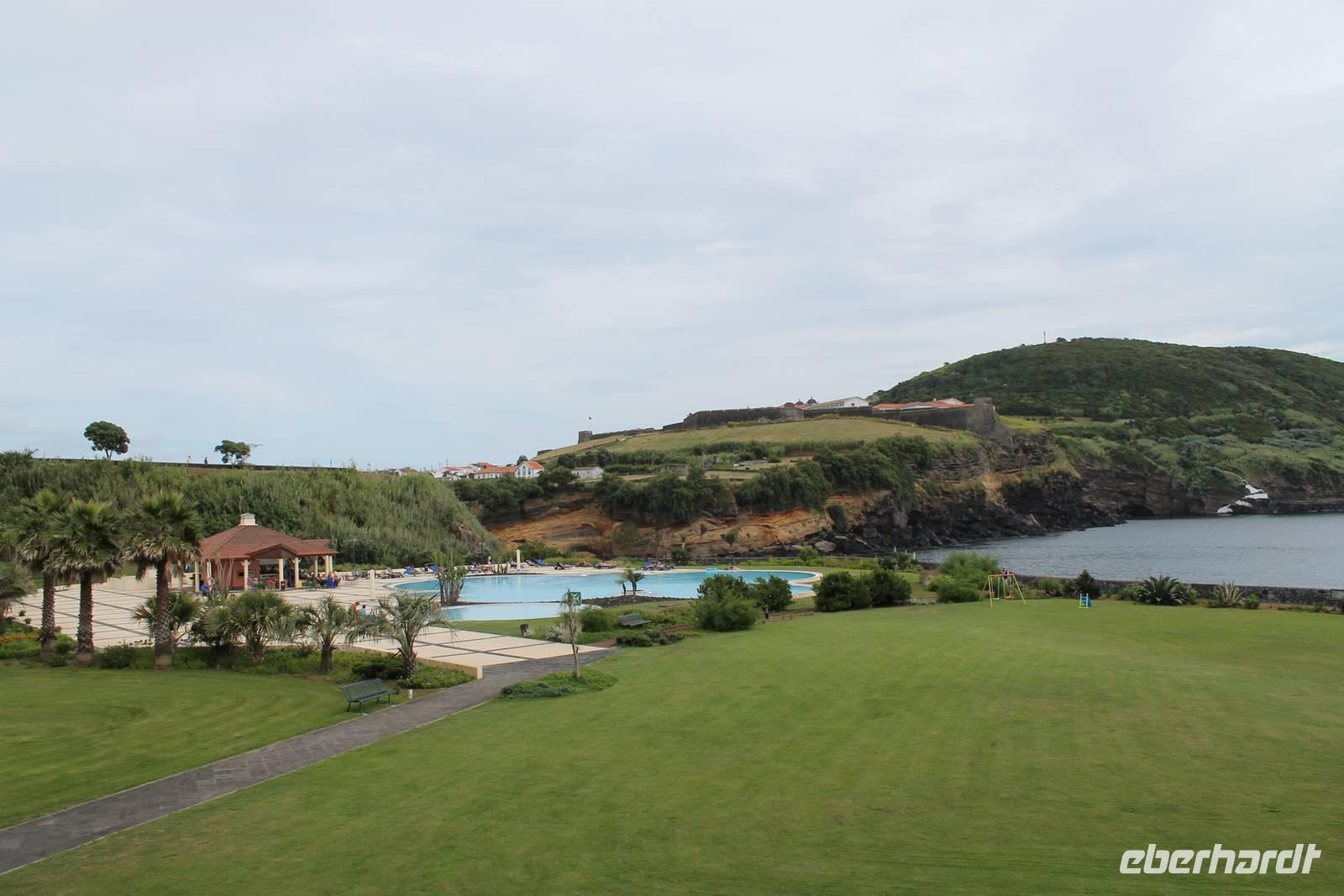 Heute hatten wir, bis auf den Flug von Sao Miguel nach Terceira, einen freien Tag, und diesen genossen alle. Nach einem ausgedehnten Frühstück ging ich mit einigen Gästen zur Markthalle - wir bestaunten Rinderhälften, die verschiedensten Fischsorten und auch einige unbekanntere Obstsorten. Bei dem milden Klima auf den Azoren gedeihen viele Obstsorten, die man sonst nur aus tropischen Gebieten kennt. So probierten wir die wohlschmeckenden Maracuja und auch Cherimoya. Die Feige fiel im Geschmackstest durch . Einige schlenderten entlang der Promenade oder schrieben den Lieben zu Hause Urlaubskarten. Bis 12 Uhr konnten wir uns in unseren Zimmern aufhalten und kurz darauf trafen wir Serafina in der Hotellobby und fuhren mit Luis zum Flughafen. Obwohl geplant war, dass Serafina und Luis uns am Montag wieder begrüßen würden, richteten wir schon die ersten Dankesworte an die beiden, denn wir hatten schöne Tage mit ihnen auf Sao Miguel verbracht. Der Check-In am Flughafen verlief etwas schleppend, und die Sicherheitskontrolle war ungewohnt streng, aber da der Flug Richtung Terceira pünktlich 14.00 Uhr startete, hatten wir keinen Grund zur Klage. Nach etwas mehr als einer halben Stunde landeten wir auf dem Flughafen das Lajes im Norden der Insel Terceira - Paula, unsere Reiseleiterin für die Insel Terceira, erwartete uns mit dem Bus und wir fuhren zu unserem schönen 4-Sterne-Hotel „Terceira Mar" am Rand der Hauptstadt Angra do Heroismo. Den weiteren Tag genossen die meisten von uns am Pool oder auf ihrem Balkon mit Blick auf den Atlantik. Am Abend traf ich mich dann mit den Gästen wieder und wir liefen gemeinsam Richtung Stadt, um in der urigen Gaststätte „Adega Lusitania" unser Abendessen zu genießen - es gab frischen Fisch, Steaks, schmackhafte Suppe - und vor allem einen sehr aufmerksamen Service - bei sehr moderaten Preisen. Zufrieden gingen wir zurück ins Hotel, und einige nochmal an die Hotelbar für einen leckeren abschließenden Wein. In der Nacht machten viele Bekanntschaft mit dem ungewöhnlichen Laut des Gelbschnabelsturmtauchers: Aua-aua-aua-äh-äh .