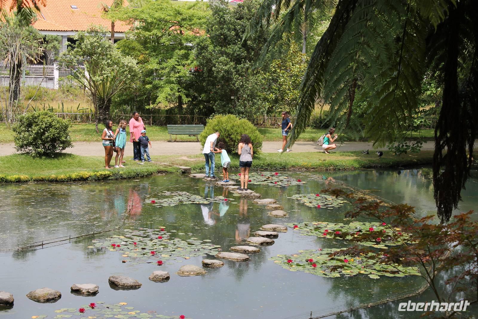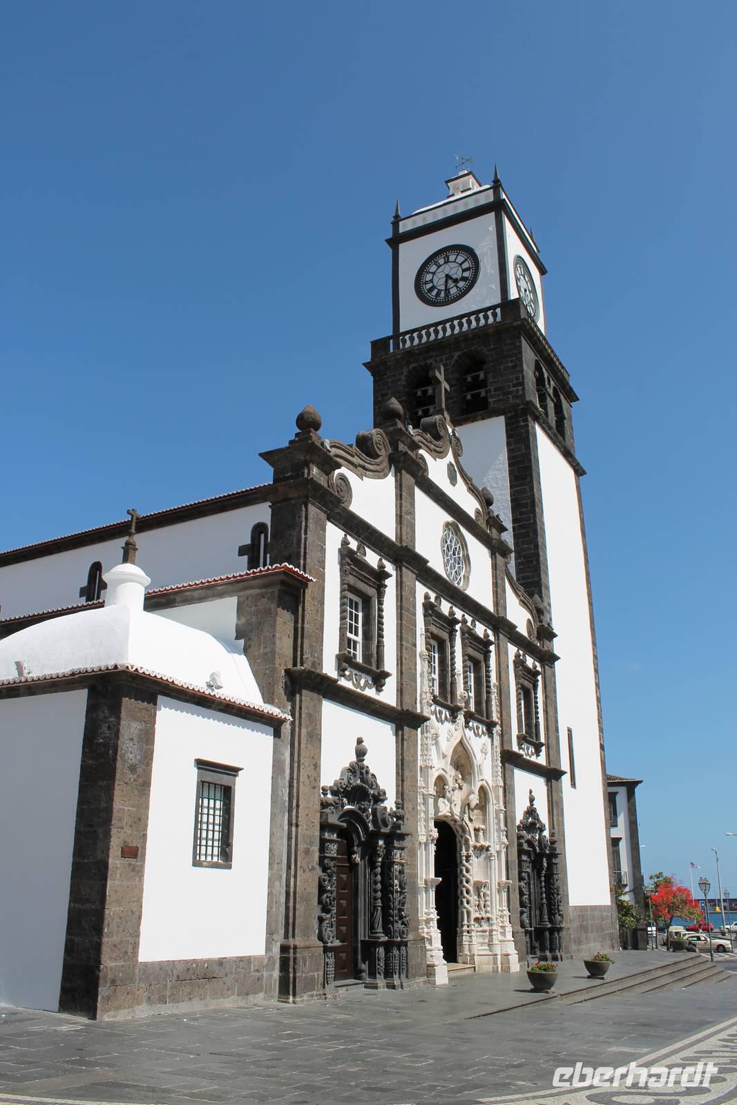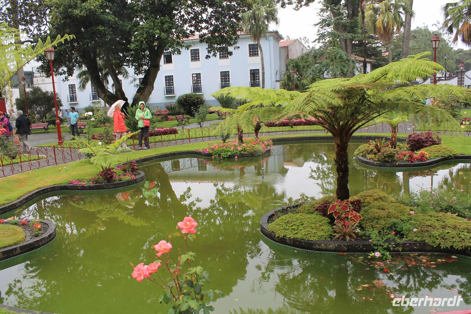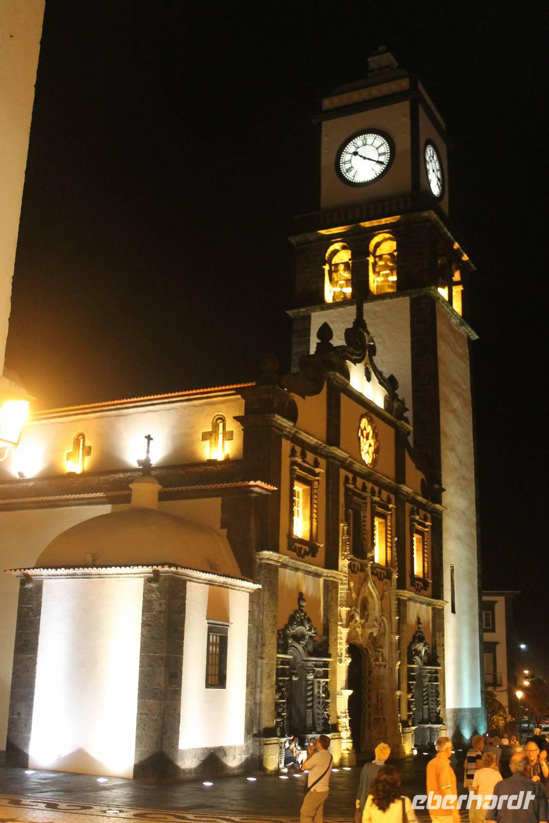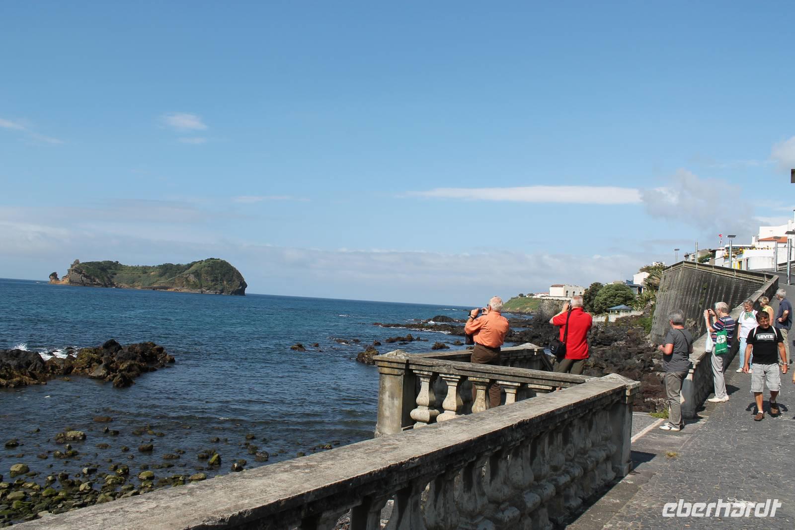 Vom Hafen in Lagoa fuhren wir Richtung Feuersee - am ersten und zweiten Aussichtspunkt wurden wir kaum mit Wolkenlücken belohnt, aber am dritten riss der Nebel auf und wir konnten den See vollständig sehen. Natürlich wäre dies nicht ohne Serafinas Aufruf zu positiven Schwingungen und Geduld möglich gewesen . Sie nannte das Ganze ein Schauspiel. Ribeira Grande stand heute als Mittagsziel auf dem Plan - vorab legten wir einen 30-minütigen Spaziergang zur Caldeira Velha, „heiße Quelle", auf einem gut ausgebauten Weg, der von riesigen Baumfarnen gesäumt wird, zurück. In Ribeira Grande verbrachten wir unsere Mittagspause im „Cafe com Sopa". Im Anschluss verführte uns Serafina zur Likörverkostung, bevor wir die Espirito-Santo-Kirche am Hauptplatz besichtigten. Wir spazierten zur Hauptkirche, welche aber geschlossen war. Zurück in Ponta Delgada stiegen wir an der Festung aus, reservierten dort für den Abend im Restaurant Mandarin und gingen zu Fuß durch die Stadt: wir sahen den Hauptplatz mit Pfarrkirche, das alte Nonnenkloster, den Palacio da Conceicao - heute das Präsidialamt, das Haus eines ehemaligen Orangenbarons, in dem man heute ein Gymnasium findet, das Santo Andre-Kloster - heute Museo Carlos Machado, die San Pedro-Kirche, das Rathaus (von Weitem ;-)) und gingen dann Richtung Markthalle und zurück zum Hotel. Da es heute sehr heiß war, war der Stadtrundgang doch sehr anstrengend und wir gingen früher als geplant Richtung Hotel. Zum Abendessen waren viele wieder erholt und wir verbrachten den Abend im Fischrestaurant „Mandarin". Die 1 km lange Strecke entlang der Uferpromenade war sehr angenehm und am Abend auch sehr interessant, da sich noch viel Leben an der Promenade abspielte.