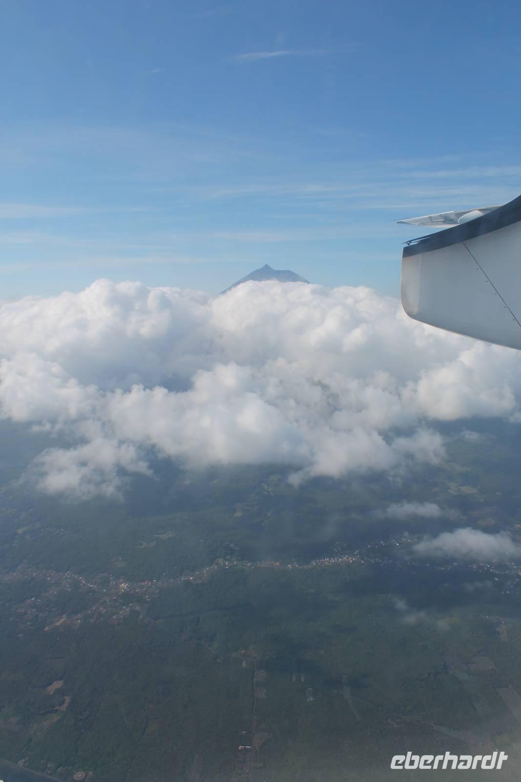 Heute wollten wir uns die Insel Faial noch einmal per pedes anschauen. Eine Wanderung an der Westküste war geplant und am Nachmittag ein Stadtrundgang in Horta. Am Morgen zeigte sich der Pico in allen Facetten: versteckt, mit Haube, mit Kragen, völlig „nackt" . Um 9.15 Uhr trafen wir uns alle in der Lobby und schlossen unsere Koffer im Gepäckraum ein. Manuela war auch schon da und so fuhren wir pünktlich zur Wanderung Richtung Westen. In Varadouro begannen wir unsere Wanderung auf einem sehr breiten bequemen Wanderweg, oberhalb an der Küste, mit vielen interessanten Pflanzen am Wegesrand: Wandelröschen, Hottentottenfeige, Trichterwinde, Flaschenputzer und viele mehr. An einigen Aussichtspunkten konnten wir immer wieder aufs Meer schauen, aber schnell waren wir aufgrund der heutigen Schwüle sehr durchgeschwitzt. So kürzten wir die Wanderung etwas ab und bestiegen schon am neuen Leuchtturm den Bus. Das Foto zu Capelinhos hinüber bekamen wir dank unserem Chauffeur „Cäsar" dennoch. Zurück in Horta gingen wir Richtung Porto Pim zu unserem Mittagessen - eine herrliche Aussicht an einem tollen Strand und leckeres Essen erwarteten uns. Um 14 Uhr trafen wir uns dann wieder am Hotel und starteten unseren Stadtrundgang - auch diesen kürzten wir etwas ab, da es heute mit über 30 Grad Celsius einfach zu heiß war. Wir sahen auf unserer Runde durch Horta die ehemaligen Gebäude der Deutsch-Atlantischen-Telegraphengesellschaft mit bunten Fenstern (im Transatlantischen Haus) aus dem Jahr 1912, das Gebäude selbst ist von 1919. Auf den Fenstern sieht man die Wappen der Königreiche Bayern, Sachsen, Württemberg und Preußen. Dort findet man die einstige deutsche Siedlung, die Colonia Alema. Es ging weiter entlang des ehemaligen Franziskanerklosters zum Platz der Republik, wo uns Manuela eine „Mischung aus schwarzem und weißem Schwan und irgendwie auch Ente" zeigte . Es ging zum Marktplatz - auf dem Markt kauften viele von uns frisches Obst - vor allem die Pfirsiche waren wunderbar saftig und herrlich süß. So gingen wir frisch gestärkt entlang der Hafenpromenade mit den berühmten Bildern der Weltumsegler bis zum Peter Café Sport, in dem sich auch das Scrimshaw-Museum, die größte private Sammlung geschnitzter Walzähne befindet - ein wunderbarer Abschluss, den wir mit dem berühmten Gin Tonic vor dem Café krönten. Denn man darf Faial nicht verlassen, ohne dieses leckere Getränk gekostet zu haben. Obwohl alle durch die Hitze ziemlich kaputt waren, genossen wir diesen Moment und begaben uns dann zu unserem Hotel, wo wir kurz nach Viertel sechs Richtung Flughafen starteten. Manuela erzählte noch ein paar Witze, sodass die Fahrt sehr kurzweilig war. Nach dem Check-In und der Verabschiedung von Manuela nahmen wir noch die eine oder andere Leckerei zu uns, denn Peter Café Sport hat mittlerweile auch am Flughafen ein Café. Fast pünktlich starteten wir dann 19.20 Uhr unseren Flug Richtung Sao Miguel, wo wir Serafina wieder trafen. Der Pilot des Flugzeugs flog ganz dicht am Pico vorbei, sodass wir regelrecht auf die Spitze schauen konnten.