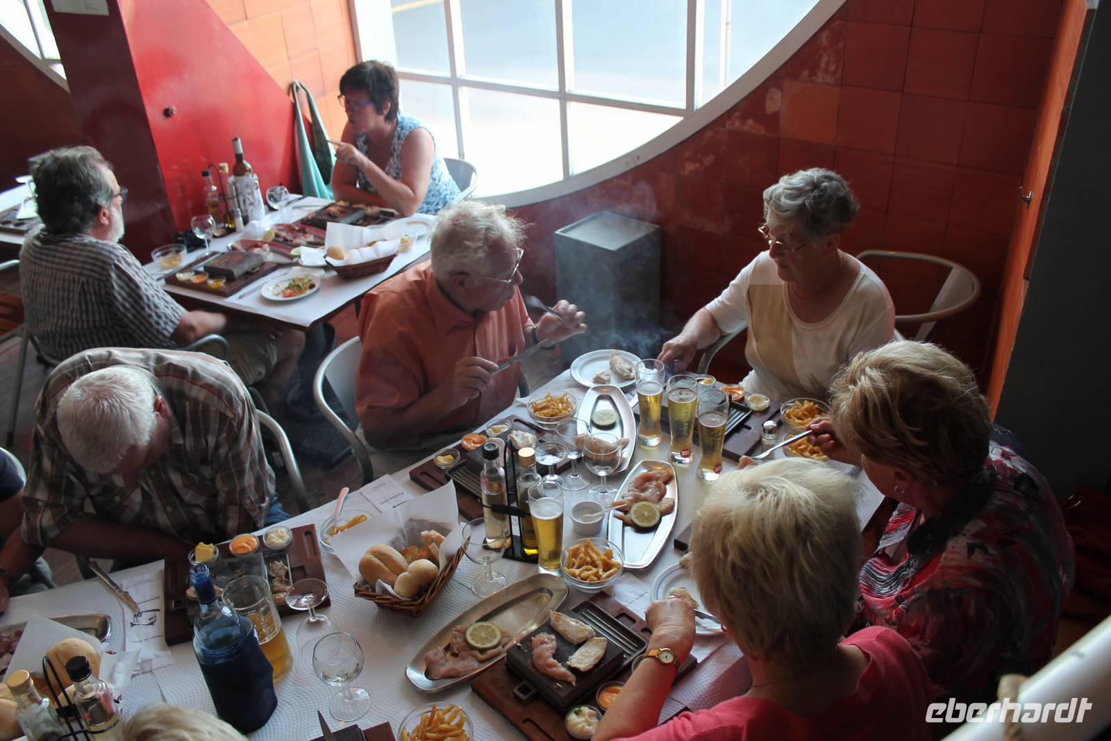 Heute stand noch einmal ein Höhepunkt auf dem Programm: Wir fuhren mit einem Katamaran hinauf aufs Meer. Nach einiger Wartezeit bestiegen wir das Schiff und die Mitarbeiter gaben uns eine kurze Sicherheitseinweisung. Die jungen Mitarbeiter sprachen schon von großen Wellen, die vom Atlantik kamen. Wir wussten nicht, dass die grünen Beutel doch noch so stark zum Einsatz kommen sollten. 9.30 Uhr startete das Boot und schon nach kurzer Fahrzeit sahen wir eine Gruppe von Delfinen, die mit dem Boot spielten. So nah war man selten diesen putzigen Tieren gekommen. Für viele von uns war das eine Premiere. Durch den starken Wellengang hat der ein oder andere auf seiner Position bei der „Jagd nach 2 Finwalen" schon mal eine salzige Dusche abbekommen . Leider machten sich die 2 Wale sehr rar, wahrscheinlich Mutter und Kind, meist sahen wir nur die Fontäne von Weitem, einige glückliche auch einen Teil des Rückens oder der Flosse. Für viele war es ein abenteuerliches Erlebnis. Einige wurden aber leider auch sehr seekrank, sodass sie die Fahrt nicht genießen konnten. Zum Glück ging es denjenigen nach einem Erholungsschläfchen am Nachmittag aber bald wieder gut. Zum Mittag waren wir wieder zurück im Hotel und jeder verbrachte den Nachmittag nach seinen Wünschen. Viele gingen noch einmal in die Stadt, um kleine Andenken, zum Beispiel die zuckersüßen Ananas, für die Daheimgebliebenen zu ergattern. Auch der ein oder andere Käse oder Wein fand seinen Weg in den Koffer.19.15 Uhr trafen wir uns mit Serafina im Hotel. Nach den „technischen Hinweisen" zur Heimreise am nächsten Tag gingen wir in den gemütlichen Teil des Abends über und spazierten mit Serafina ins Restaurant Colmeia im Stadtzentrum. Dort wurden wir mit einem leckeren Aperitif begrüßt: Sekt mit Brombeermarmelade. Danach nahmen wir an dem fein gedeckten Tisch Platz und nachdem uns ein guter portugiesischer Weißwein eingeschenkt wurde, ließen wir uns den 1. Gang schmecken - Croquetta: eine Teigrolle mit Pilzen und Käse gefüllt und mit Honig verfeinert. Der nachfolgende Gang bestand aus Thunfisch mit neuen Kartoffeln und Brokkoli, gefolgt von zartem Schweinefleisch. Als krönenden Abschluss wurde ein Schoko-"Vulkan" oder Ananas-Carpaccio mit Eis serviert. Vor dieser Schlemmerei hatte Herr Hold noch eine Überraschung für die Gruppe parat: ein Gedicht mit den schönsten Höhepunkten unserer Reise - wir waren begeistert. Gut gelaunt und sehr zufrieden schlenderten wir durch die hübsch beleuchtete Altstadt zurück zu unserem Hotel.