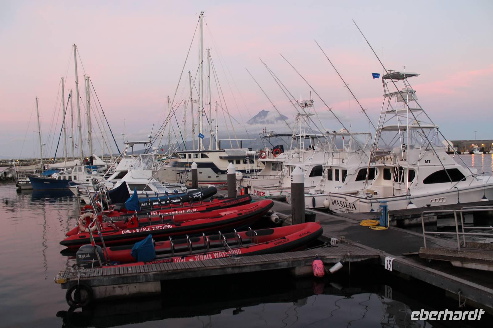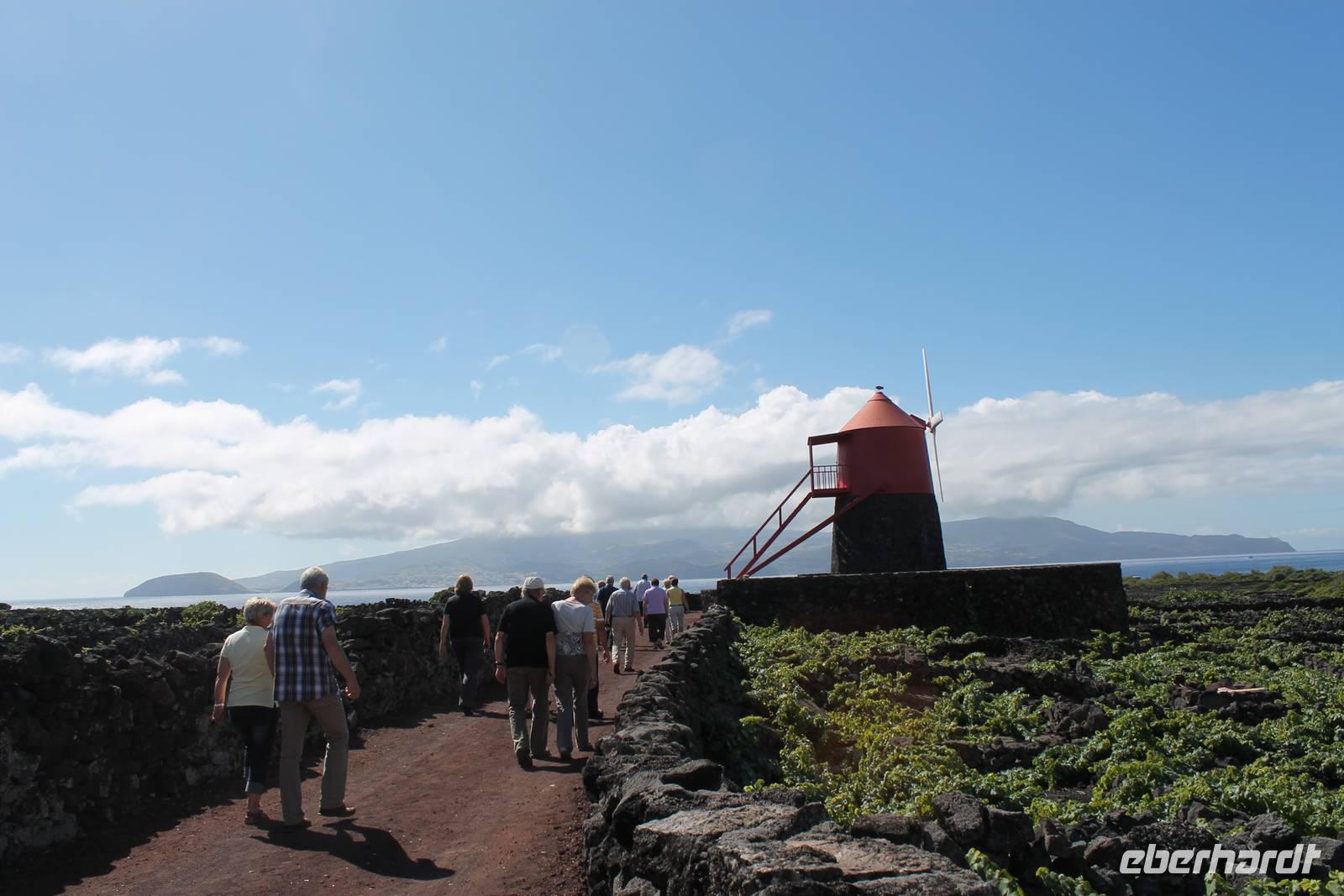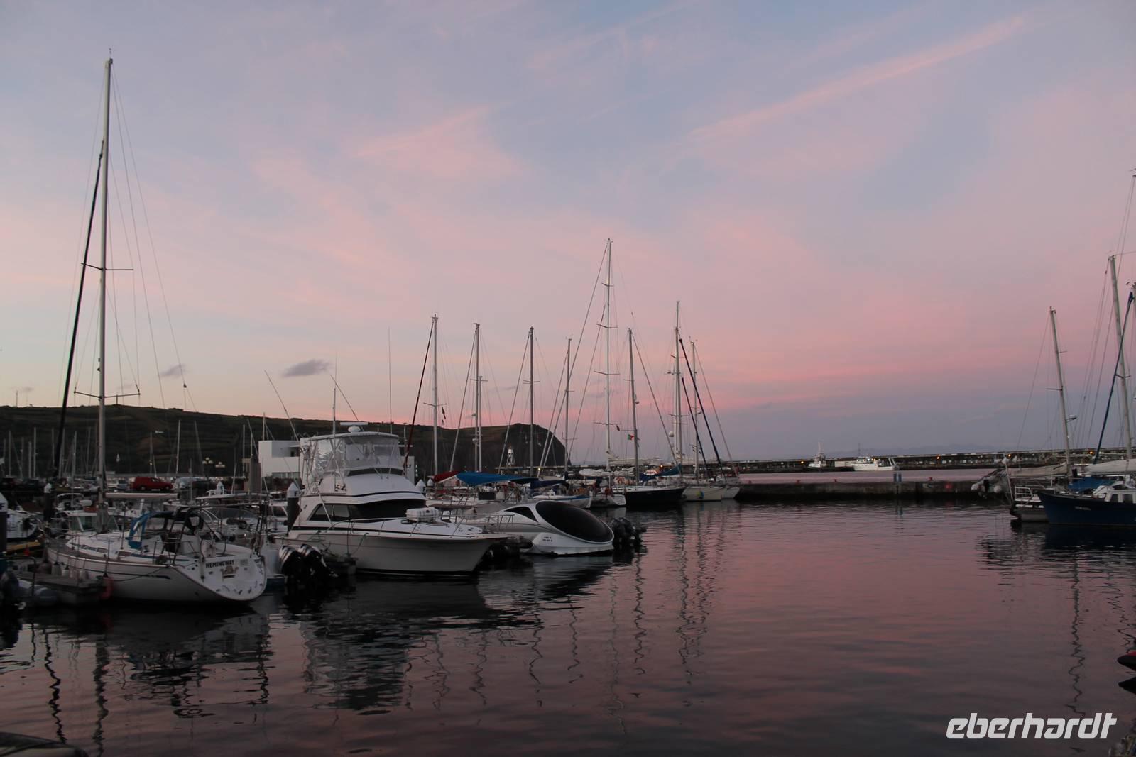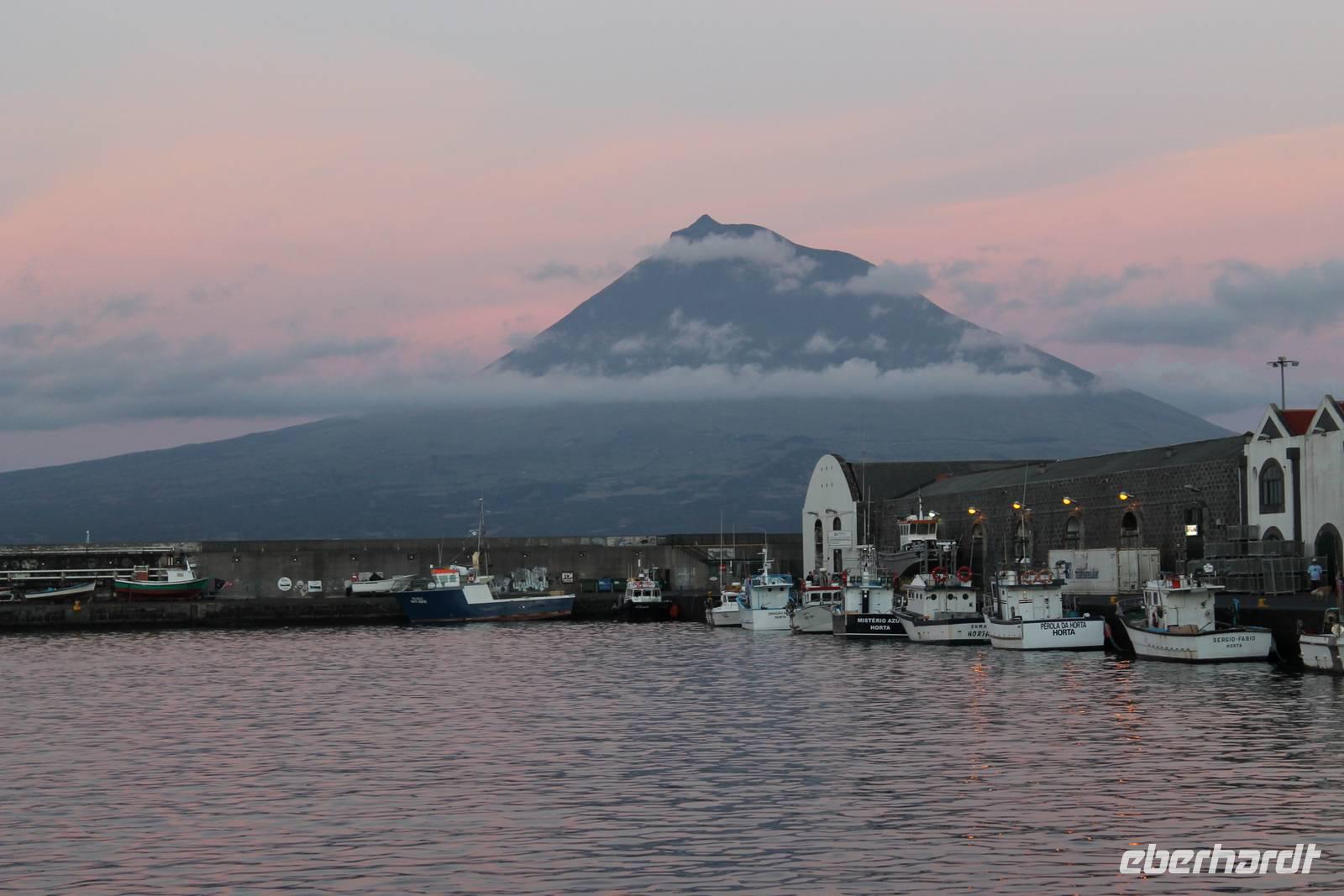Nun fuhren wir durch starken Nebel quer über die Insel, nach Lajes, wo wir unsere Mittagspause einlegten. In einem der Restaurants wurde auf dem Buffet neben Thunfisch und Stockfisch die typische Spezialität von Pico: Polvo guisado em vinho de cheiro - in vinho de cheiro gedünsteter Tintenfisch, angeboten. Nun hatte sich auch das Wetter gebessert und die Sonne zeigte sich uns. Wir trafen uns am Walfangmuseum von Lajes, wo uns Manuela weitere Informationen zum Walfang auf den Azoren gab. Unter anderem ist dort auch ein mumifizierter Walfötus zu sehen. Und einige Beispiele der Scrimshaw-Kunst. Wir fuhren zurück in Richtung Madalena an der West-Küste entlang bei strahlendem Sonnenschein. Bei einem Stopp am Misterio de S. Joao ließen wir uns leckeren Maracujalikör schmecken. Außerdem besichtigten wir die Kirche Sao Mateus. Wir stoppten am Weltkulturerbe von Pico - dem alten Verdelho-Anbaugebiet - die kleinen Mäuerchen aus Lavagestein schützen die Reben und speichern die Wärme. Von der Windmühle Moinho do Frade hatten wir einen tollen Blick über das riesige Weinanbaugebiet. Die Fähre nach Faial zurück war diesmal stärker ausgelastet als auf der Hinfahrt, aber jeder fand einen Platz und wir genossen die Überfahrt bei tollem Wetter. Am Hafen von Horta auf Faial angekommen, wartete bereits der Bustransfer auf uns. Ein Großteil der Reisegruppe begleitete mich dann ins Peter Café Sport, wo wir heute zu Abend gegessen haben. Da es so ein schöner Abend war, gingen viele noch im Hafen spazieren.