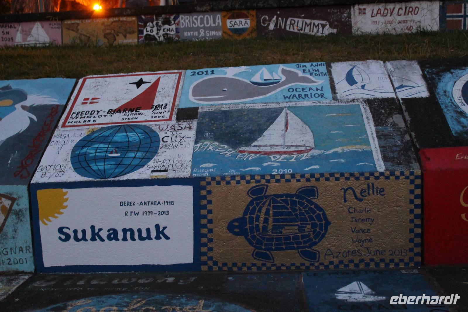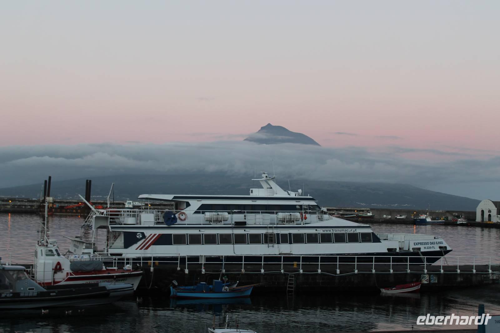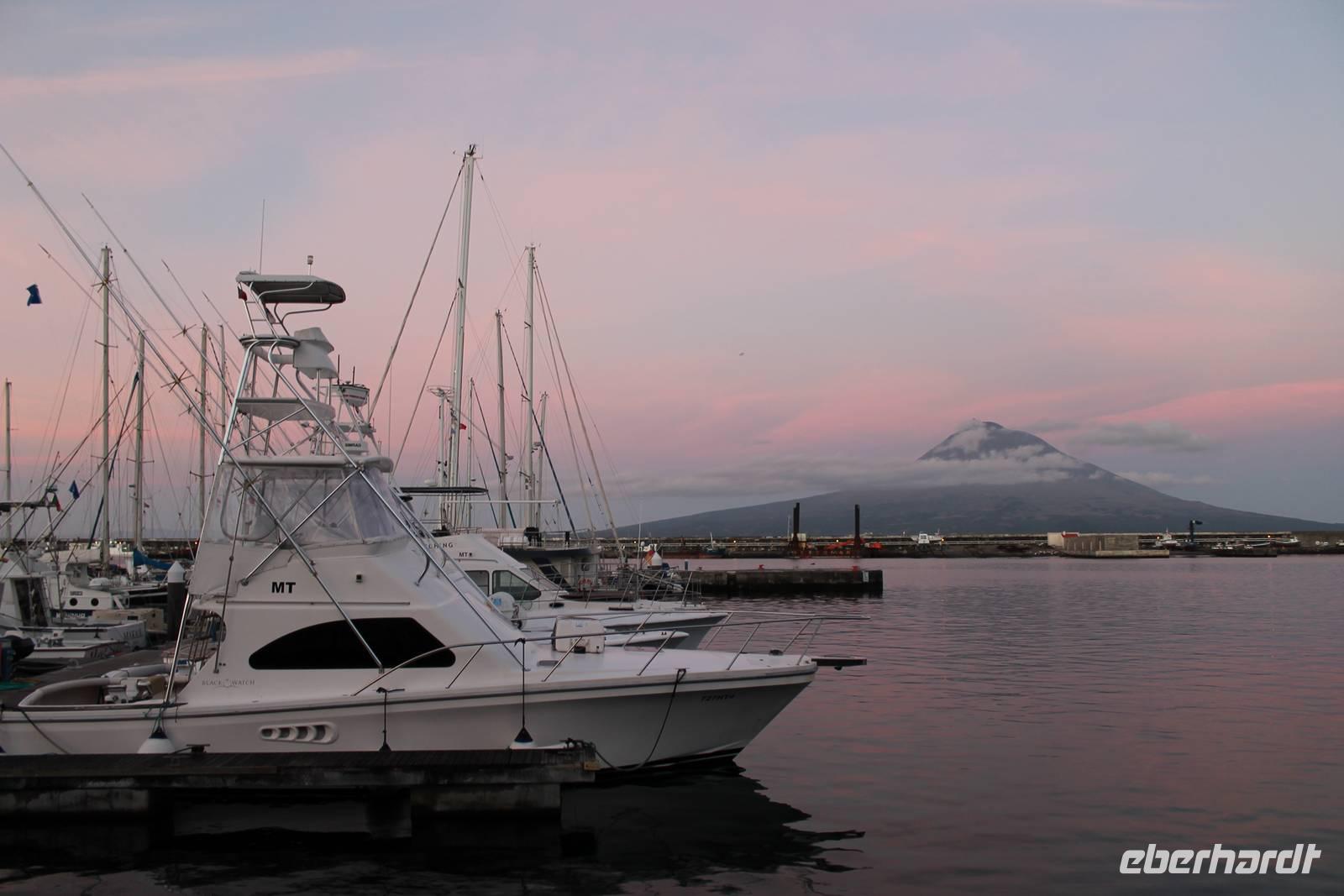 Nun fuhren wir durch starken Nebel quer über die Insel, nach Lajes, wo wir unsere Mittagspause einlegten. In einem der Restaurants wurde auf dem Buffet neben Thunfisch und Stockfisch die typische Spezialität von Pico: Polvo guisado em vinho de cheiro - in vinho de cheiro gedünsteter Tintenfisch, angeboten. Nun hatte sich auch das Wetter gebessert und die Sonne zeigte sich uns. Wir trafen uns am Walfangmuseum von Lajes, wo uns Manuela weitere Informationen zum Walfang auf den Azoren gab. Unter anderem ist dort auch ein mumifizierter Walfötus zu sehen. Und einige Beispiele der Scrimshaw-Kunst. Wir fuhren zurück in Richtung Madalena an der West-Küste entlang bei strahlendem Sonnenschein. Bei einem Stopp am Misterio de S. Joao ließen wir uns leckeren Maracujalikör schmecken. Außerdem besichtigten wir die Kirche Sao Mateus. Wir stoppten am Weltkulturerbe von Pico - dem alten Verdelho-Anbaugebiet - die kleinen Mäuerchen aus Lavagestein schützen die Reben und speichern die Wärme. Von der Windmühle Moinho do Frade hatten wir einen tollen Blick über das riesige Weinanbaugebiet. Die Fähre nach Faial zurück war diesmal stärker ausgelastet als auf der Hinfahrt, aber jeder fand einen Platz und wir genossen die Überfahrt bei tollem Wetter. Am Hafen von Horta auf Faial angekommen, wartete bereits der Bustransfer auf uns. Ein Großteil der Reisegruppe begleitete mich dann ins Peter Café Sport, wo wir heute zu Abend gegessen haben. Da es so ein schöner Abend war, gingen viele noch im Hafen spazieren.