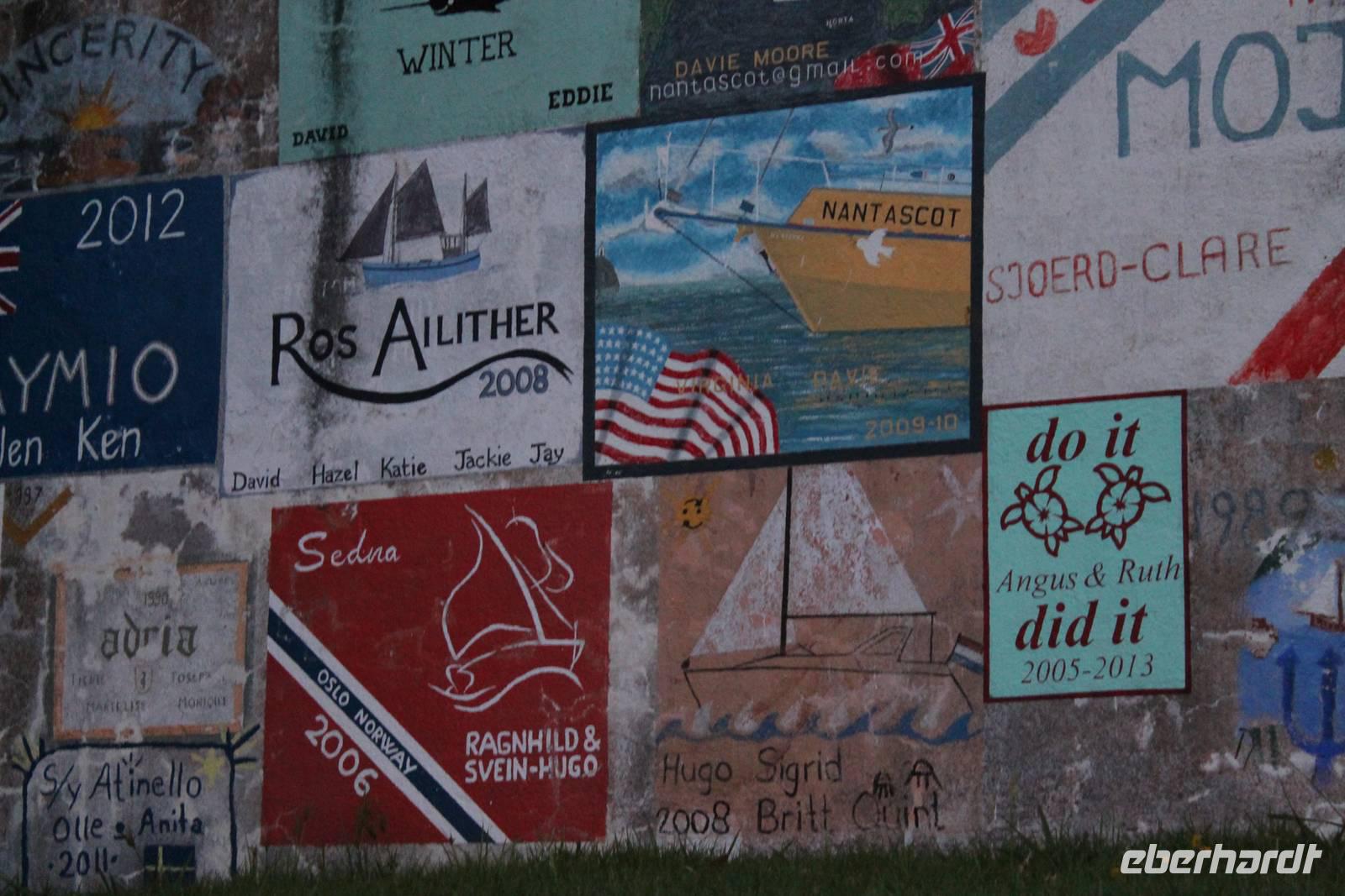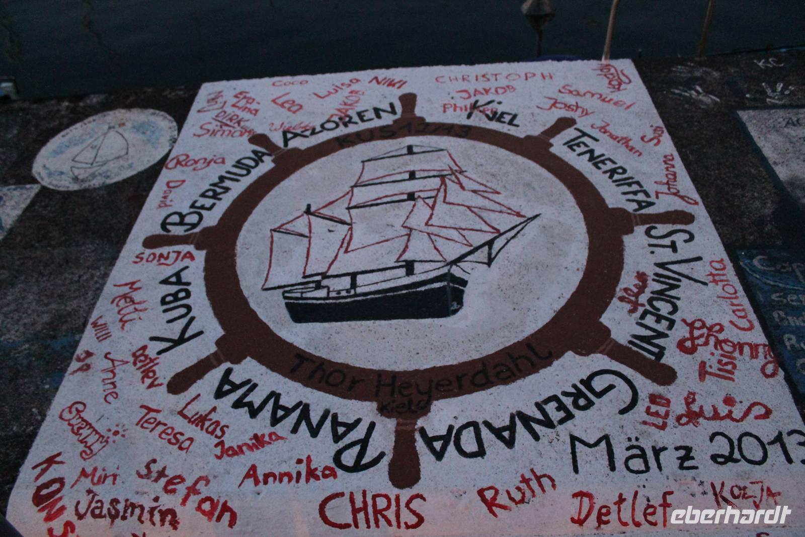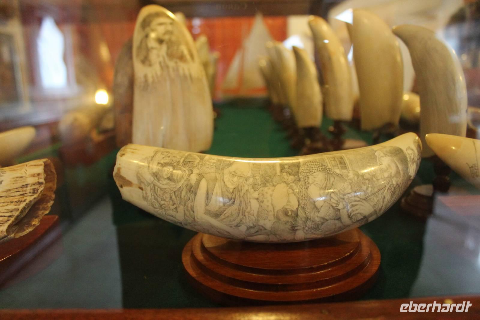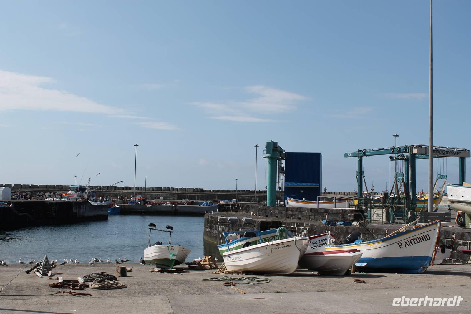 Nun fuhren wir durch starken Nebel quer über die Insel, nach Lajes, wo wir unsere Mittagspause einlegten. In einem der Restaurants wurde auf dem Buffet neben Thunfisch und Stockfisch die typische Spezialität von Pico: Polvo guisado em vinho de cheiro - in vinho de cheiro gedünsteter Tintenfisch, angeboten. Nun hatte sich auch das Wetter gebessert und die Sonne zeigte sich uns. Wir trafen uns am Walfangmuseum von Lajes, wo uns Manuela weitere Informationen zum Walfang auf den Azoren gab. Unter anderem ist dort auch ein mumifizierter Walfötus zu sehen. Und einige Beispiele der Scrimshaw-Kunst. Wir fuhren zurück in Richtung Madalena an der West-Küste entlang bei strahlendem Sonnenschein. Bei einem Stopp am Misterio de S. Joao ließen wir uns leckeren Maracujalikör schmecken. Außerdem besichtigten wir die Kirche Sao Mateus. Wir stoppten am Weltkulturerbe von Pico - dem alten Verdelho-Anbaugebiet - die kleinen Mäuerchen aus Lavagestein schützen die Reben und speichern die Wärme. Von der Windmühle Moinho do Frade hatten wir einen tollen Blick über das riesige Weinanbaugebiet. Die Fähre nach Faial zurück war diesmal stärker ausgelastet als auf der Hinfahrt, aber jeder fand einen Platz und wir genossen die Überfahrt bei tollem Wetter. Am Hafen von Horta auf Faial angekommen, wartete bereits der Bustransfer auf uns. Ein Großteil der Reisegruppe begleitete mich dann ins Peter Café Sport, wo wir heute zu Abend gegessen haben. Da es so ein schöner Abend war, gingen viele noch im Hafen spazieren.