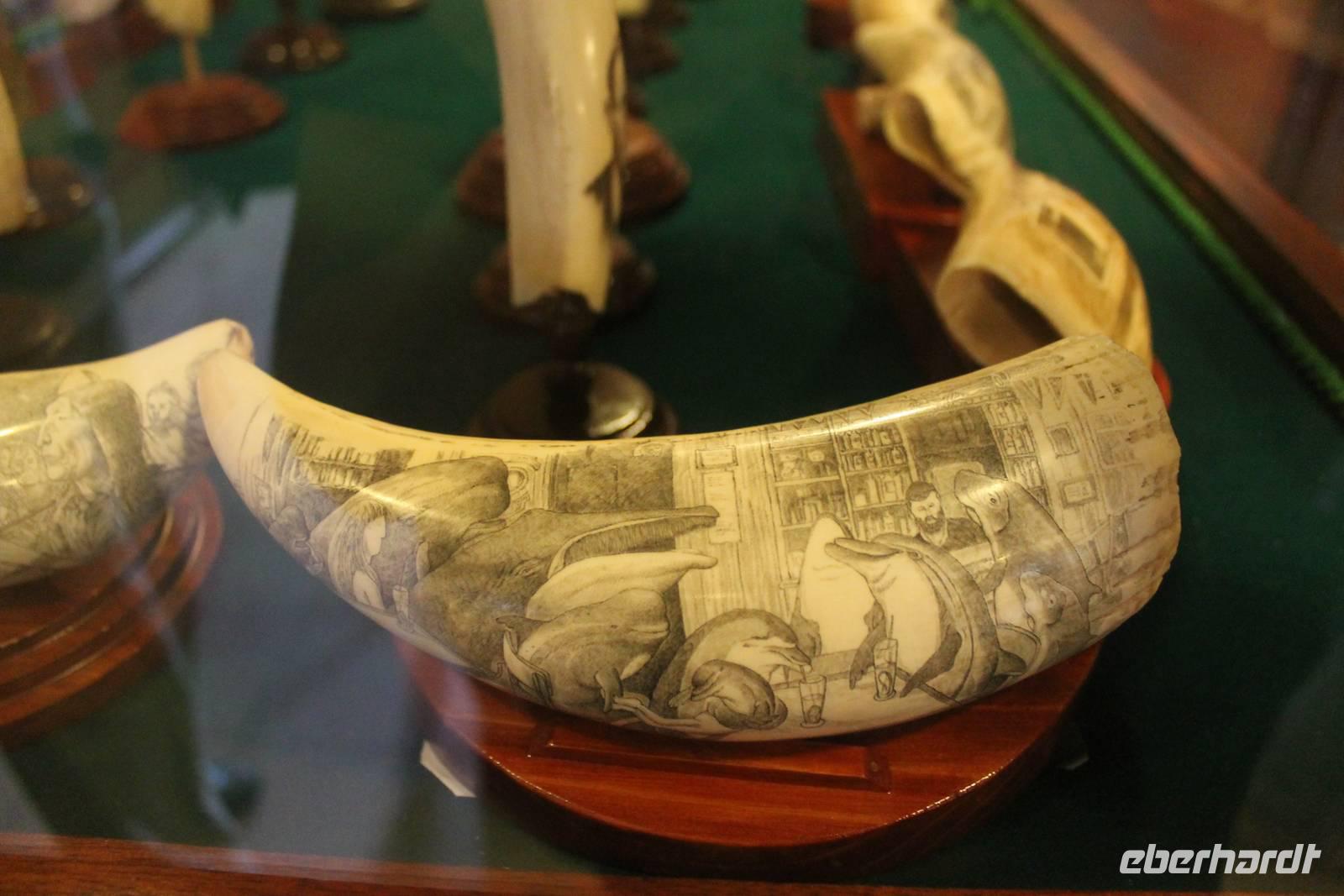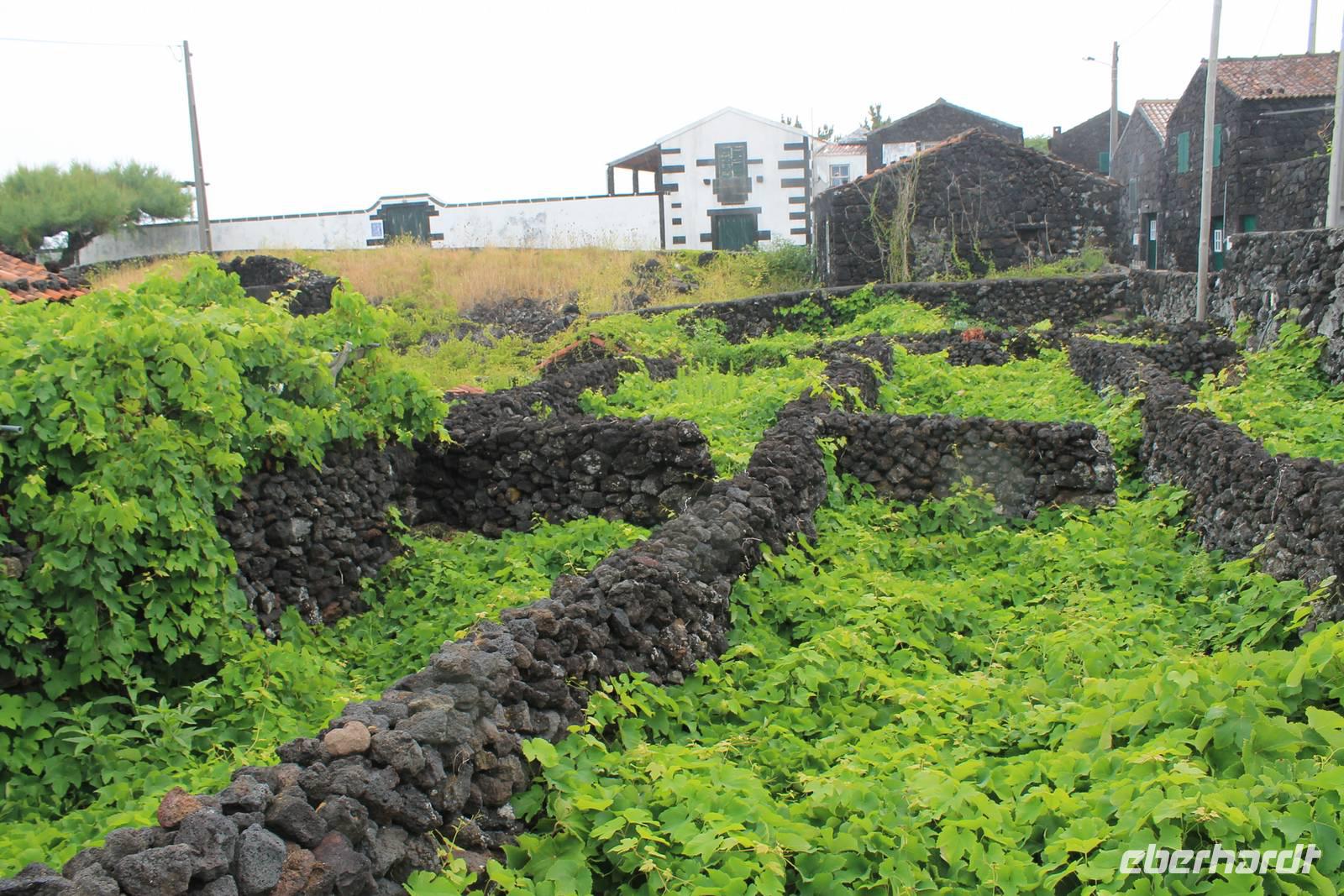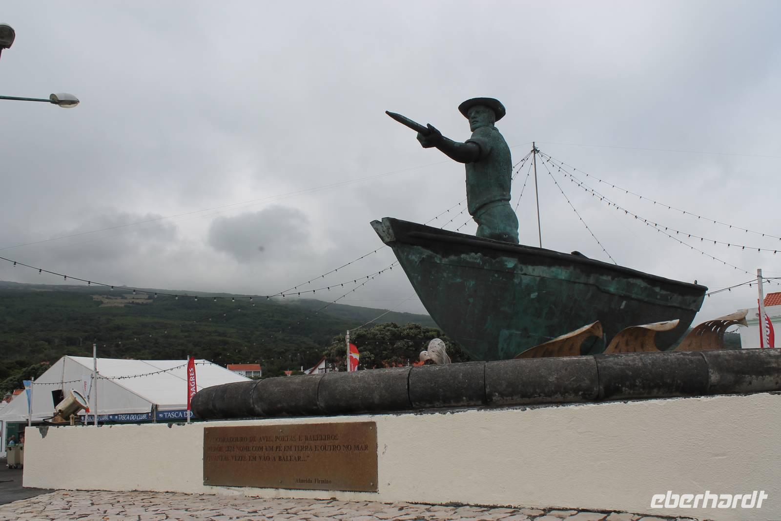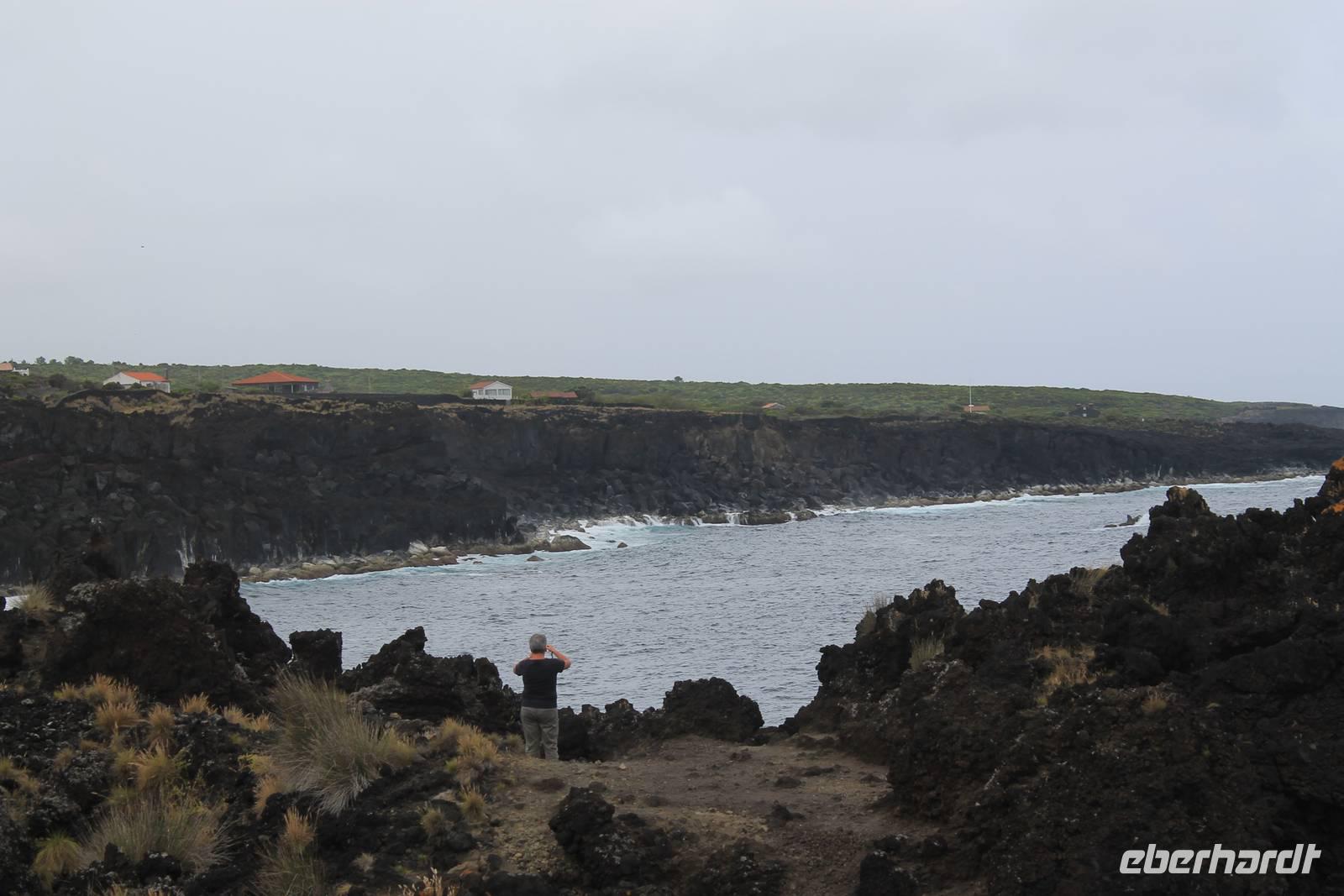 Ab 06.30 Uhr konnte man hier im Hotel do Canal das Frühstücksbuffet genießen. Wir trafen uns 8.30 Uhr in der Hotel-Lobby und fuhren mit dem Bus zum neuen Fährterminal von Horta, wo 9 Uhr die Fähre nach Pico startete. Auf der Fahrt Richtung Pico sah es sehr bewölkt aus und es war auch regnerisch. In Madalena nach 30 Minuten Fahrzeit angekommen, erwartete uns Manuela bereits, denn sie lebt seit 18 Jahren auf Pico. Der Bus zu unserer Inselrundfahrt stand auch bereit und so starteten wir Richtung Nordosten. Wir fuhren an der Küste entlang durch das erste Weinanbaugebiet und stoppten im kleinen Dörfchen Cachorro. Der Ort ist nach der Felsformation benannt, die wie ein Hundekopf aussieht. Das mussten wir natürlich sofort fotografieren und verewigten uns alle in einem Gruppenbild. Am anderen Ende des kleinen Ortes konnte man tolle Formationen der Lavagesteine am Meer ganz nah sehen und teilweise auch besteigen. Im Anschluss verkosteten wir heimische Liköre und erstanden solche bzw. Honig aus dem krausblättrigen Klebsame, Manuelas Lieblingspflanze . Weiter ging es nach Sao Roque, wo wir das Museum in der alten Walfabrik besuchten - eine sehr interessante Ausstellung, mit welcher uns Manuela den Walfang auf den Azoren näher brachte, der im Anschluss an das Sterben der Weinstöcke durch die Reblaus das Einkommen auf den Azoren sicherte. Die Saison war von April bis Oktober. In einem Rekordjahr wurden 150 Wale gefangen und der längste Wal wurde mit 22 Metern gemessen, unvorstellbar bei einer Länge der Boote von 11 Metern.