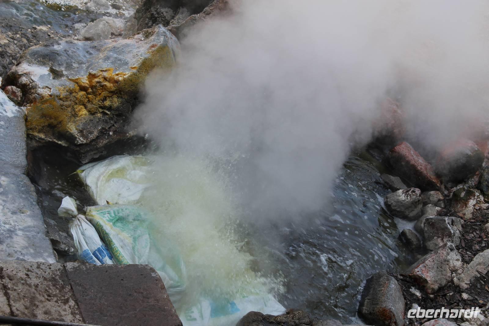 Um 9.00 Uhr holte uns Serafina, gut gelaunt wie immer, zum Ausflug nach Furnas ab. Entlang der Küstenstraße fuhren wir mit unserem Chauffeur Luis bis zum Aussichtspunkt Miradouro do Pisao und genossen den ersten Blick aufs Meer. Weiter ging es bis Villa Franca do Campo, wo wir die Kirche St. Michael besuchten. In dem kleinen Markt nebenan erstanden wir kleine azoreanische Bananen, die herrlich schmecken. Weiter durch das hübsche Stadtzentrum ging es bis zum Meer, wo man die vorgelagerte Ilheu de Vila Franca findet, übersetzt „Inselchen", das mit einem natürlichen Pool im Sommer Gäste anlockt. Bei der Kaffeepause am Hafen kosteten einige einen Queijada - einen typischen kleinen Käsekuchen. 11.00 Uhr ging unser heutiger Ausflug weiter nach Furnas, wo wir das geothermische Gebiet begutachteten - es dampfte, blubberte und stank überall . An diversen Mineralquellen konnte man probieren - diese sind je nach Mineral eingeteilt, um gegen verschiedene Beschwerden eingesetzt zu werden - Magenbeschwerden, Atemwegserkrankungen usw..