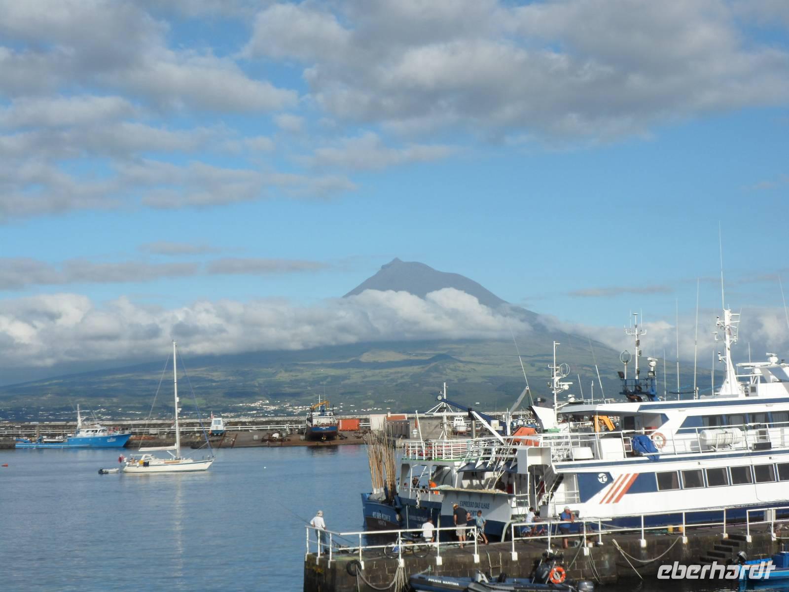 Wieder starteten wir nach dem Früstück mit dem Bus zum Fährhafen um die Fähre 09.10 Uhr nach Pico zu erreichen. Der Bus kann nicht mit, wir stiegen aus und genossen die etwa 30 Minütige Überfahrt mit herrlichen Blick auf die Stadt Horta und die Insel Pico auf der anderen Seite.