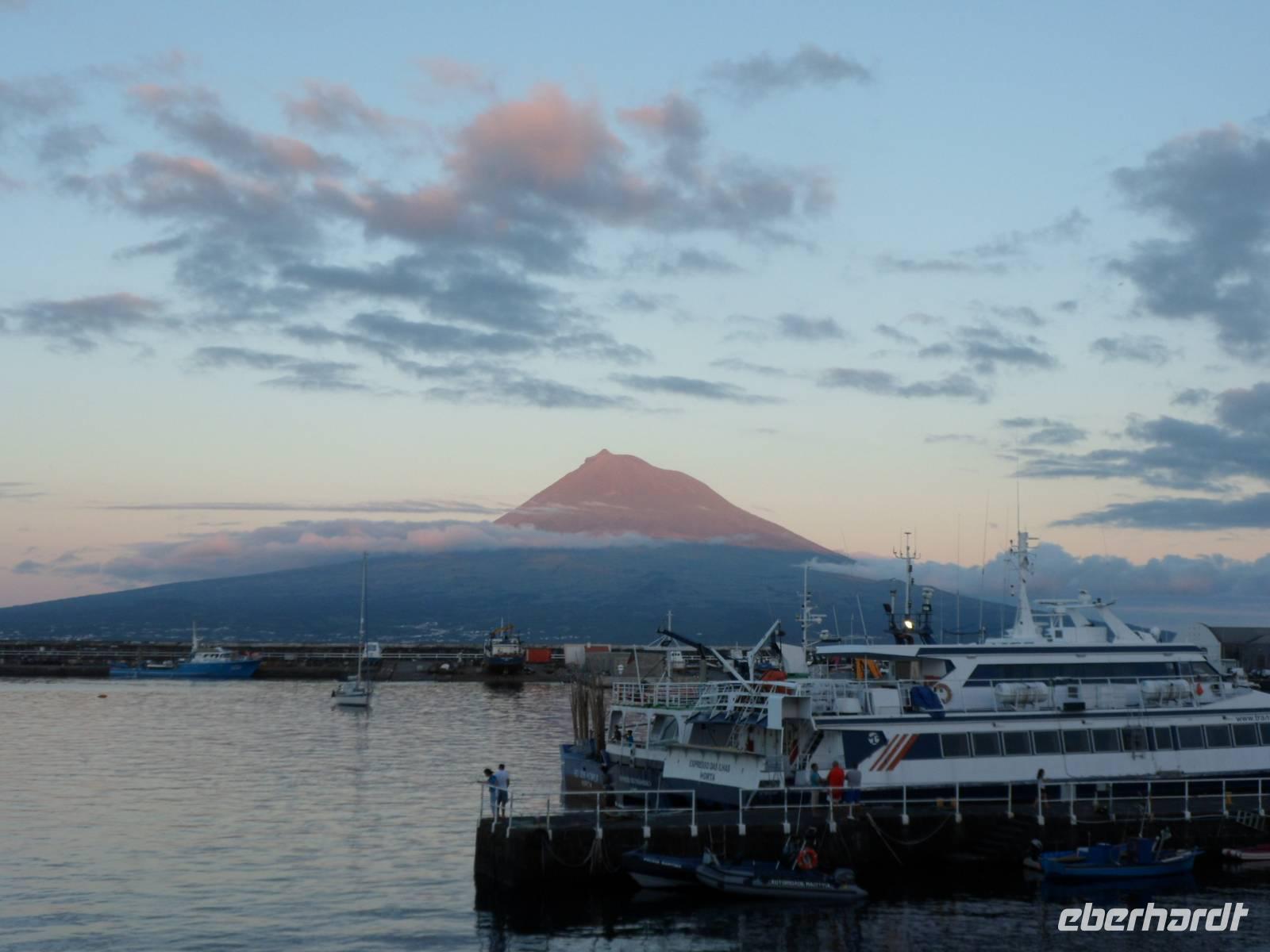 18.00 Uhr startete die Fähre und ein besonders schöner Tag sollte zu Ende gehen. In Horta hatten wir bei Peters Sportcafe Tische reserviert um das Abendessen einzunehmen und genau zu dieser Zeit konnten wir auf der anderen Seite den Pico, 2351 m hoch, betrachten. Die Wolken zogen ab und er zeigte sich in der Abendsonne in seiner ganzen Schönheit, traumhaft!