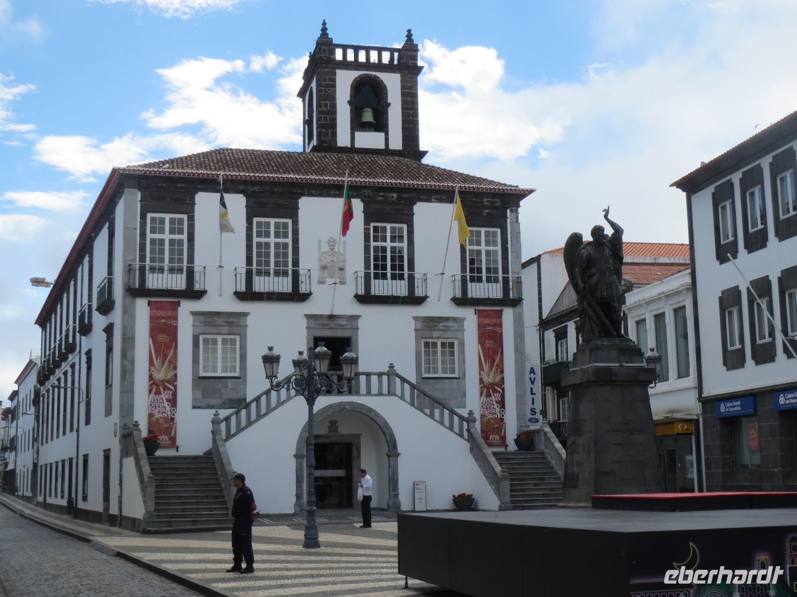 Nach einen ausgiebigen Frühstück wurden wir 12:30 Uhr von Jose zum Flughafen gebracht. Nach einem Kaffee, einem Sandwich oder einem Eis gingen wir durch die Sicherheitskontrolle - kein Anstehen, kein unfreundliches Personal. Ab in den kleinen Flieger (maximal 37 Sitzplätze) und schon ging es los... ab in die Luft. Nach 30 Minuten waren wir auch schon auf der 2. Insel unserer Reise - Terceira. Hier erwartete uns Alberto mit "seinem" Bus und brachte uns zum Hotel am Meer. Nach kurzem Check-In ging es auch schon los. Petra lief mit uns zur Kathedrale Santissimo Salvador (leider war sie geschlossen), vorbei an den kleinen Gässchen von Angro do Heroismo zum Rathaus. Dort durften wir sogar eintreten. Ein großer Plenarsaal erwartete uns. Richtung Meer sahen wir noch die Statue von Vasco da Gama bevor wir vor Hunger und Durst in Richtung einiger Restaurants stürzten. Einige nutzen den Pool zum Entspannen - am späten Abend die Terrasse des Hotels und genossen die Aussicht, das ein oder andere Bier oder ein Gläschen Wein.