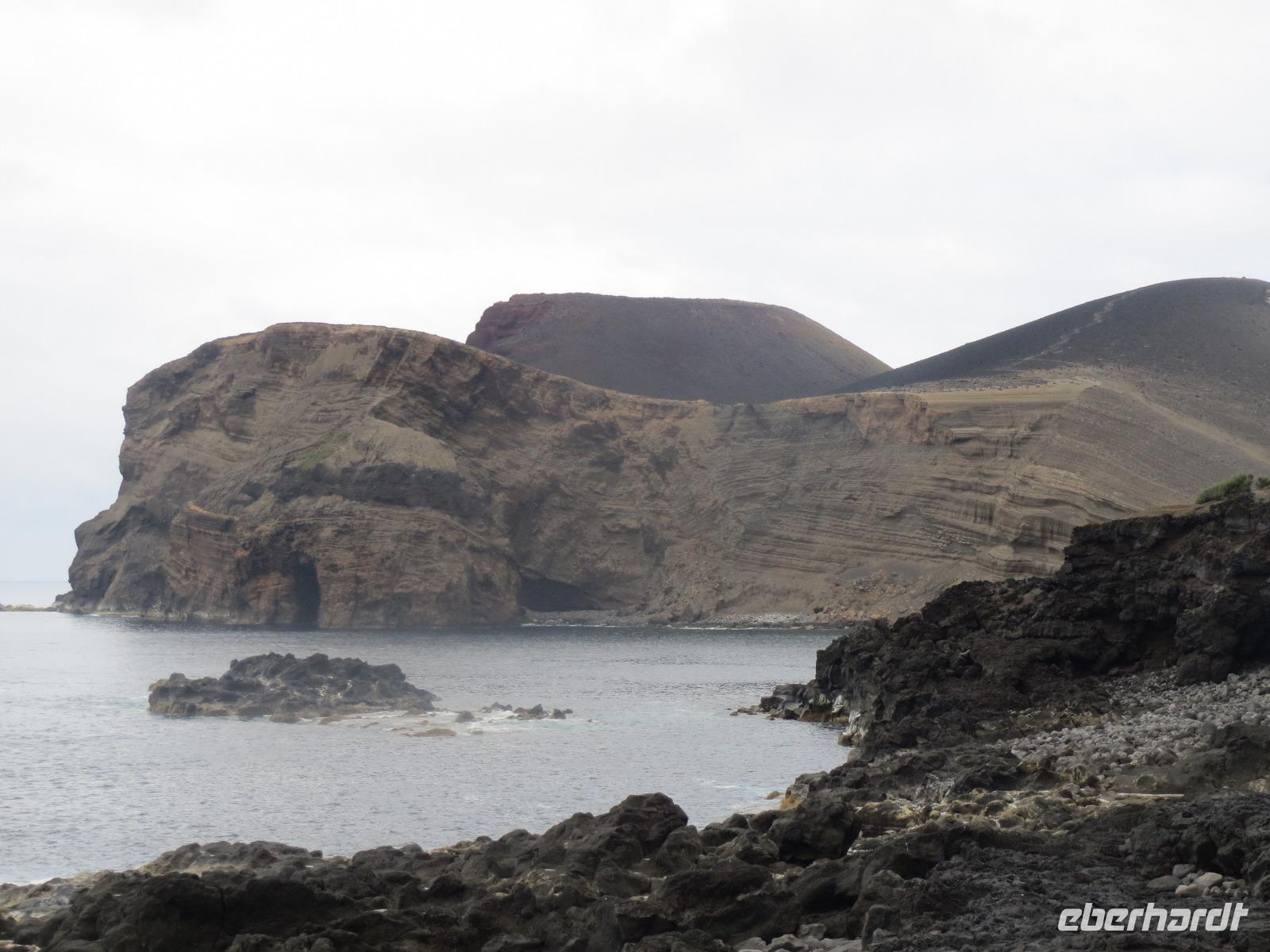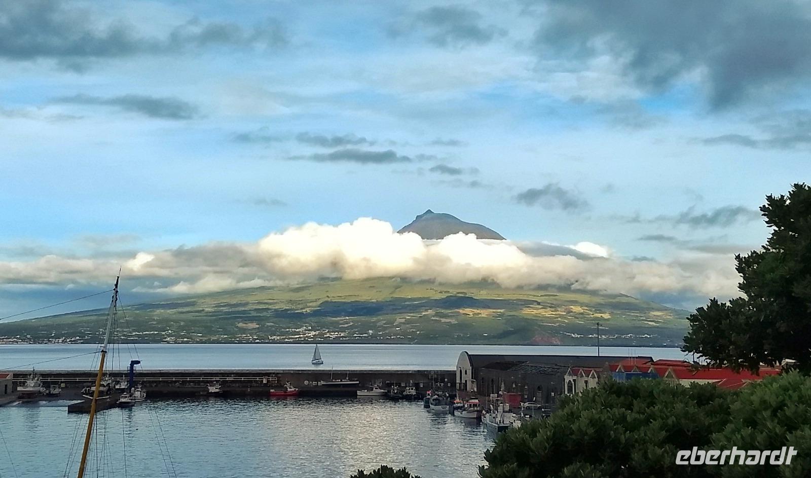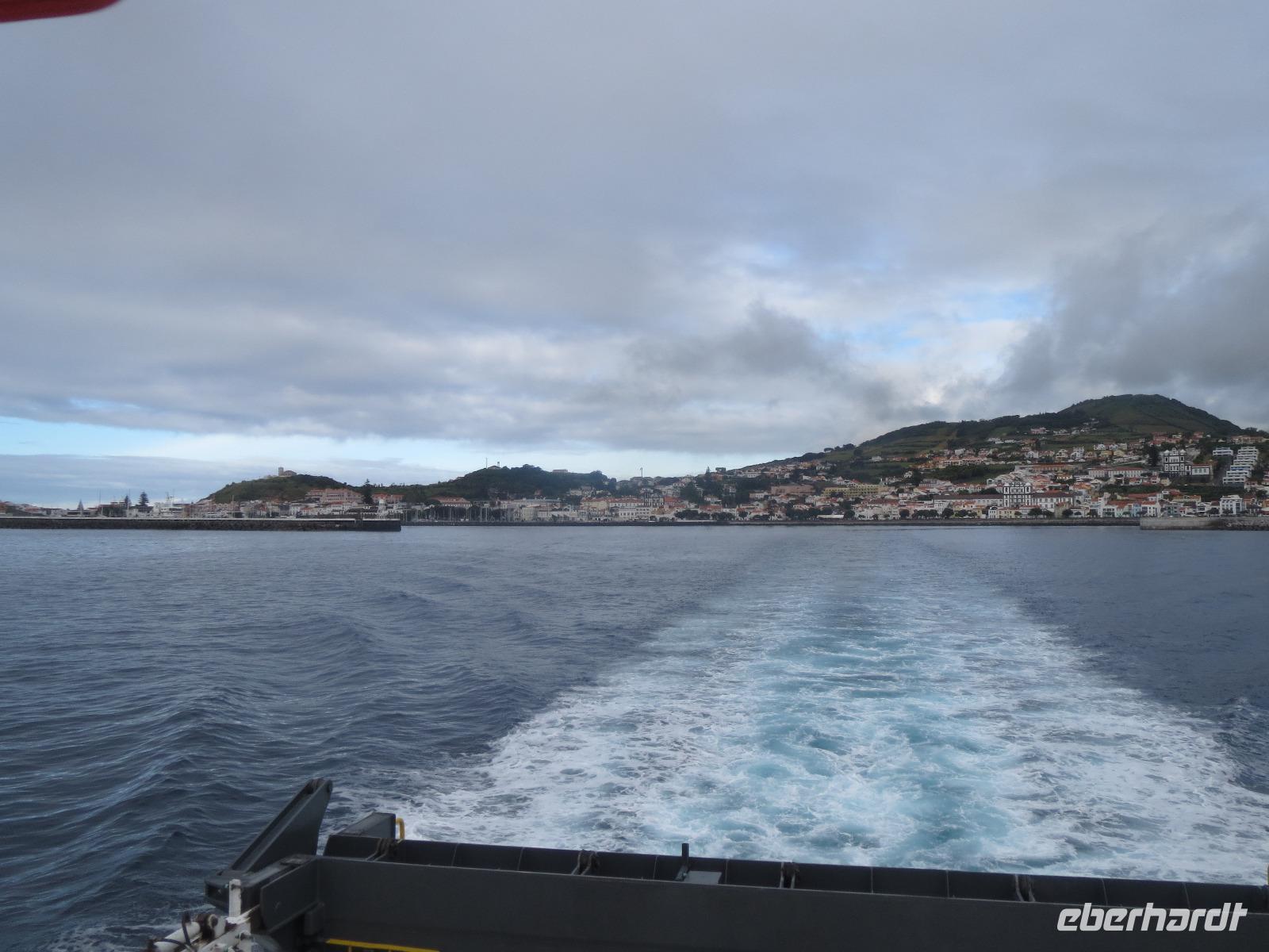Der Tag begann eher als geplant. Am gestrigen Abend hatte jeder Gast noch eine Nachricht auf das Zimmer bekommen. Die Fähre legt eine halbe Stunde eher ab. Die 6 km Überfahrt war trotz etwas Wind angenehm ruhig. Mit neuem Bus und unserem Busfahrer Lizuarte ging es zu den Unesco geschützten Weinfeldern entlang der Südküste. Bei einem Fotostopp konnten wir die kleinen in Steinmauern eingefassten Parzellen bestaunen. Ein kleiner Weg dadurch führte zu einer restaurierten Mühle, wo man Souvenirs erwerben konnte. Von dort aus fuhren wir zu einem 400 Jahre alten Zwillingsdrachenbaum. Lizuarte überraschte uns mit einer Wein-/Likör-Verkostung aus eigener Produktion in seiner Adega, welche sich gleich nebenan befand. Anschließend besuchten wir die Kirche von Sao Mateus im gleichnamigen Ort. In Lajes do Pico sahen wir uns das Walfangmuseum an. Über die nebelverhangene Hochebene ging es an die Nordküste. In Sao Roque do Pico genossen wir Eis und Kaffee am Meer. Auf dem Weg zur Fähre machten wir einen letzten Stopp im malerischen Küstenort Cachorro. Der Ort ist geprägt von Ferienhäusern und Adegas. Die zerklüftete Steilküste enthält kleinere Steinbrücken unter denen die Brandung hindurchströmt. Leider war uns der Blick auf den 2.351 Meter hohen Pico den ganzen Tag verwehrt. Ein Blick in Richtung Faial weckte in uns die Hoffnung bei der Fährüberfahrt vielleicht doch später noch einen Blick auf den Vulkan dos Capelinhos zu erhaschen.