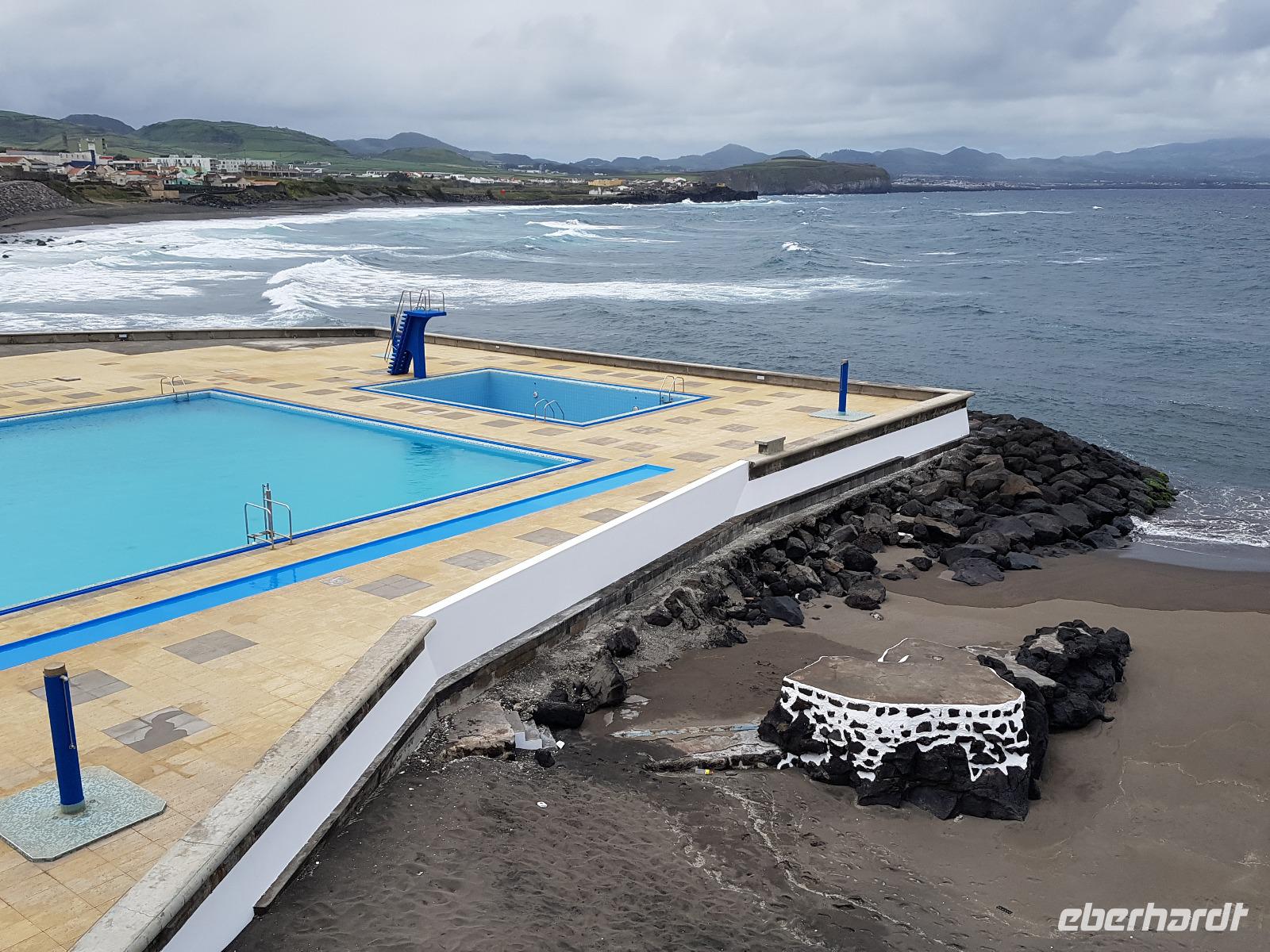 Delgada. Um 9 Uhr wartet auf uns der Busfahrer Jose. Wir machen einen ersten Stopp am Sandstrand von Ponta Delgada, von wo man einen tollen Blick auf die Stadt und den Hafen hat.