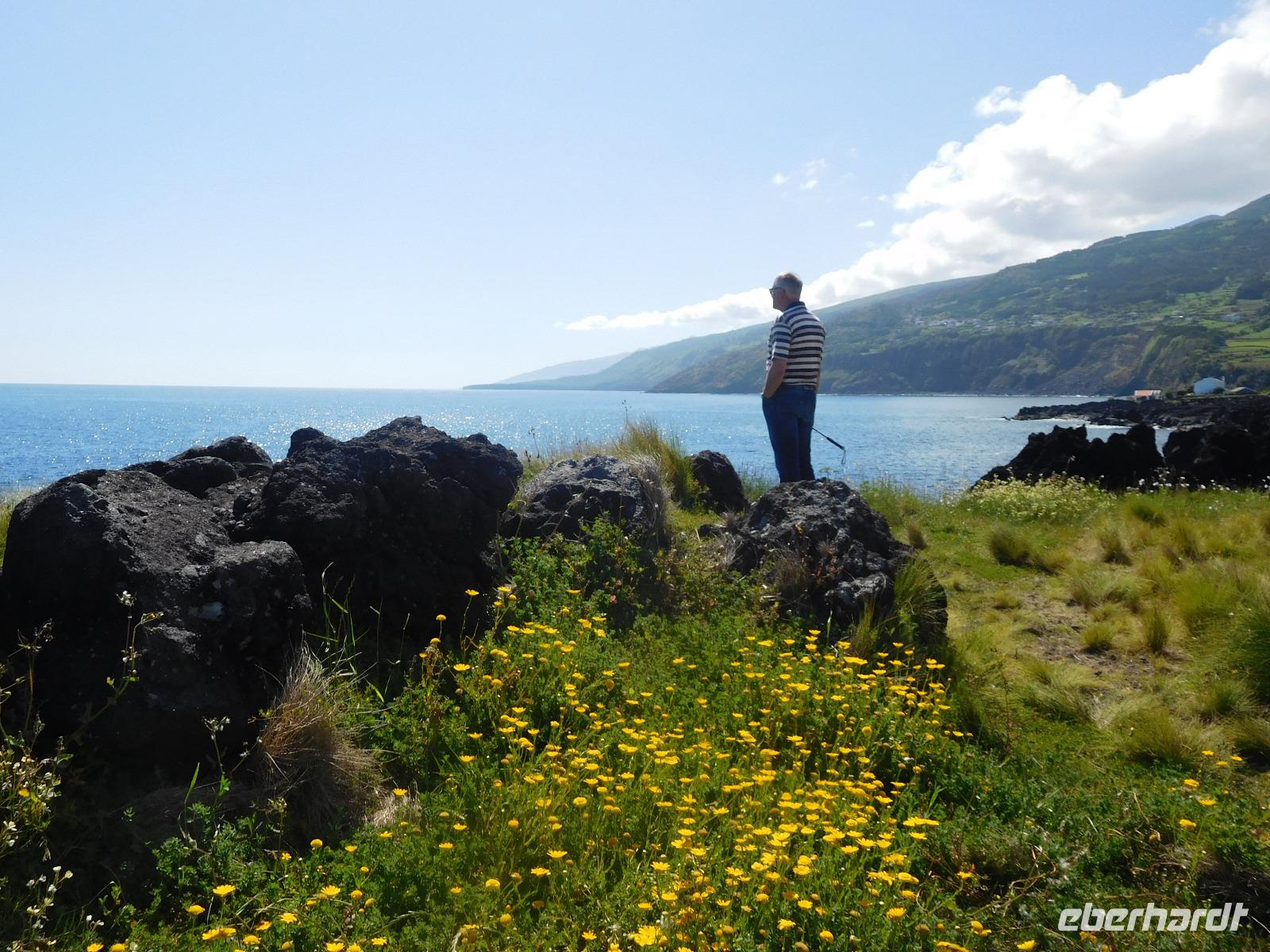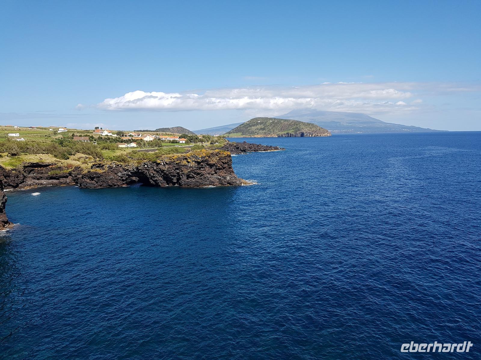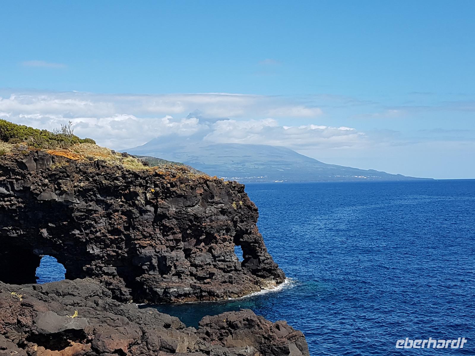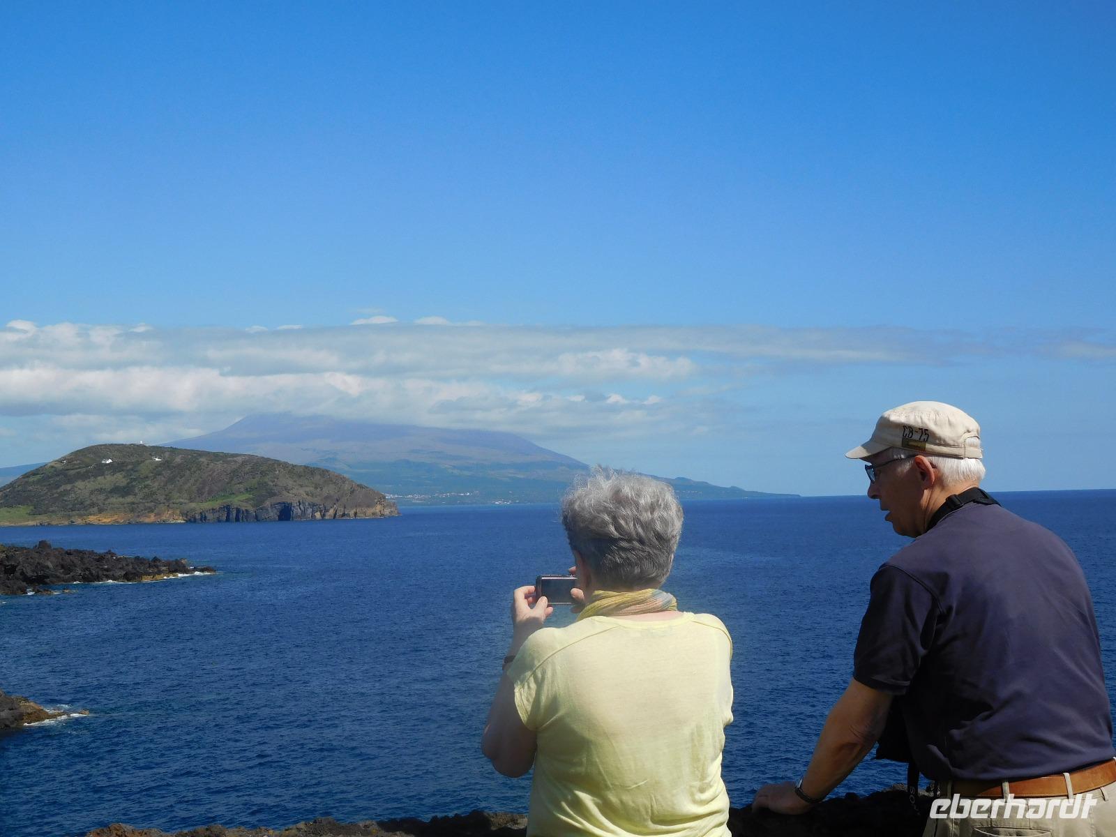 Zwischen Madalena und Calhau besuchen wir die alten, noch bewirtschafteten Weinanbaugebiete, welche seit 2004 zum Weltkulturerbe der UNESCO zählen. Diese Lavamauern mit den grünen Reben vor dem Blau des Ozeans und mit dem Vulkan ohne Wolken geben ein idyllisches Fotomotiv ab. Wir laufen bis zu einer Windmühle und sind überrascht, wie die Weinreben auf dem schwarzen Lavagestein wachsen können, ähnlich wie auf Lanzarote. Die Rundfahrt führt entlang der Nordküste, wo wir einen Aufenthalt im Winzerdorf Cachorro haben. Schön zu sehen, wie die Lava bis ans Meer trifft, zu hören, wie das Meer rauscht und mit der Lava zusammenstößt. Hier spazieren wir gemeinsam ans Meer und probieren verschiedene Liköre bei einer Verkostung. In Sao Roque machen wir eine Kaffeepause, da unser zeitiges Frühstück von 6.30 Uhr schon lange vorbei ist im Magen. Auf dem Weg zur Hochebene der Insel halten wir erstmal an um einen tollen Blick auf die Insel Sao Jorge zu bekommen. Oben angekommen, halten wir am Kapitan See. Hier hat man einen