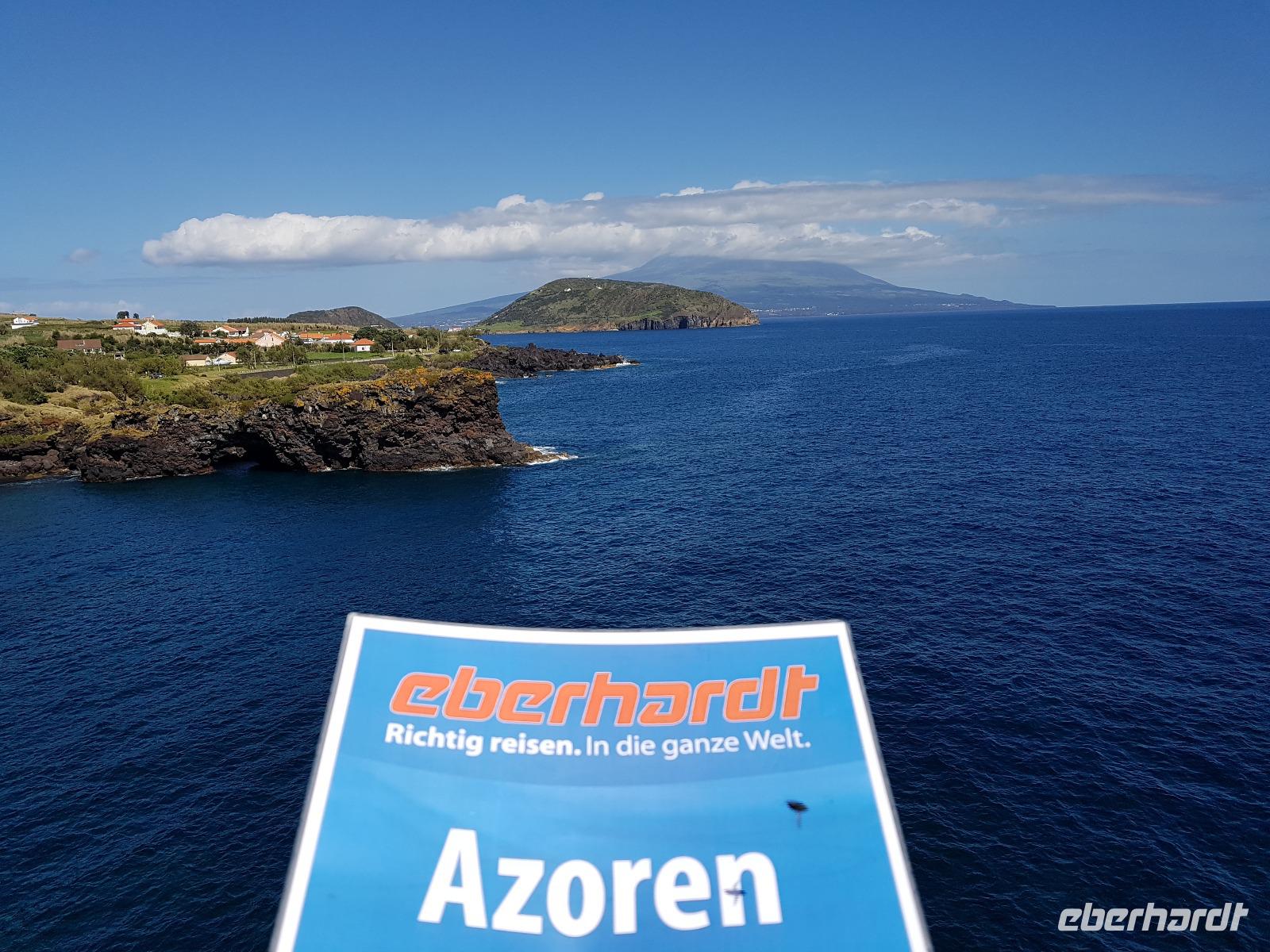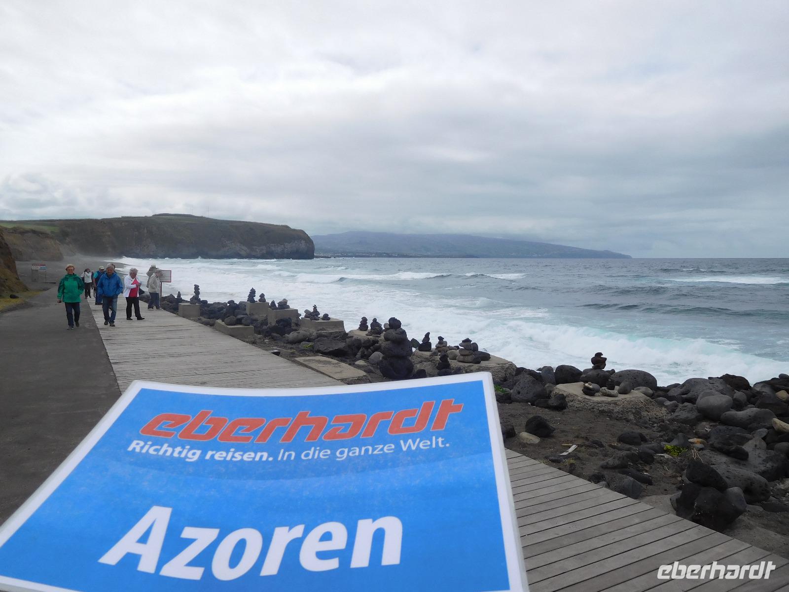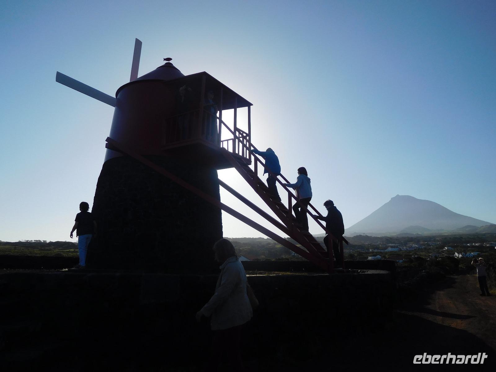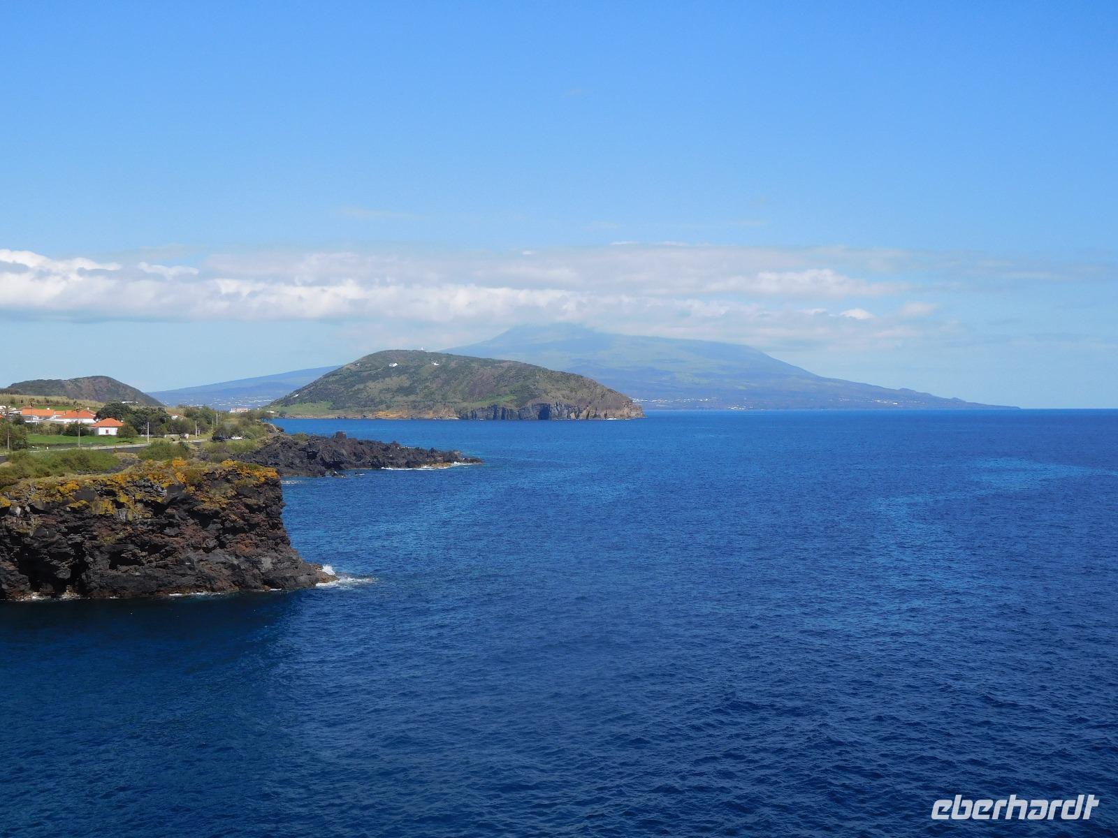Zwischen Madalena und Calhau besuchen wir die alten, noch bewirtschafteten Weinanbaugebiete, welche seit 2004 zum Weltkulturerbe der UNESCO zählen. Diese Lavamauern mit den grünen Reben vor dem Blau des Ozeans und mit dem Vulkan ohne Wolken geben ein idyllisches Fotomotiv ab. Wir laufen bis zu einer Windmühle und sind überrascht, wie die Weinreben auf dem schwarzen Lavagestein wachsen können, ähnlich wie auf Lanzarote. Die Rundfahrt führt entlang der Nordküste, wo wir einen Aufenthalt im Winzerdorf Cachorro haben. Schön zu sehen, wie die Lava bis ans Meer trifft, zu hören, wie das Meer rauscht und mit der Lava zusammenstößt. Hier spazieren wir gemeinsam ans Meer und probieren verschiedene Liköre bei einer Verkostung. In Sao Roque machen wir eine Kaffeepause, da unser zeitiges Frühstück von 6.30 Uhr schon lange vorbei ist im Magen. Auf dem Weg zur Hochebene der Insel halten wir erstmal an um einen tollen Blick auf die Insel Sao Jorge zu bekommen. Oben angekommen, halten wir am Kapitan See. Hier hat man einen