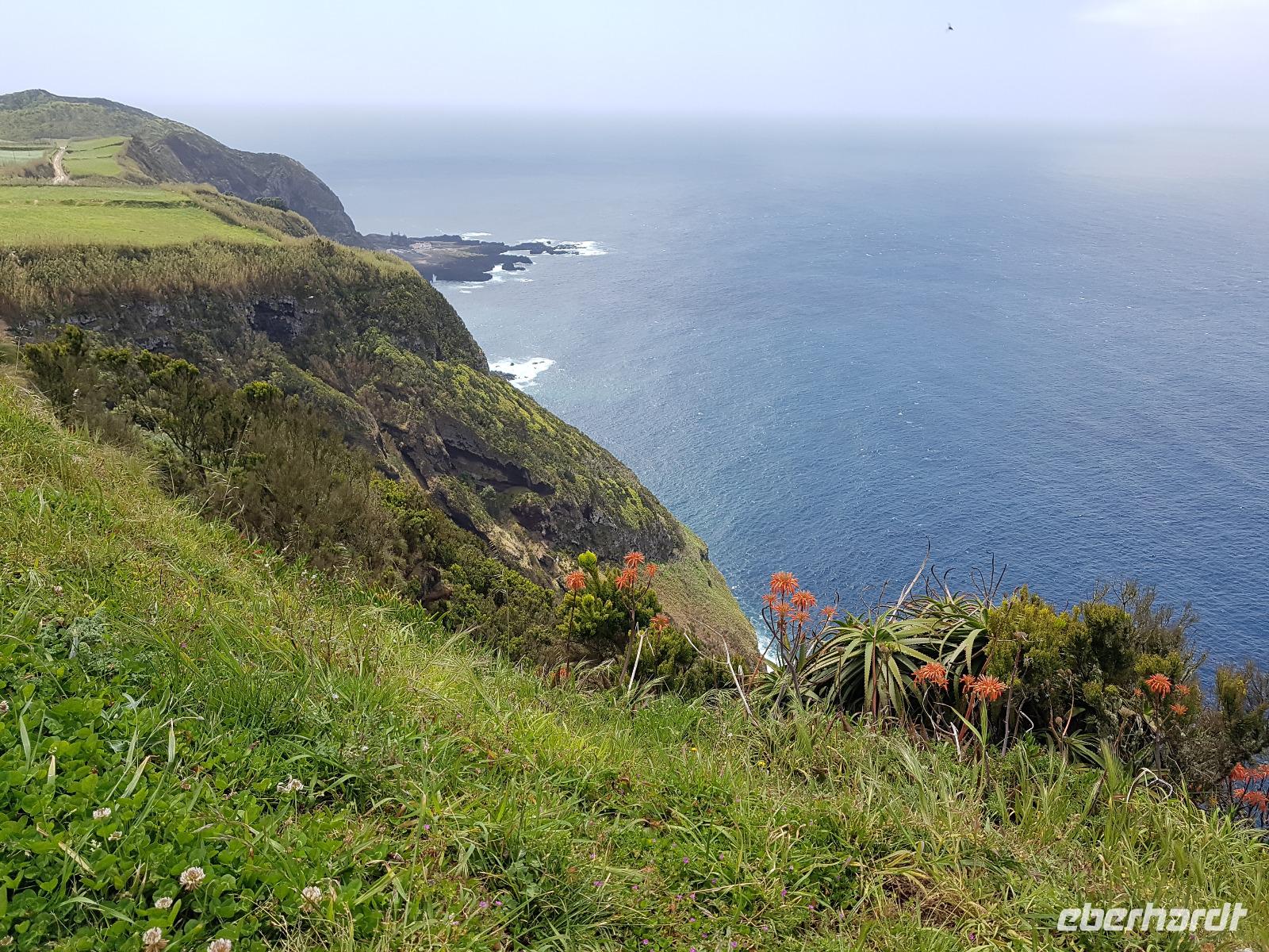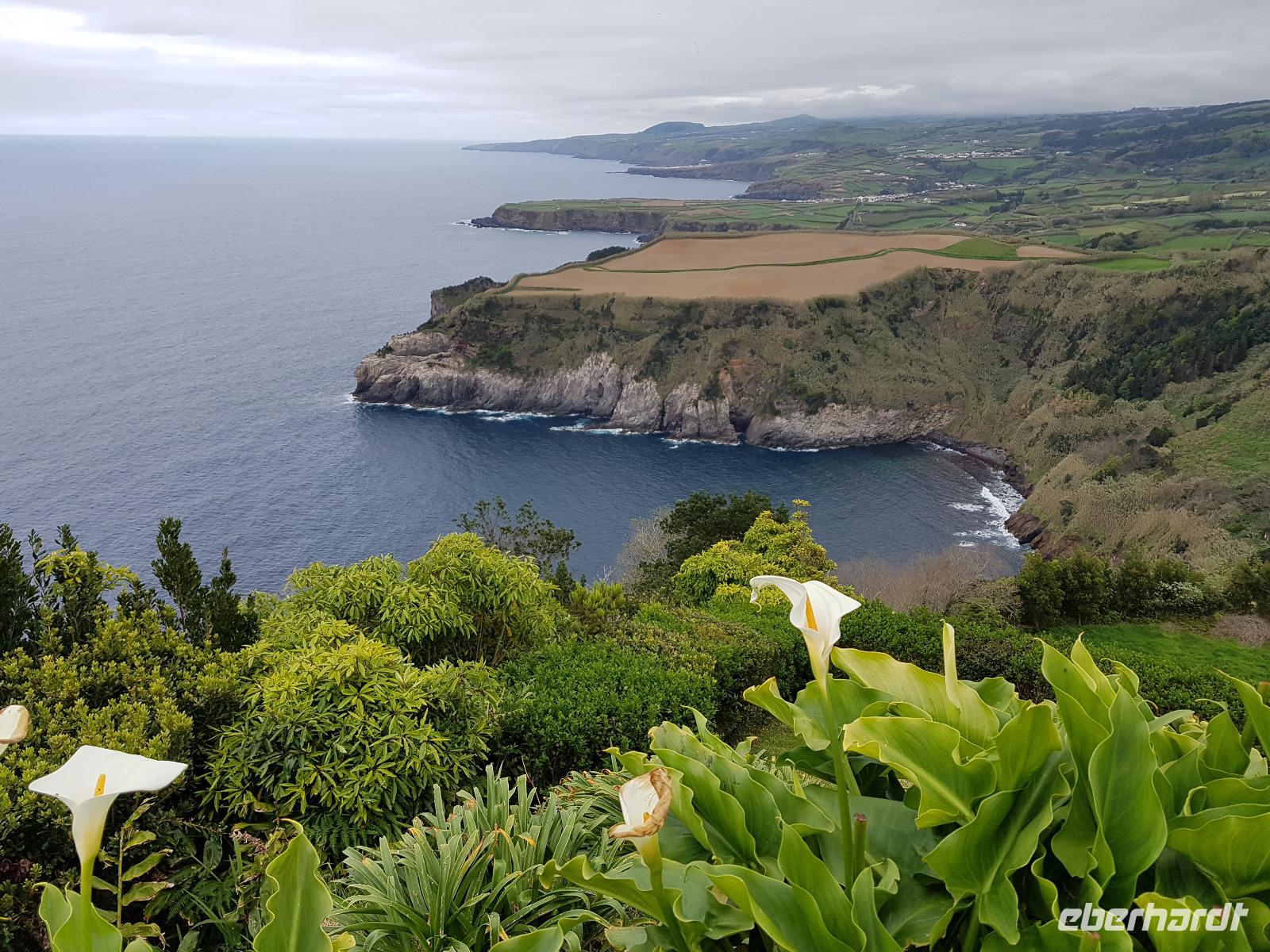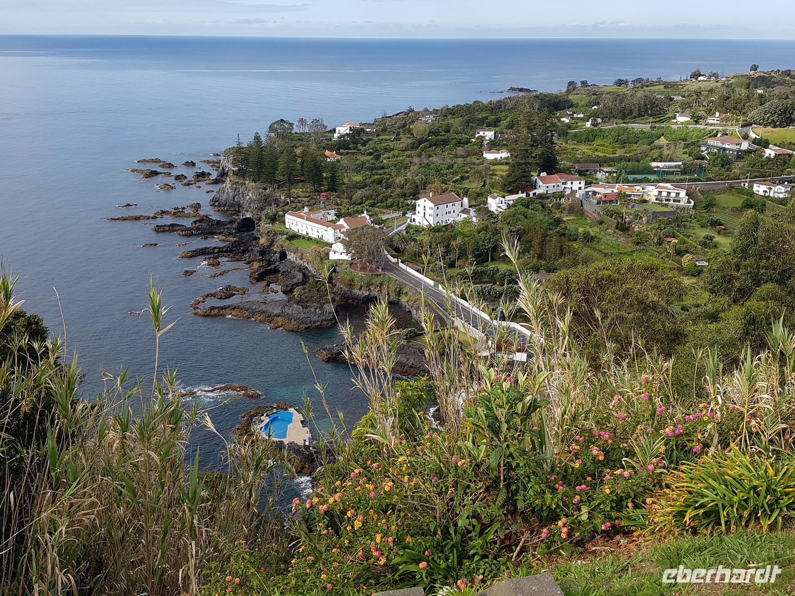 Im Gegenteil zu gestern scheint heute die Sonne herrlich schon früh am Morgen. Eine Kreuzfahrt führt zum Hafen und nach einem wieder sehr guten Frühstück reisen wir von Ponta Delgada an der Südküste entlang nach Vila Franca do Campo, der ersten Hauptstadt dieser Insel. Davor aber halten wir beim Mirador do Pisao-Aussichtspunkt mit einem traumhaften Ausblick auf ein Kloster, eine Festung und das ewige blaue Meer.