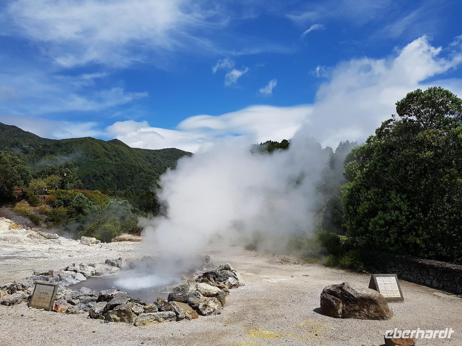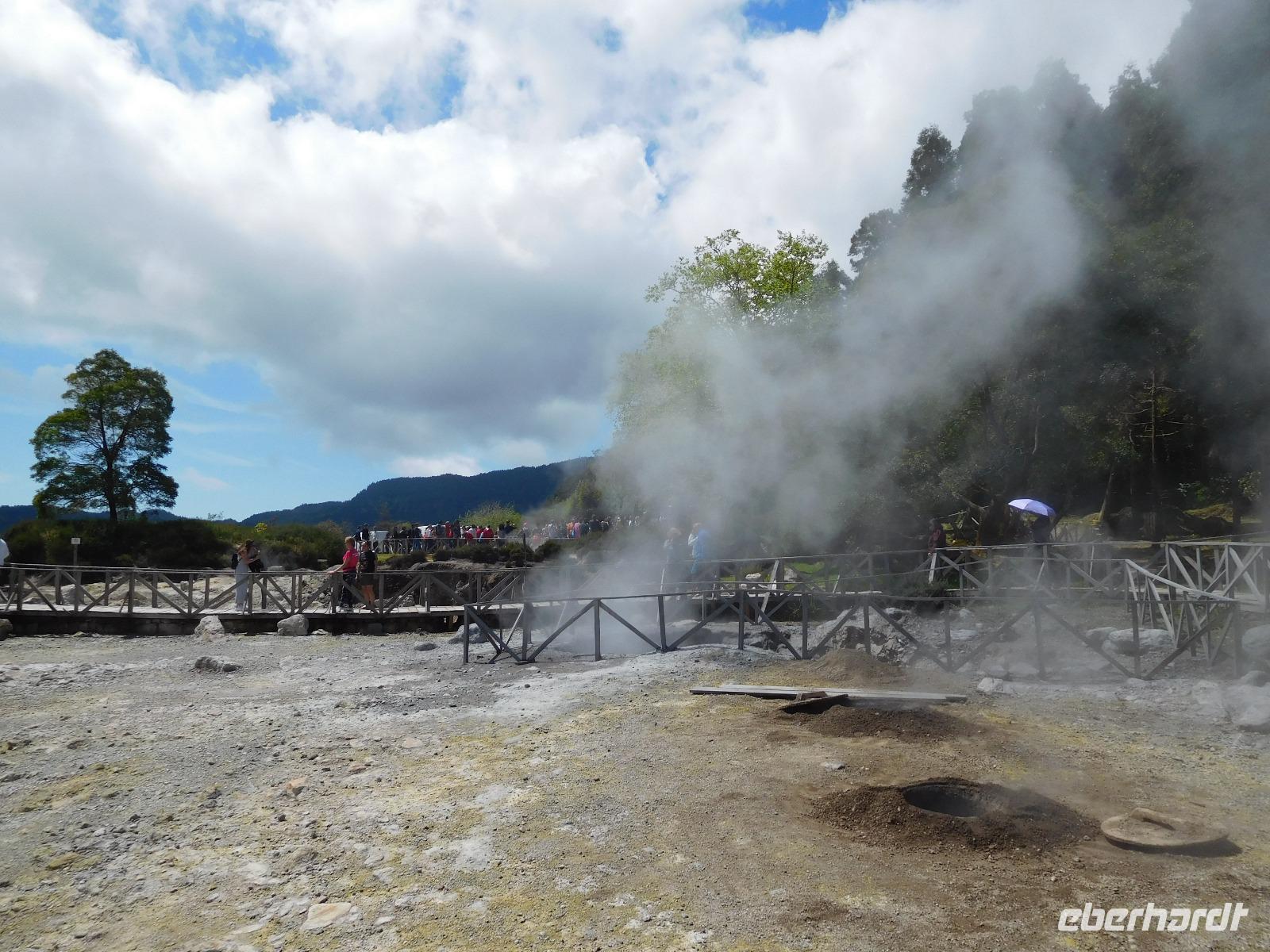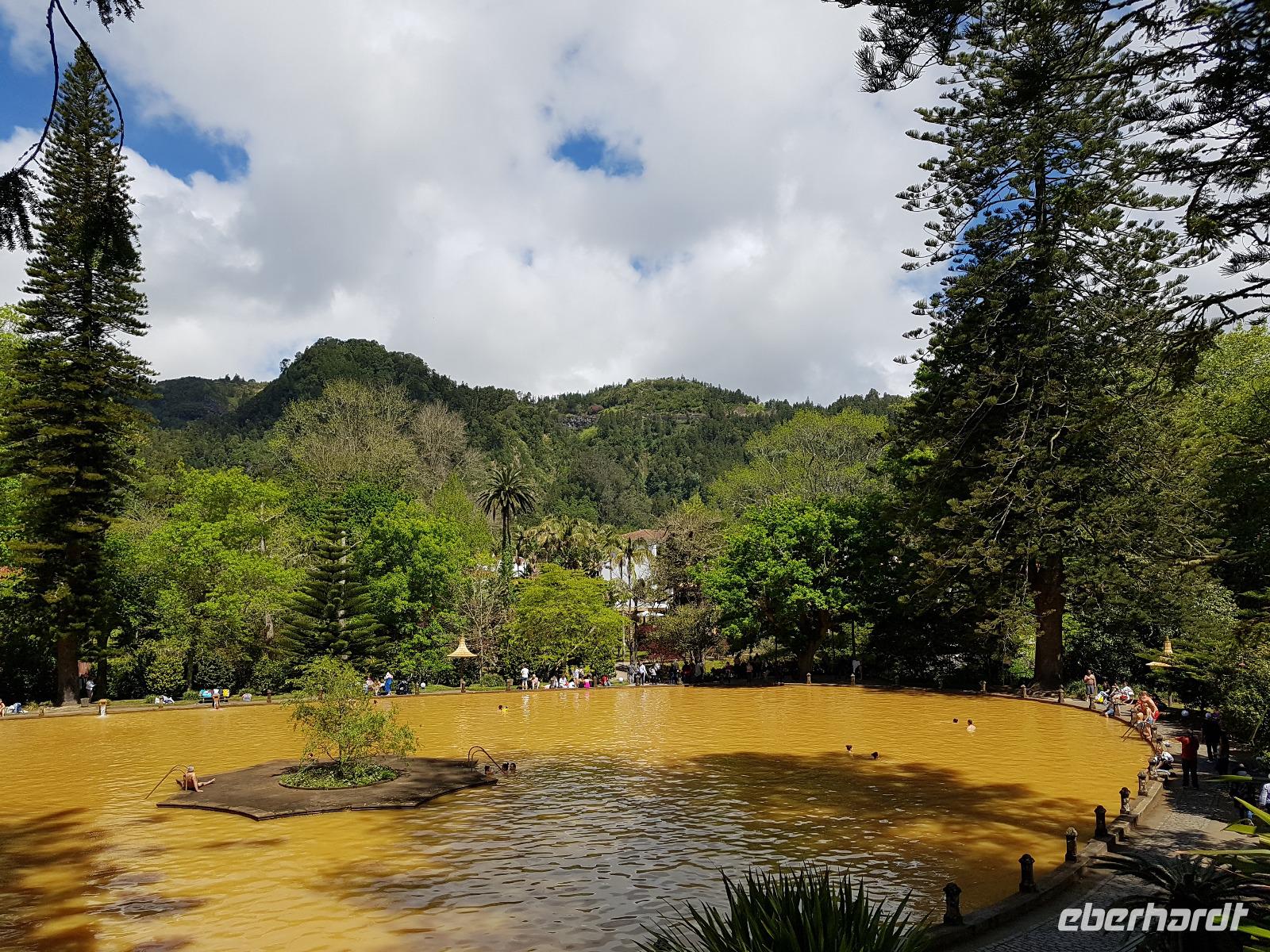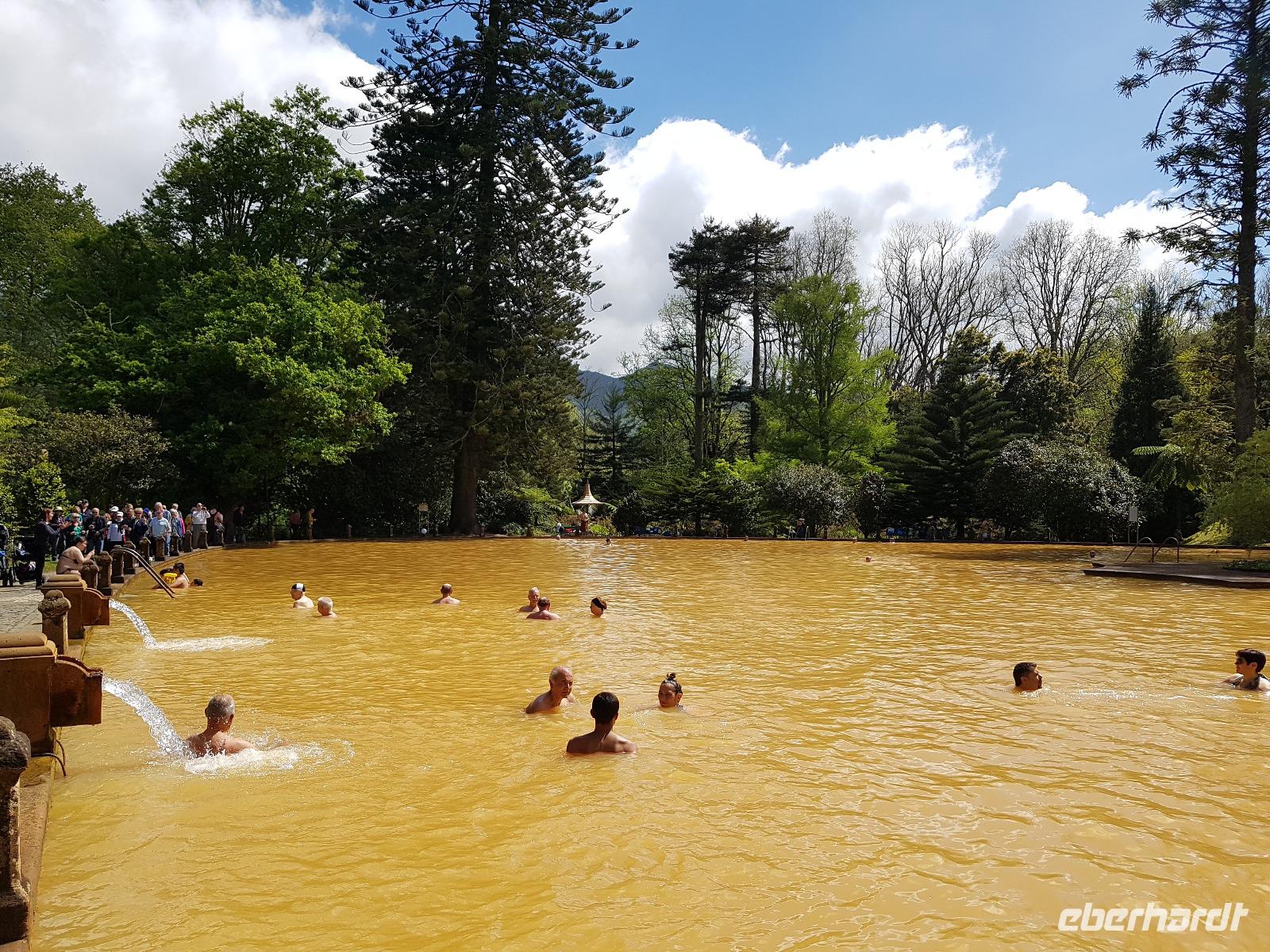 Die ockergelbe Färbung des Thermalbeckens hat uns nicht abgeschreckt, einen Schritt ins warme Nass zu wagen. Hier in Furnas gibt es überall heiße Quellen. Ihre Temperaturen sind so hoch, dass man darin einfach kochen kann, ohne Strom zu bezahlen. Mutter Erde macht alles. So wird am Rande von Lagoa das Furnas See der leckere Cozido des Furnas zubereitet. Es handelt sich um eine Art Eintopf mit verschiedenem Fleisch und Gemüse, welcher sechs Stunden lang in Erdlöchern gekocht wird.
