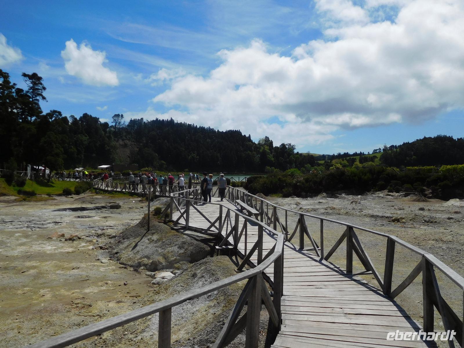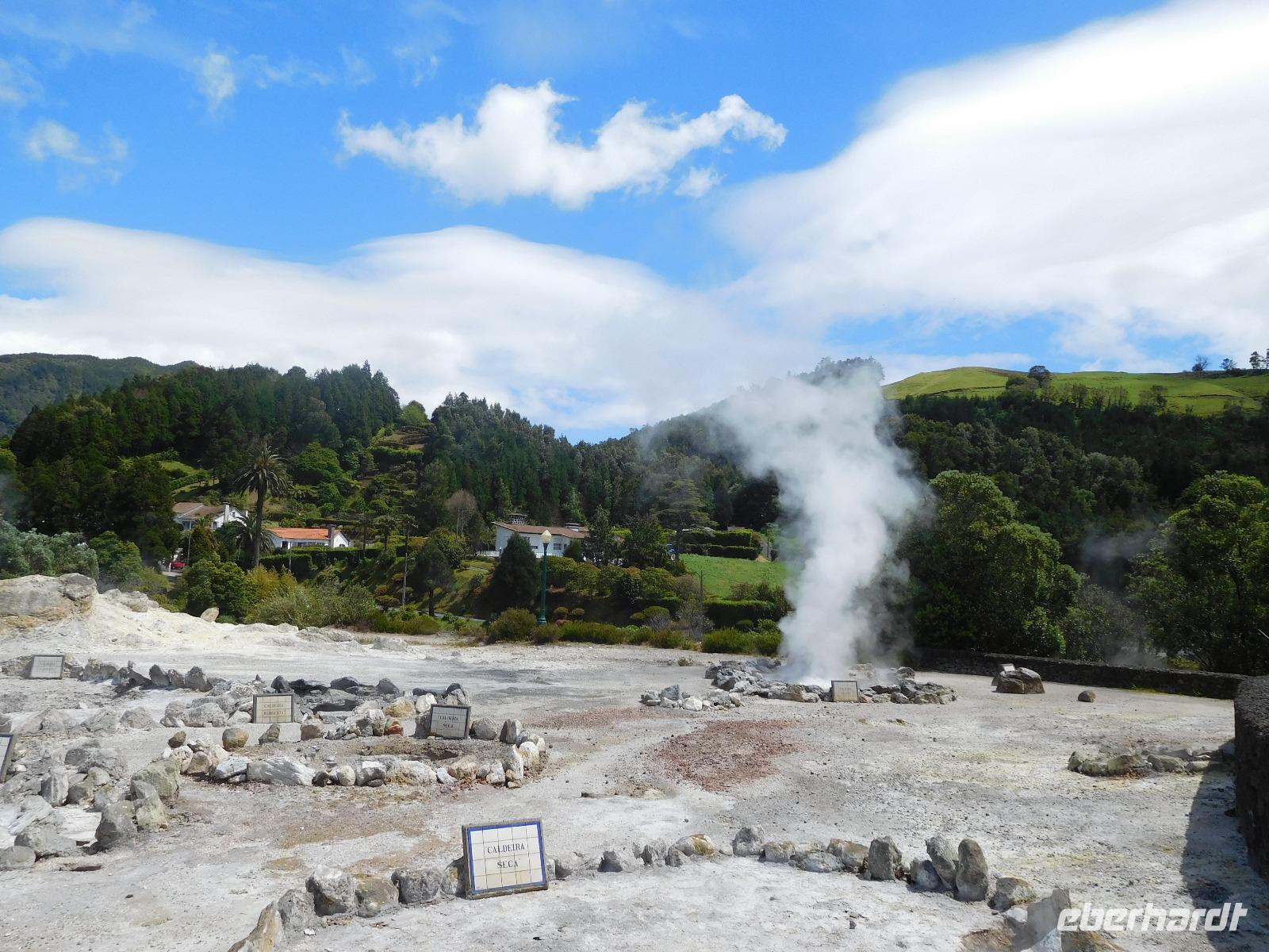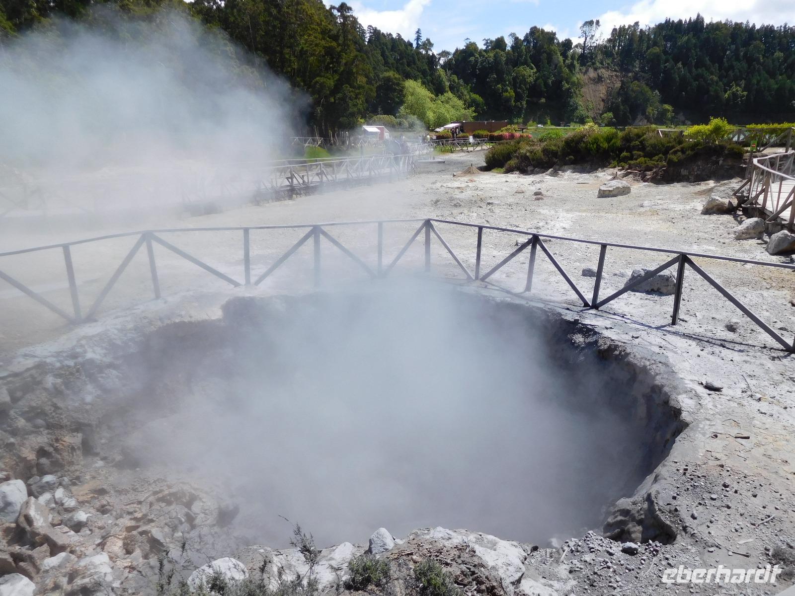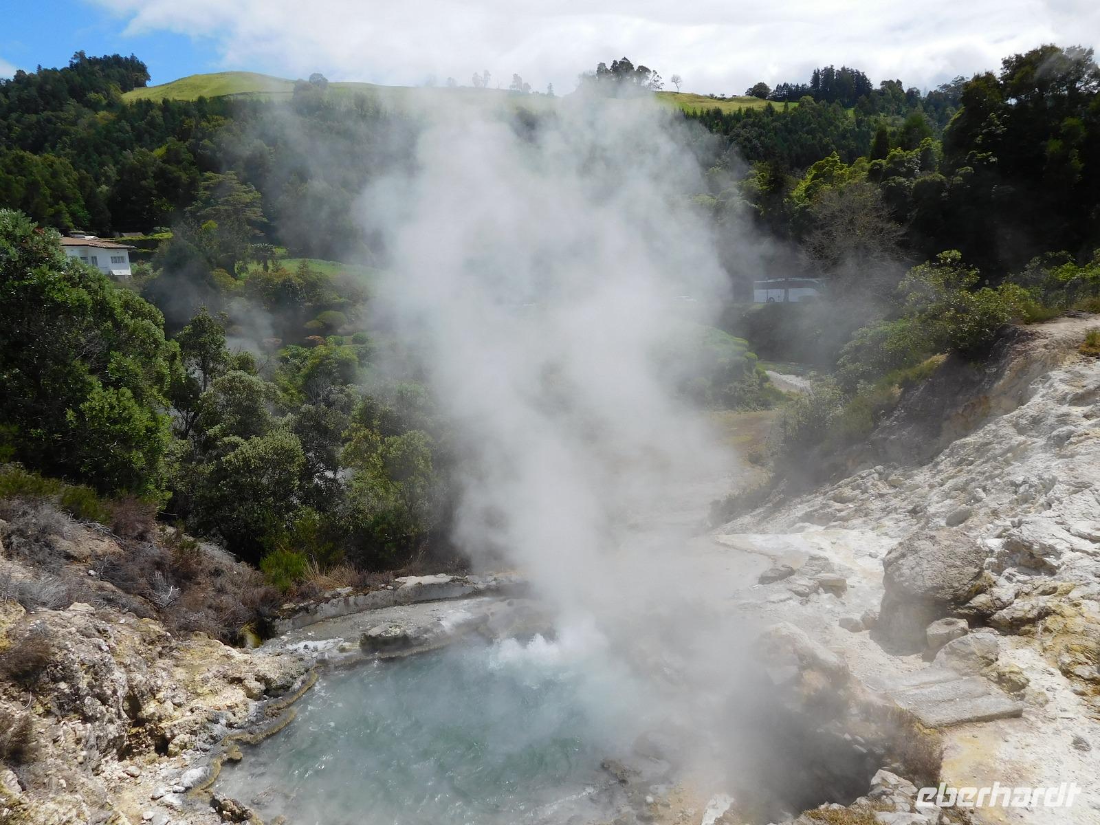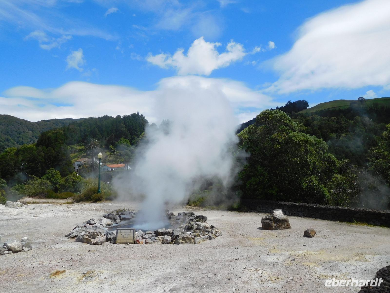 Die ockergelbe Färbung des Thermalbeckens hat uns nicht abgeschreckt, einen Schritt ins warme Nass zu wagen. Hier in Furnas gibt es überall heiße Quellen. Ihre Temperaturen sind so hoch, dass man darin einfach kochen kann, ohne Strom zu bezahlen. Mutter Erde macht alles. So wird am Rande von Lagoa das Furnas See der leckere Cozido des Furnas zubereitet. Es handelt sich um eine Art Eintopf mit verschiedenem Fleisch und Gemüse, welcher sechs Stunden lang in Erdlöchern gekocht wird.